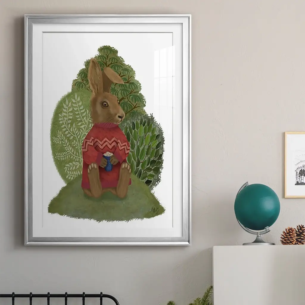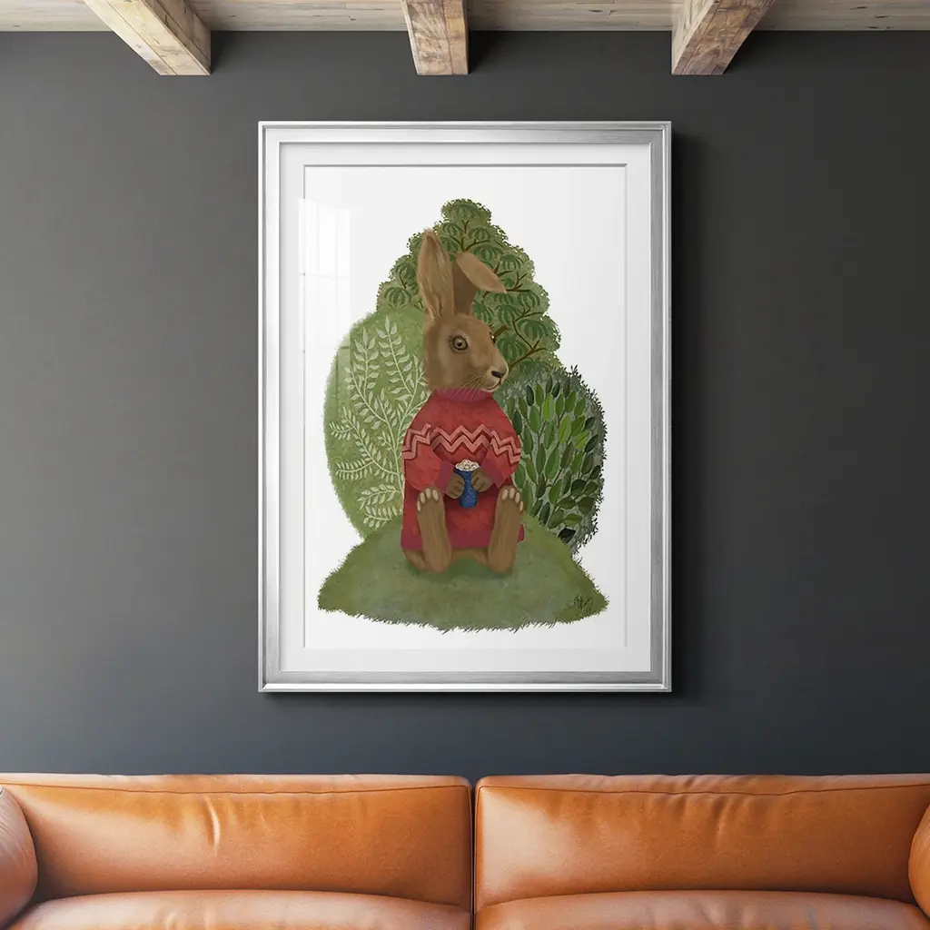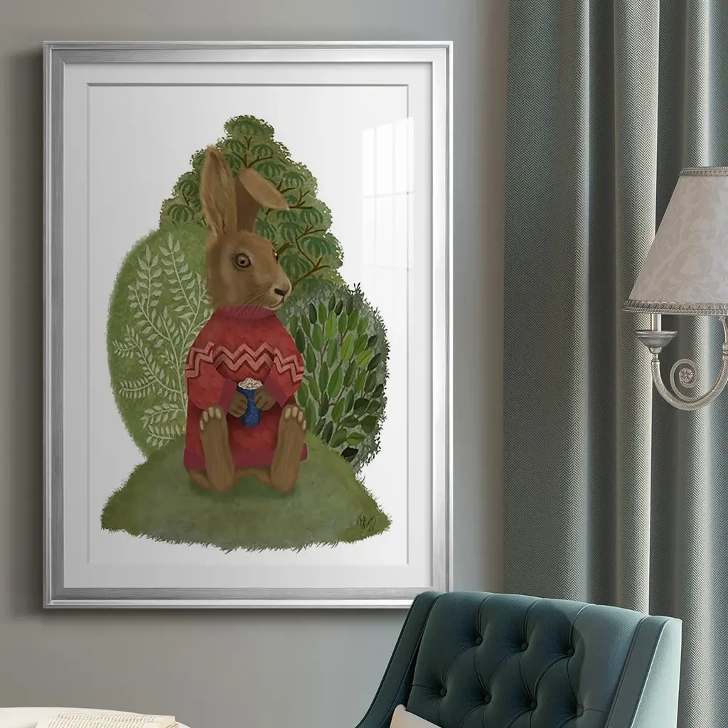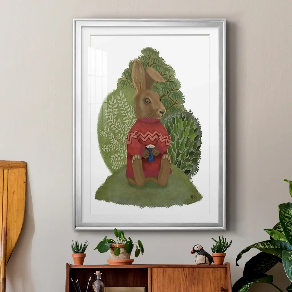 Latte Rabbit in Sweater Premium Framed Print - Ready to Hang A Premium Framed Print created to last. Framed in distressed wood and available in an array of sizes and colors Featuring a beveled a solid wood stretcher bar, each piece comes ready to hand 4 SIZES AVAILABLE 30.5''X42.5'' - Overall Size 26.5'X36.5'' - Overall Size 22.5''x30.5'' - Overall Size 18.5''x24.5'' - Overall Size Each piece is made to order. Each piece comes with hanging hardware. Made in the USA Ready to Hang Giclee Paper Print Acrylic Glass Beveled Matt Board