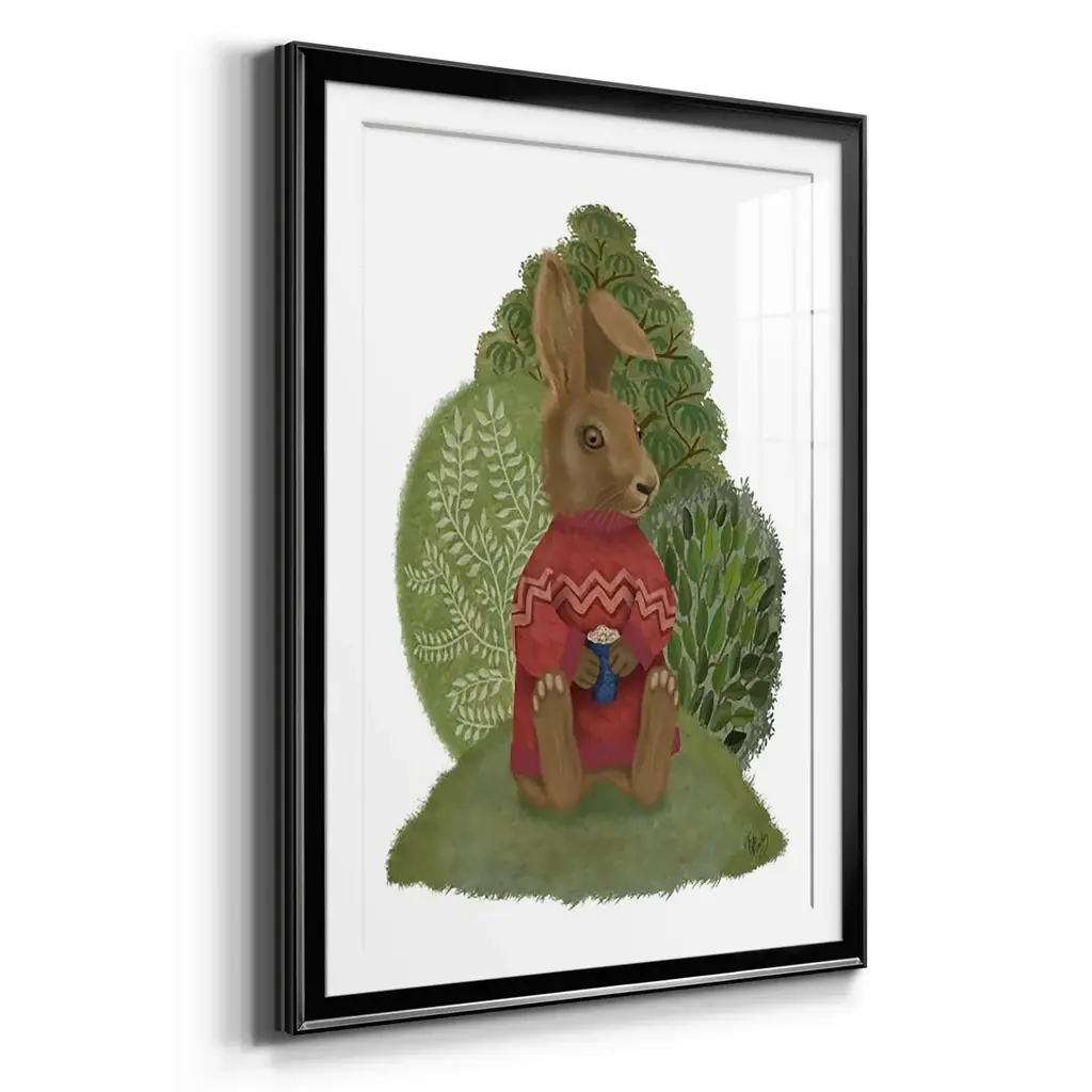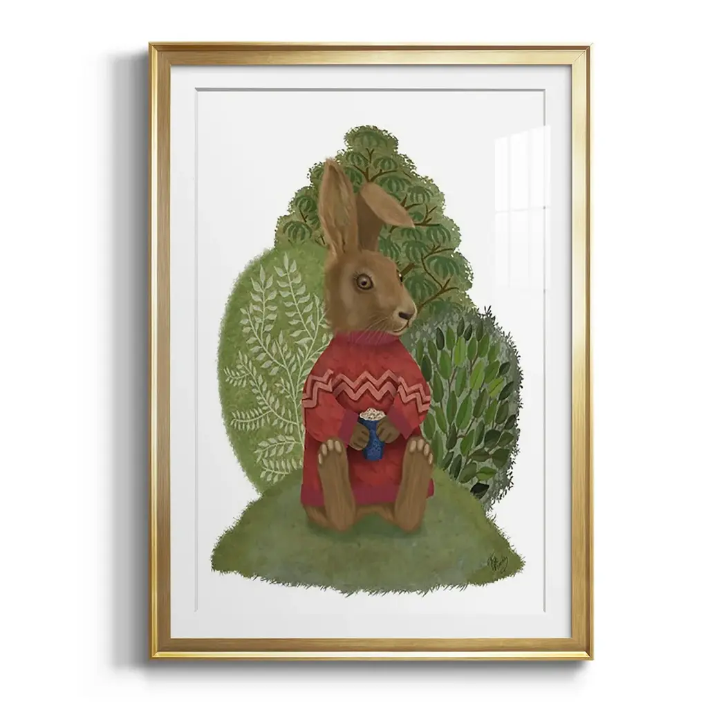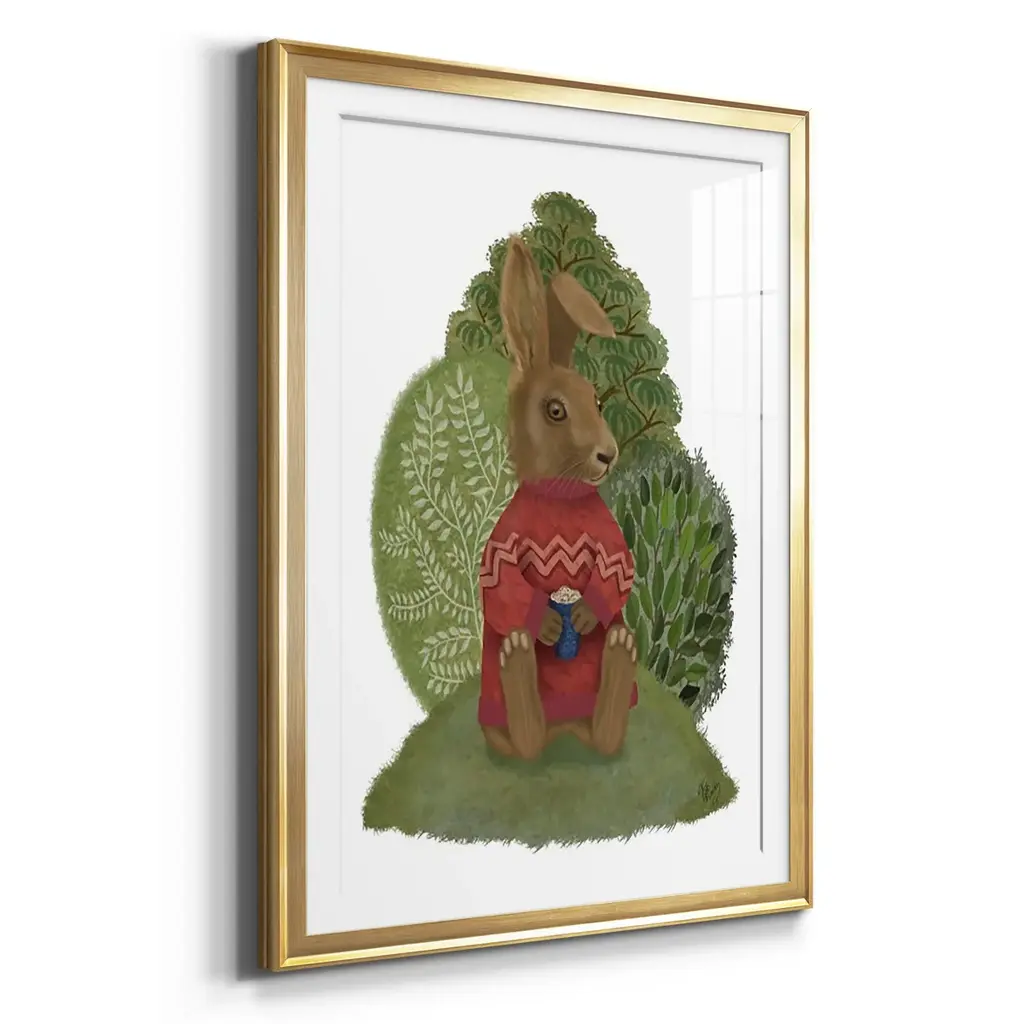 Latte Rabbit in Sweater Premium Framed Print - Ready to Hang A Premium Framed Print created to last. Framed in distressed wood and available in an array of sizes and colors Featuring a beveled a solid wood stretcher bar, each piece comes ready to hand 4 SIZES AVAILABLE 30.5''X42.5'' - Overall Size 26.5'X36.5'' - Overall Size 22.5''x30.5'' - Overall Size 18.5''x24.5'' - Overall Size Each piece is made to order. Each piece comes with hanging hardware. Made in the USA Ready to Hang Giclee Paper Print Acrylic Glass Beveled Matt Board