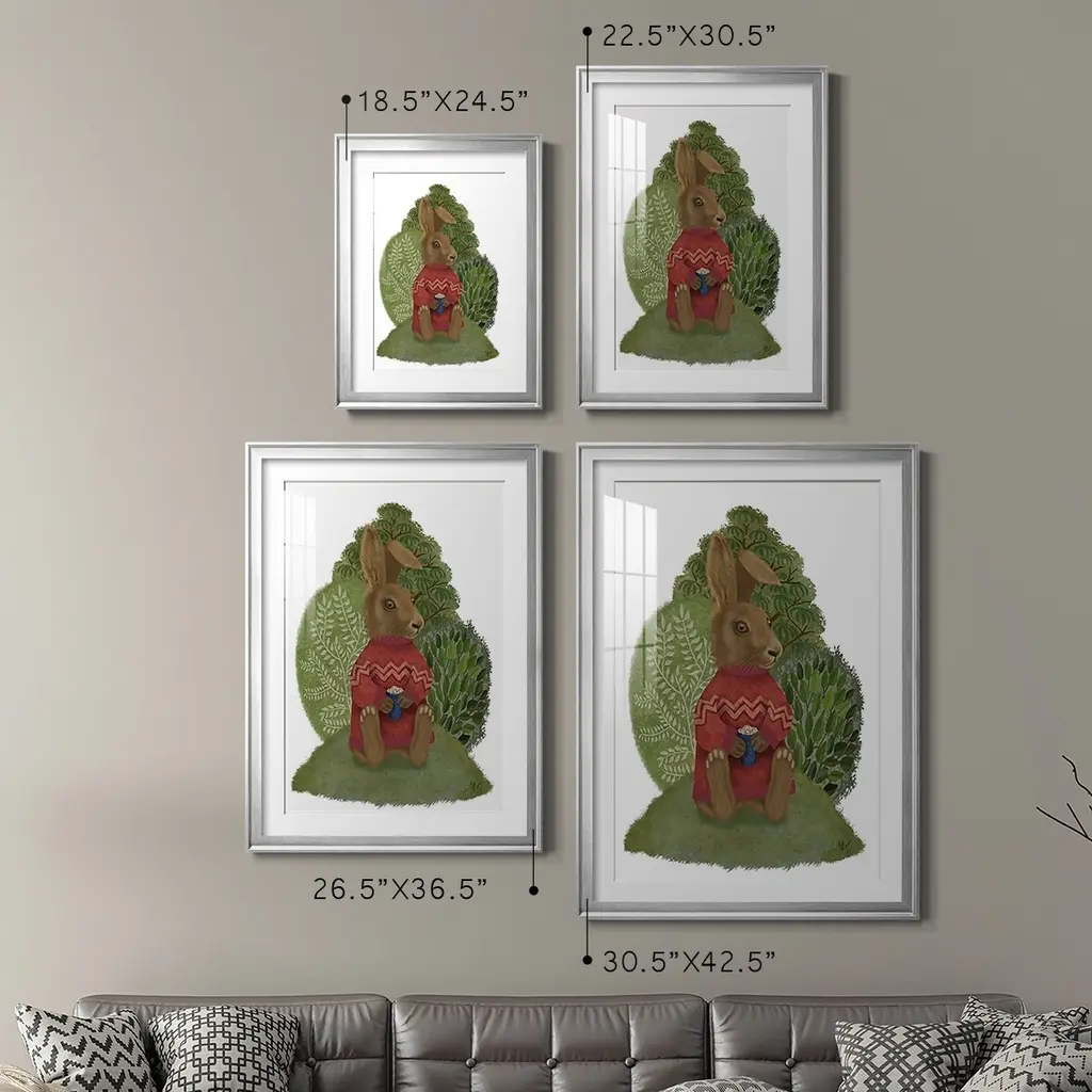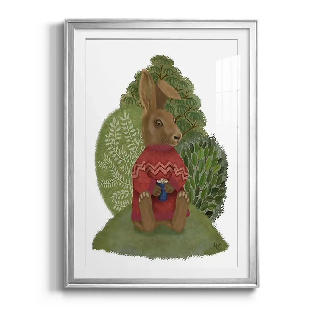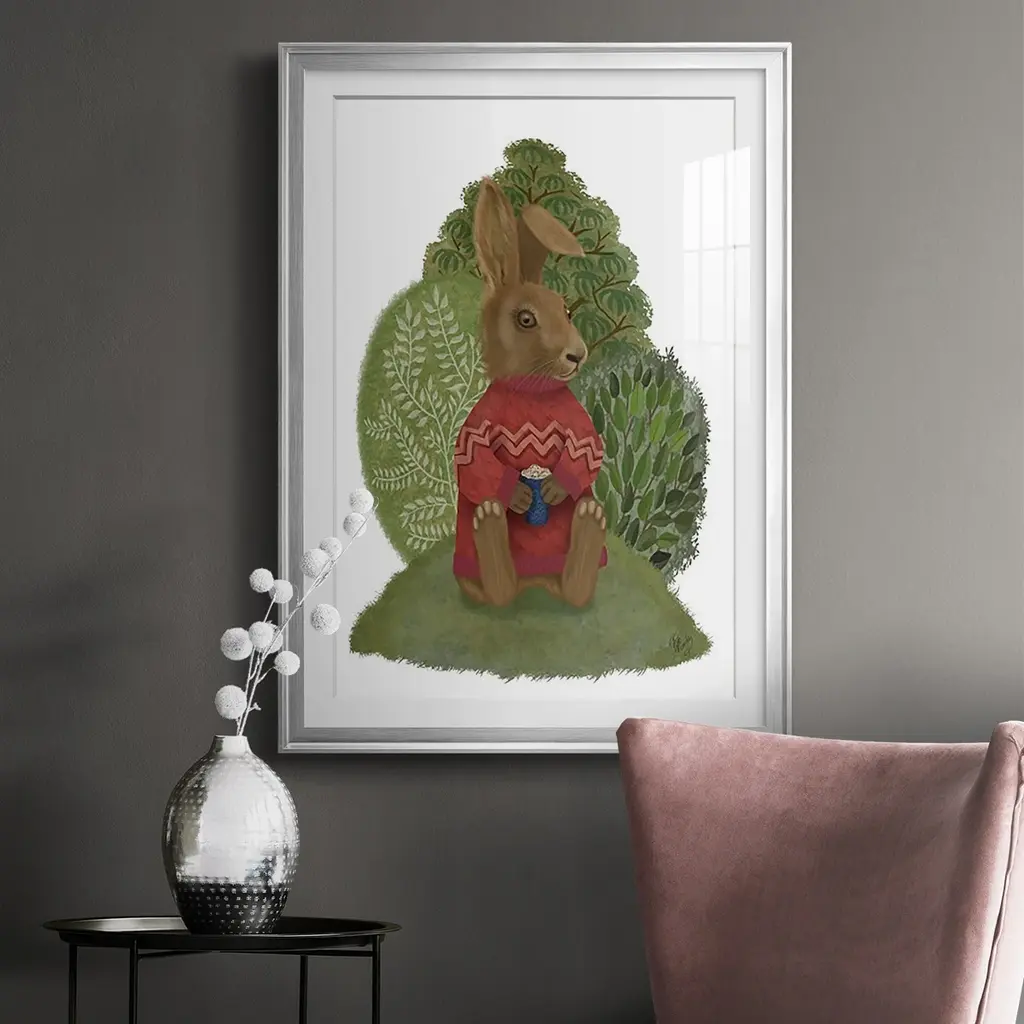 Latte Rabbit in Sweater Premium Framed Print - Ready to Hang A Premium Framed Print created to last. Framed in distressed wood and available in an array of sizes and colors Featuring a beveled a solid wood stretcher bar, each piece comes ready to hand 4 SIZES AVAILABLE 30.5''X42.5'' - Overall Size 26.5'X36.5'' - Overall Size 22.5''x30.5'' - Overall Size 18.5''x24.5'' - Overall Size Each piece is made to order. Each piece comes with hanging hardware. Made in the USA Ready to Hang Giclee Paper Print Acrylic Glass Beveled Matt Board