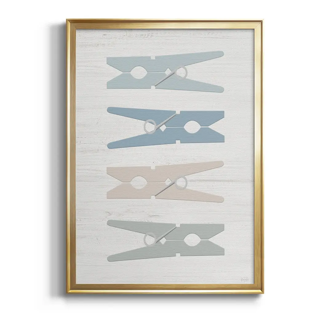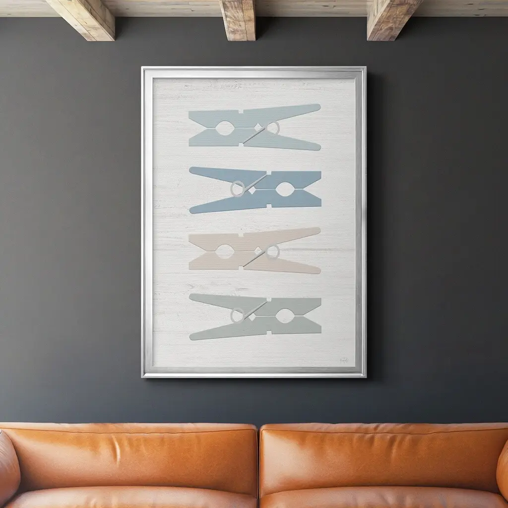 Laundry Pins Premium Framed Print - Ready to Hang A Premium Framed Print created to last. Framed in distressed wood and available in an array of sizes and colors Featuring a beveled a solid wood stretcher bar, each piece comes ready to hand 4 SIZES AVAILABLE 30.5''X42.5'' - Overall Size 26.5'X36.5'' - Overall Size 22.5''x30.5'' - Overall Size 18.5''x24.5'' - Overall Size Each piece is made to order. Each piece comes with hanging hardware. Made in the USA Ready to Hang