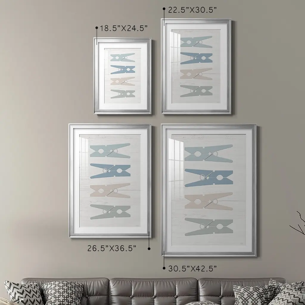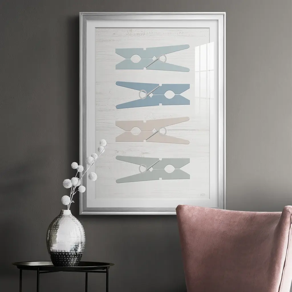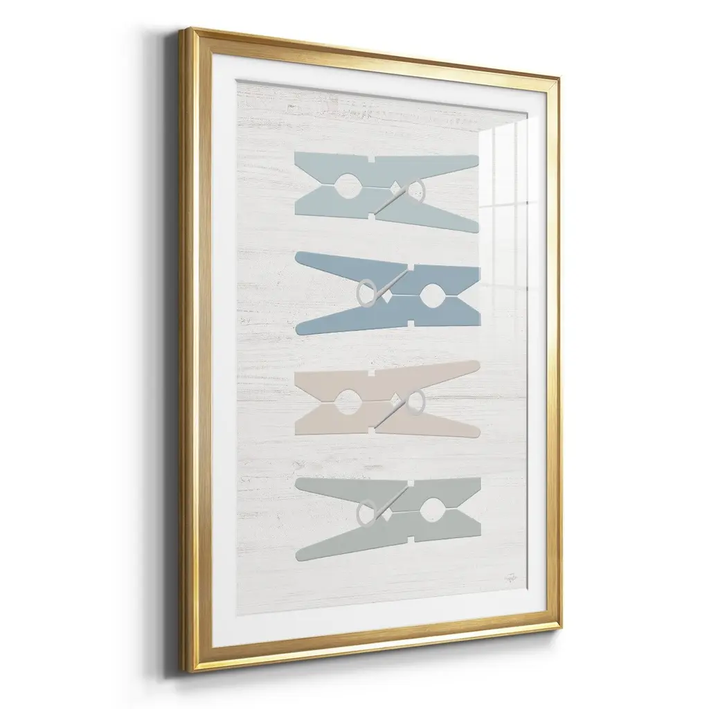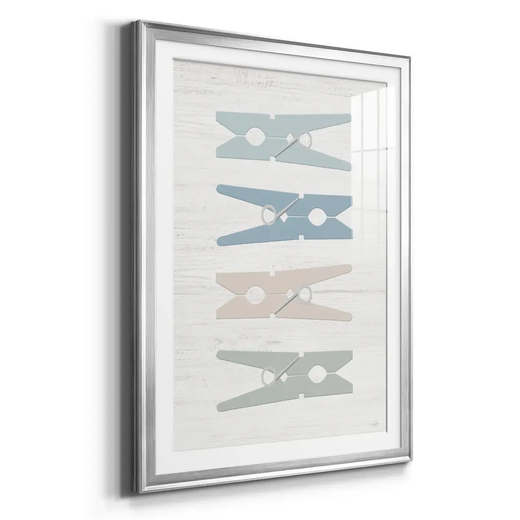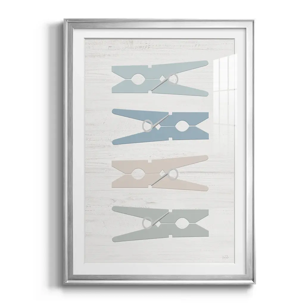 Laundry Pins Premium Framed Print - Ready to Hang A Premium Framed Print created to last. Framed in distressed wood and available in an array of sizes and colors Featuring a beveled a solid wood stretcher bar, each piece comes ready to hand 4 SIZES AVAILABLE 30.5''X42.5'' - Overall Size 26.5'X36.5'' - Overall Size 22.5''x30.5'' - Overall Size 18.5''x24.5'' - Overall Size Each piece is made to order. Each piece comes with hanging hardware. Made in the USA Ready to Hang Giclee Paper Print Acrylic Glass Beveled Matt Board