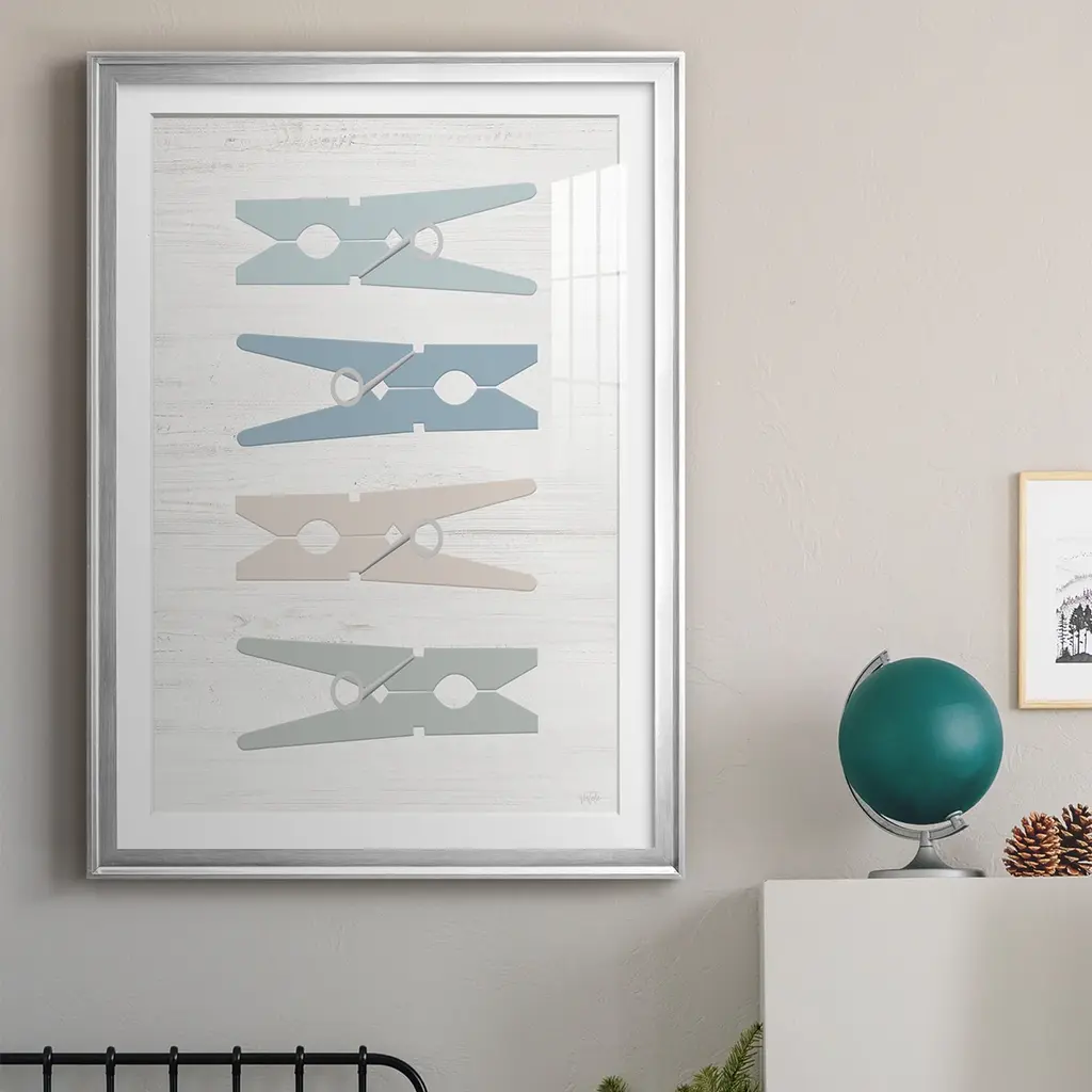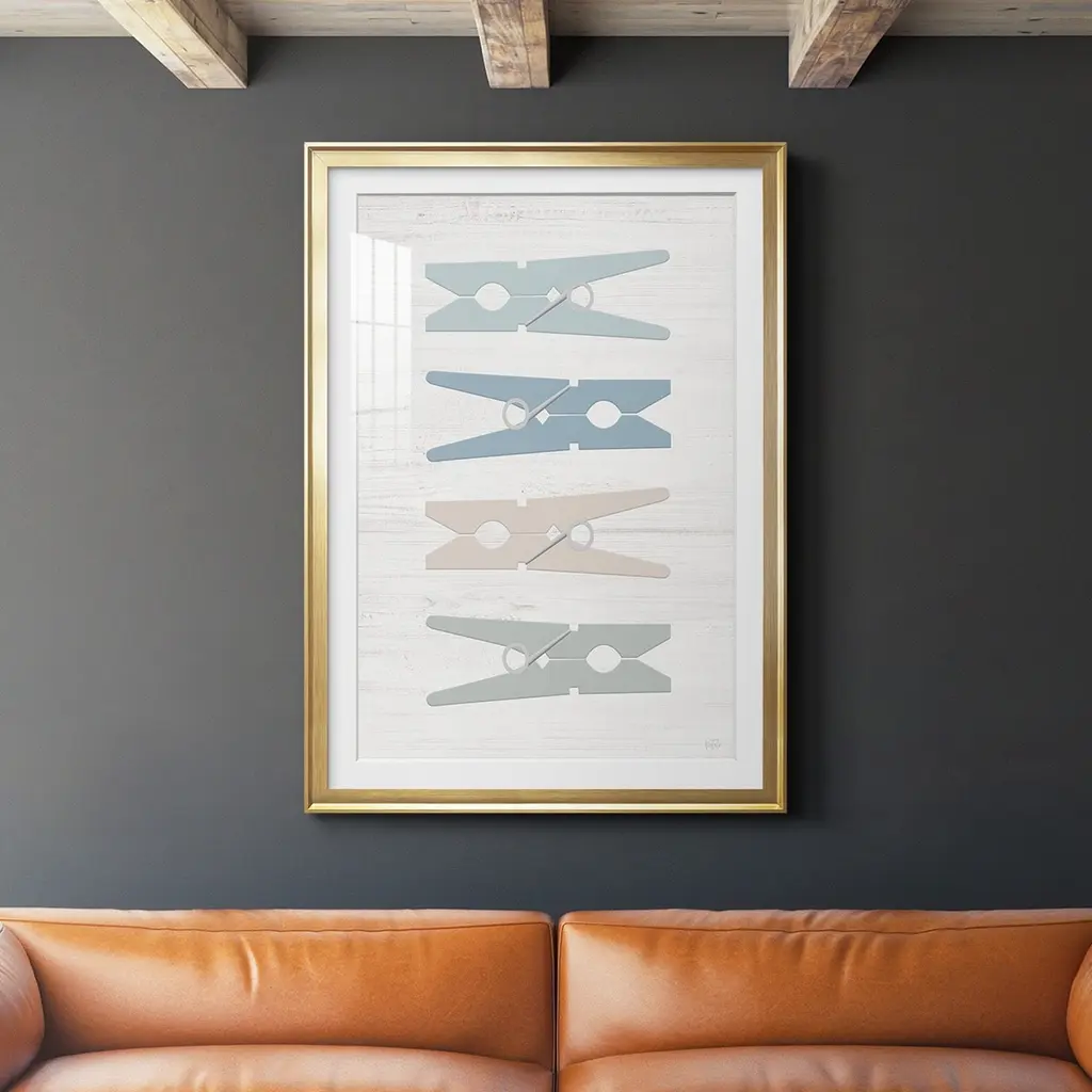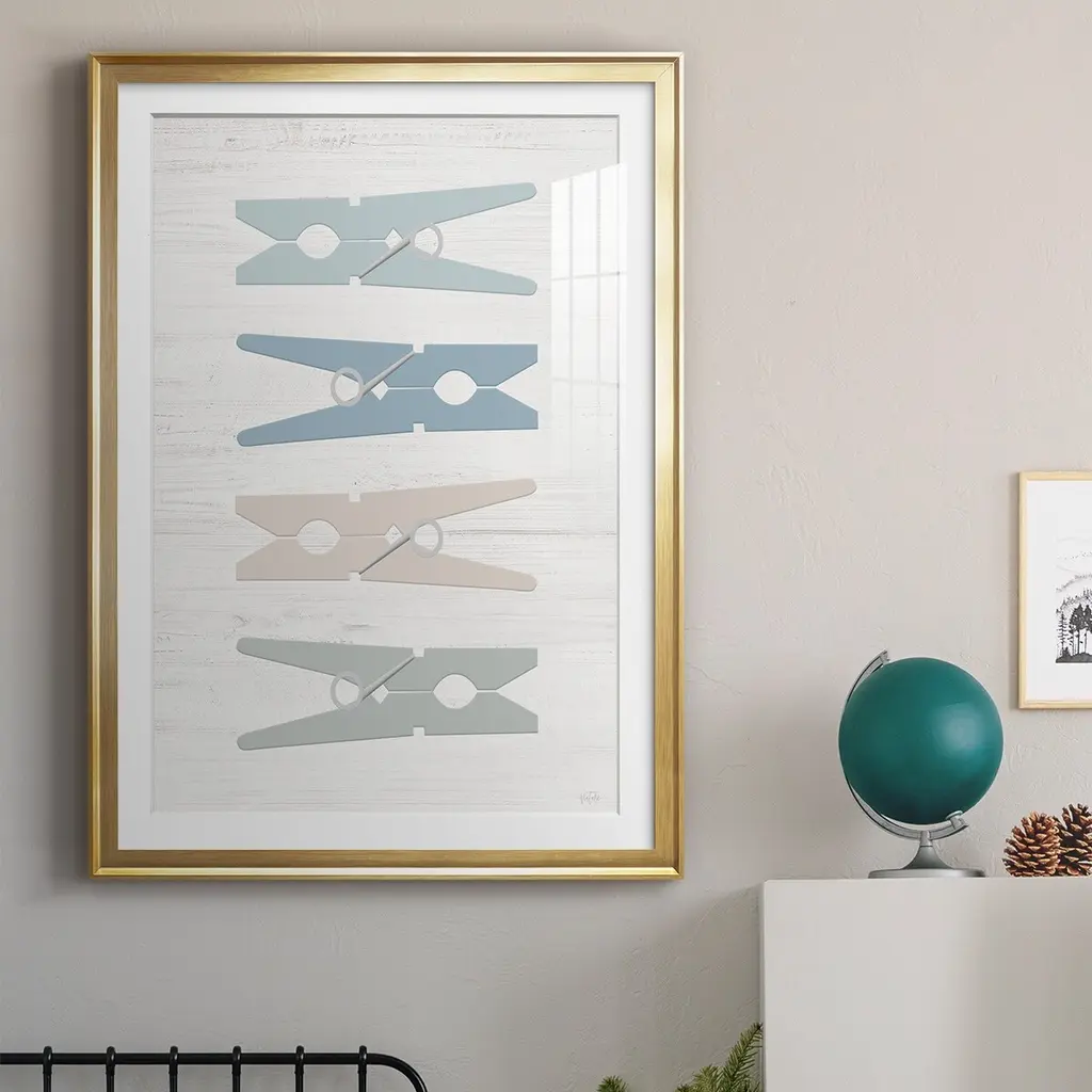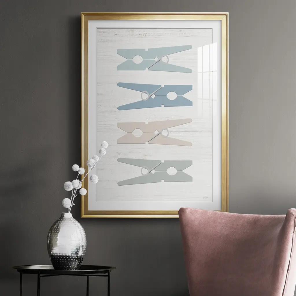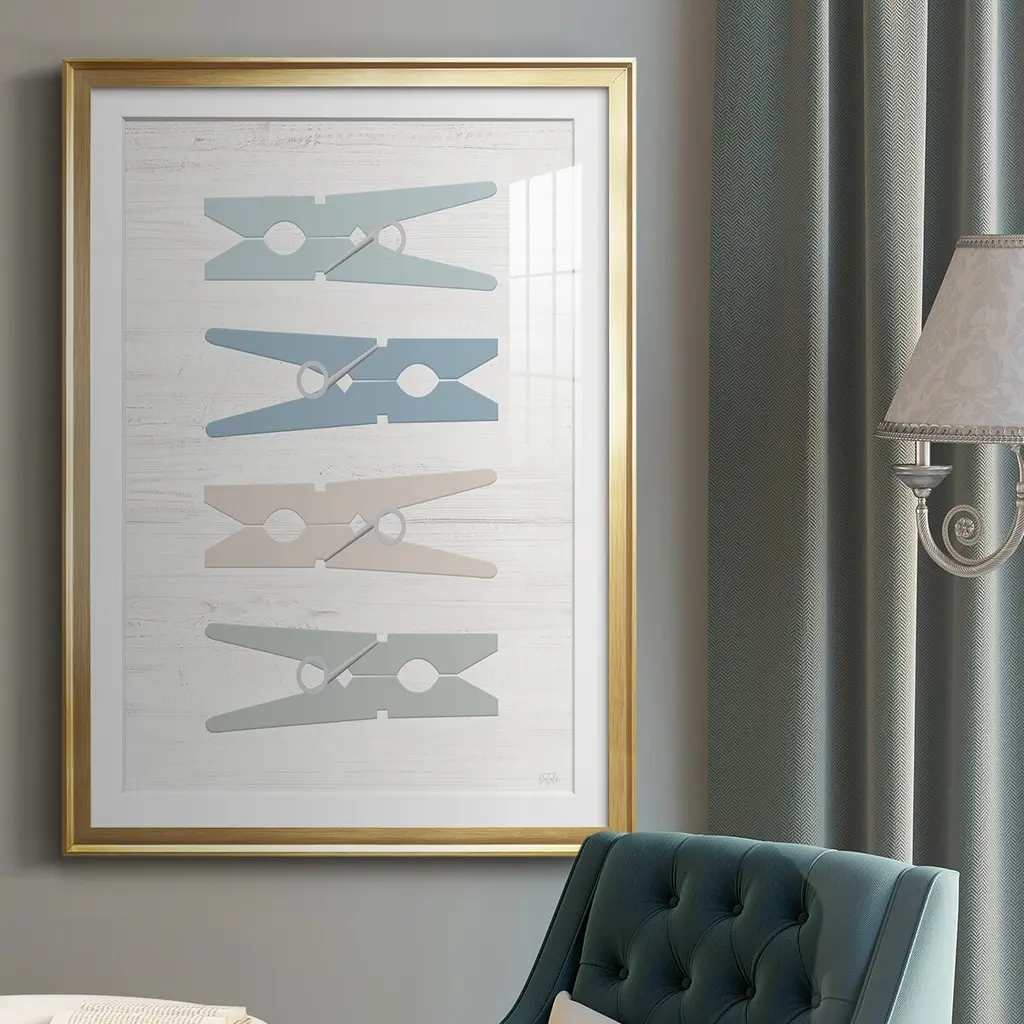 Laundry Pins Premium Framed Print - Ready to Hang A Premium Framed Print created to last. Framed in distressed wood and available in an array of sizes and colors Featuring a beveled a solid wood stretcher bar, each piece comes ready to hand 4 SIZES AVAILABLE 30.5''X42.5'' - Overall Size 26.5'X36.5'' - Overall Size 22.5''x30.5'' - Overall Size 18.5''x24.5'' - Overall Size Each piece is made to order. Each piece comes with hanging hardware. Made in the USA Ready to Hang Giclee Paper Print Acrylic Glass Beveled Matt Board