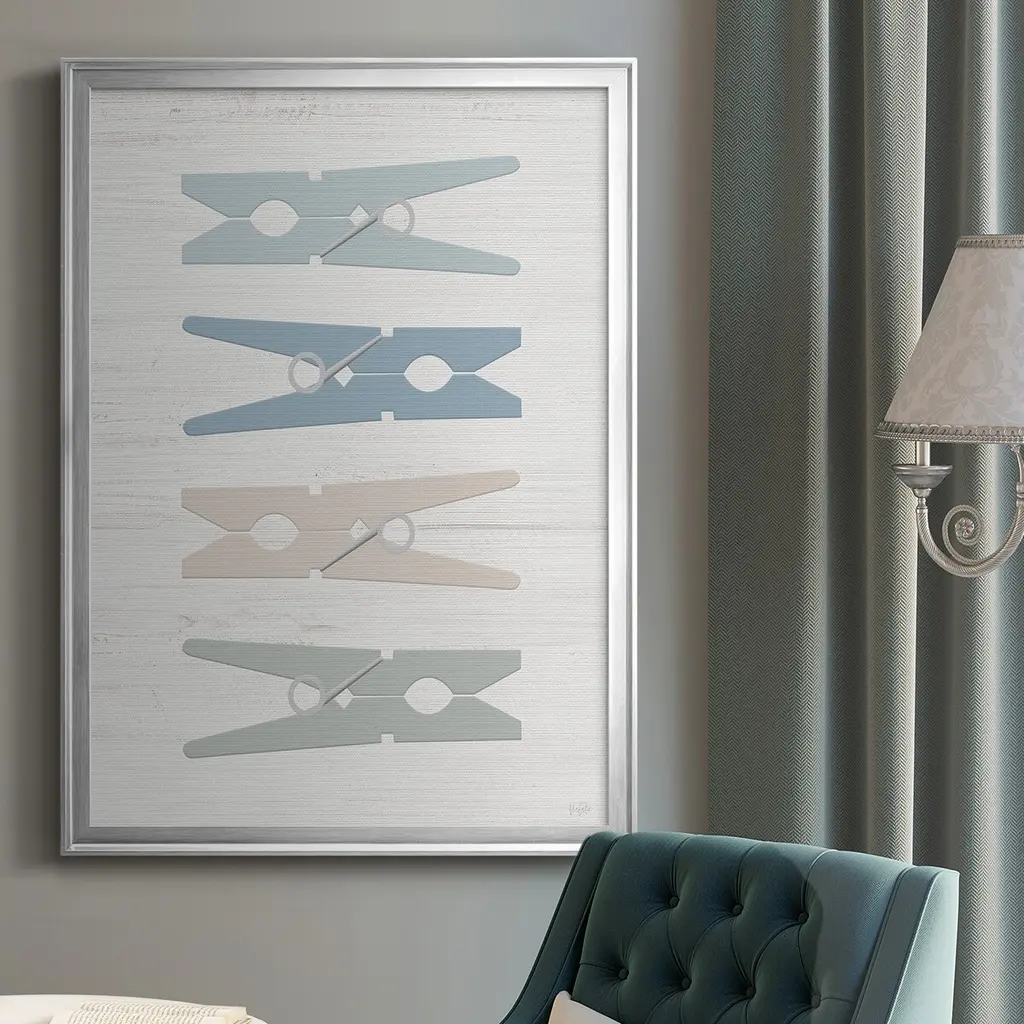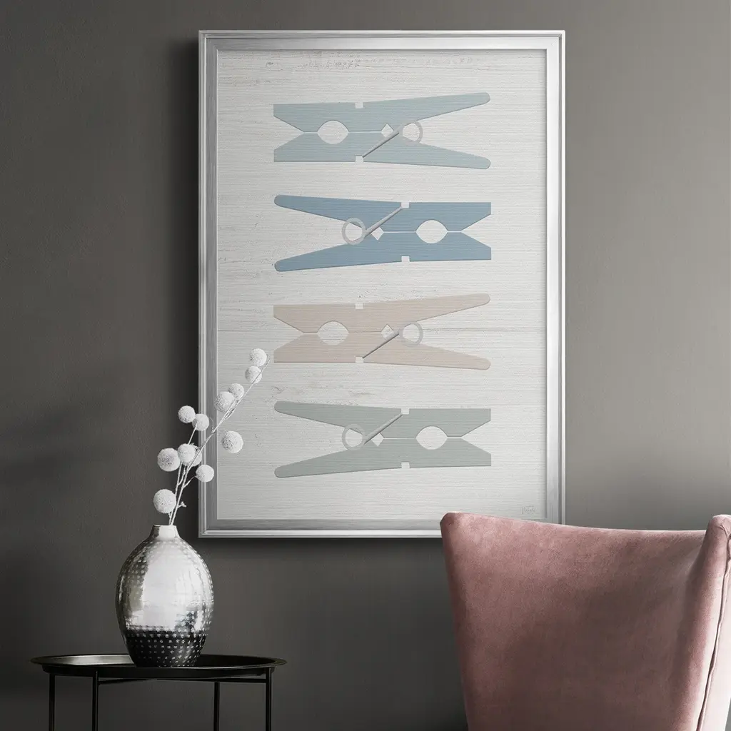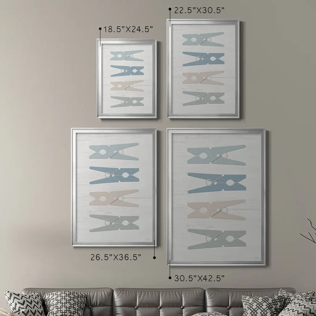 Laundry Pins Premium Framed Print - Ready to Hang A Premium Framed Print created to last. Framed in distressed wood and available in an array of sizes and colors Featuring a beveled a solid wood stretcher bar, each piece comes ready to hand 4 SIZES AVAILABLE 30.5''X42.5'' - Overall Size 26.5'X36.5'' - Overall Size 22.5''x30.5'' - Overall Size 18.5''x24.5'' - Overall Size Each piece is made to order. Each piece comes with hanging hardware. Made in the USA Ready to Hang
