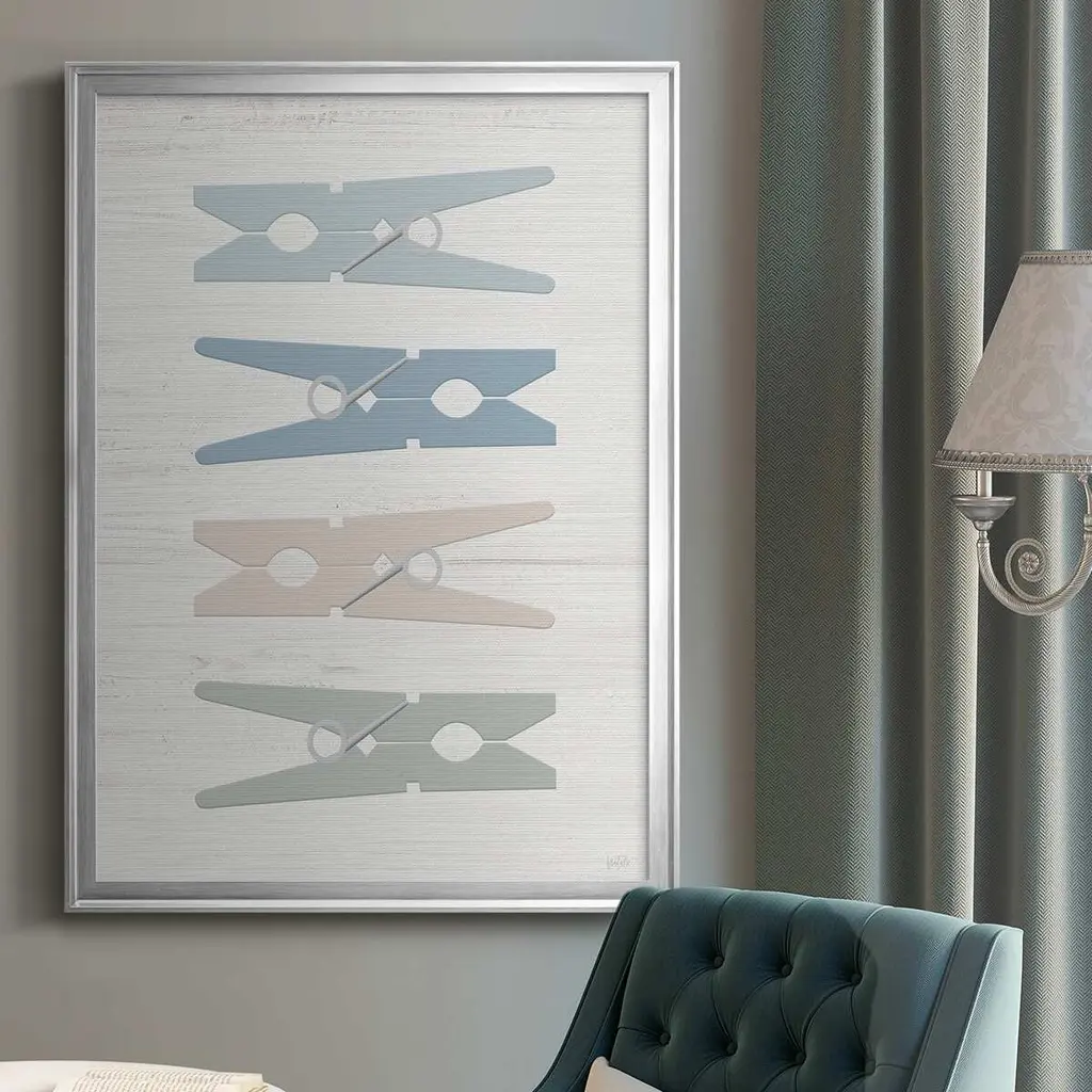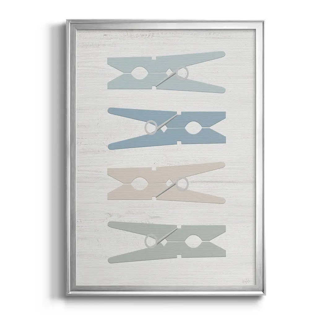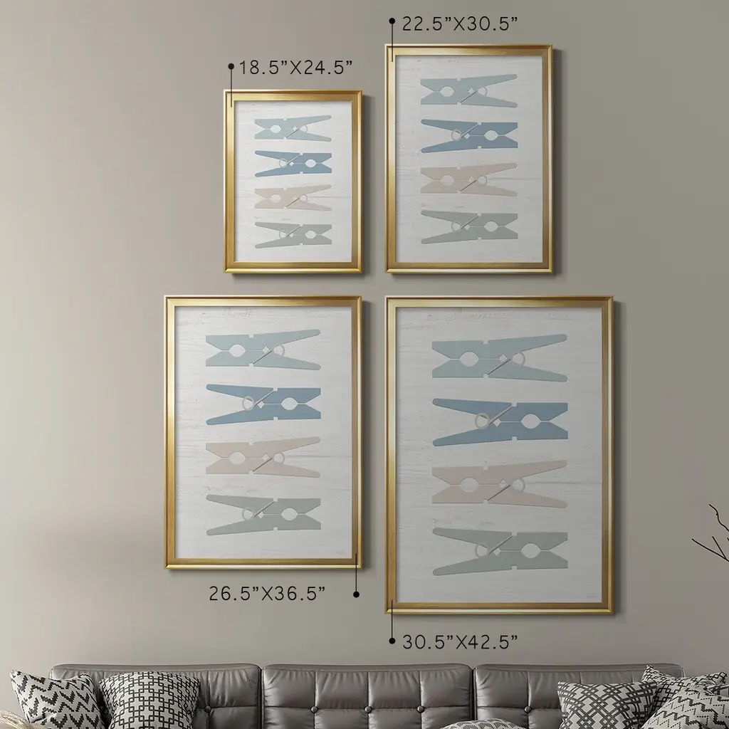 Laundry Pins Premium Framed Print - Ready to Hang A Premium Framed Print created to last. Framed in distressed wood and available in an array of sizes and colors Featuring a beveled a solid wood stretcher bar, each piece comes ready to hand 4 SIZES AVAILABLE 30.5''X42.5'' - Overall Size 26.5'X36.5'' - Overall Size 22.5''x30.5'' - Overall Size 18.5''x24.5'' - Overall Size Each piece is made to order. Each piece comes with hanging hardware. Made in the USA Ready to Hang