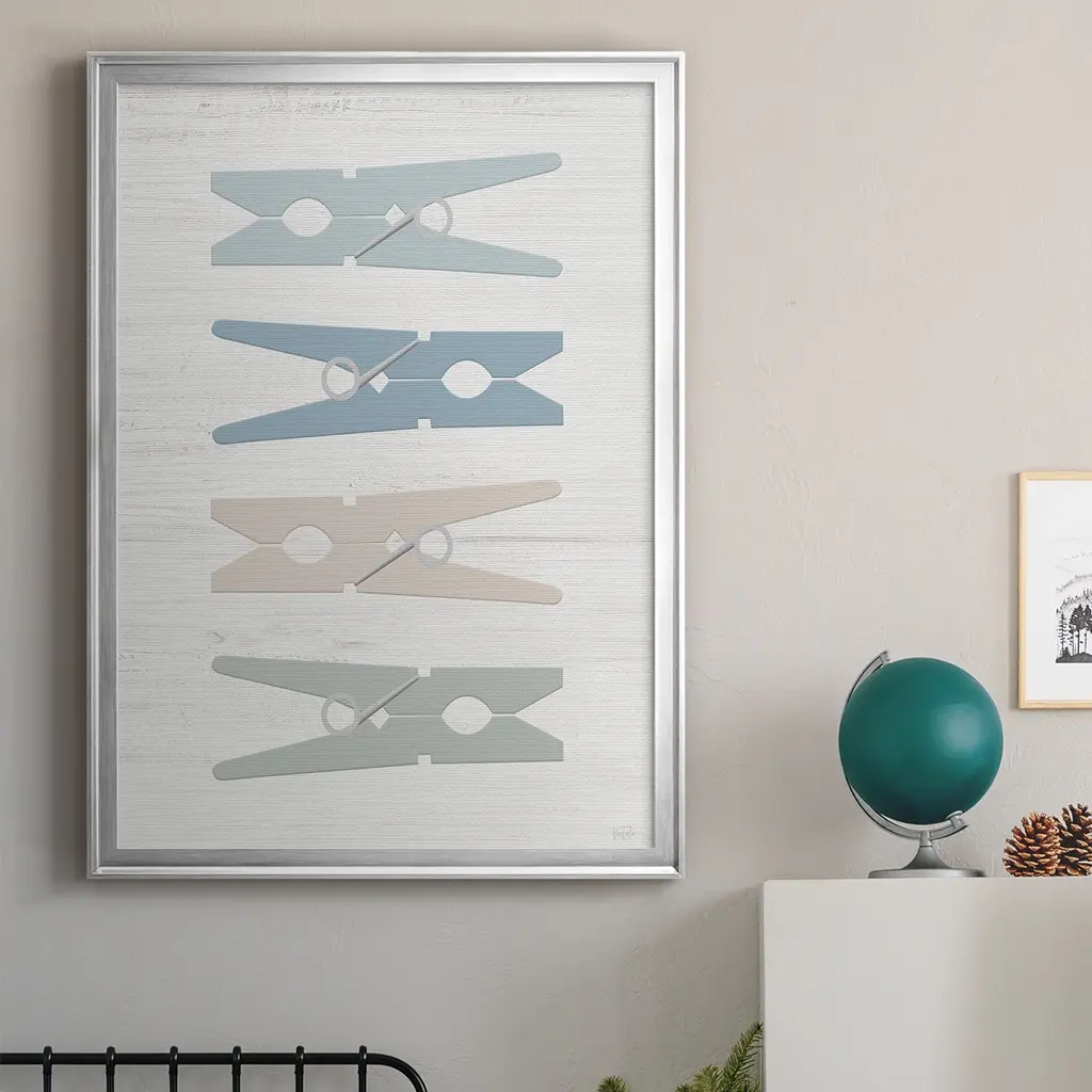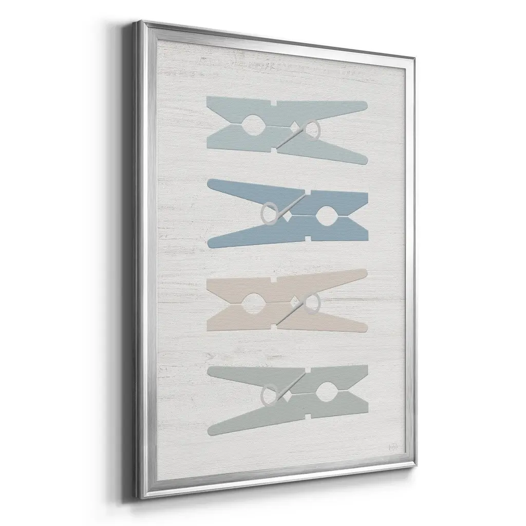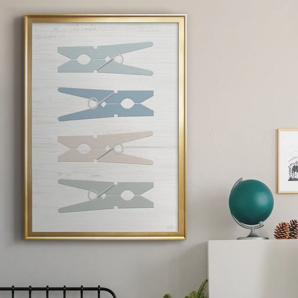 Laundry Pins Premium Framed Print - Ready to Hang A Premium Framed Print created to last. Framed in distressed wood and available in an array of sizes and colors Featuring a beveled a solid wood stretcher bar, each piece comes ready to hand 4 SIZES AVAILABLE 30.5''X42.5'' - Overall Size 26.5'X36.5'' - Overall Size 22.5''x30.5'' - Overall Size 18.5''x24.5'' - Overall Size Each piece is made to order. Each piece comes with hanging hardware. Made in the USA Ready to Hang
