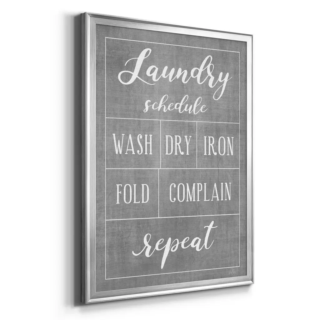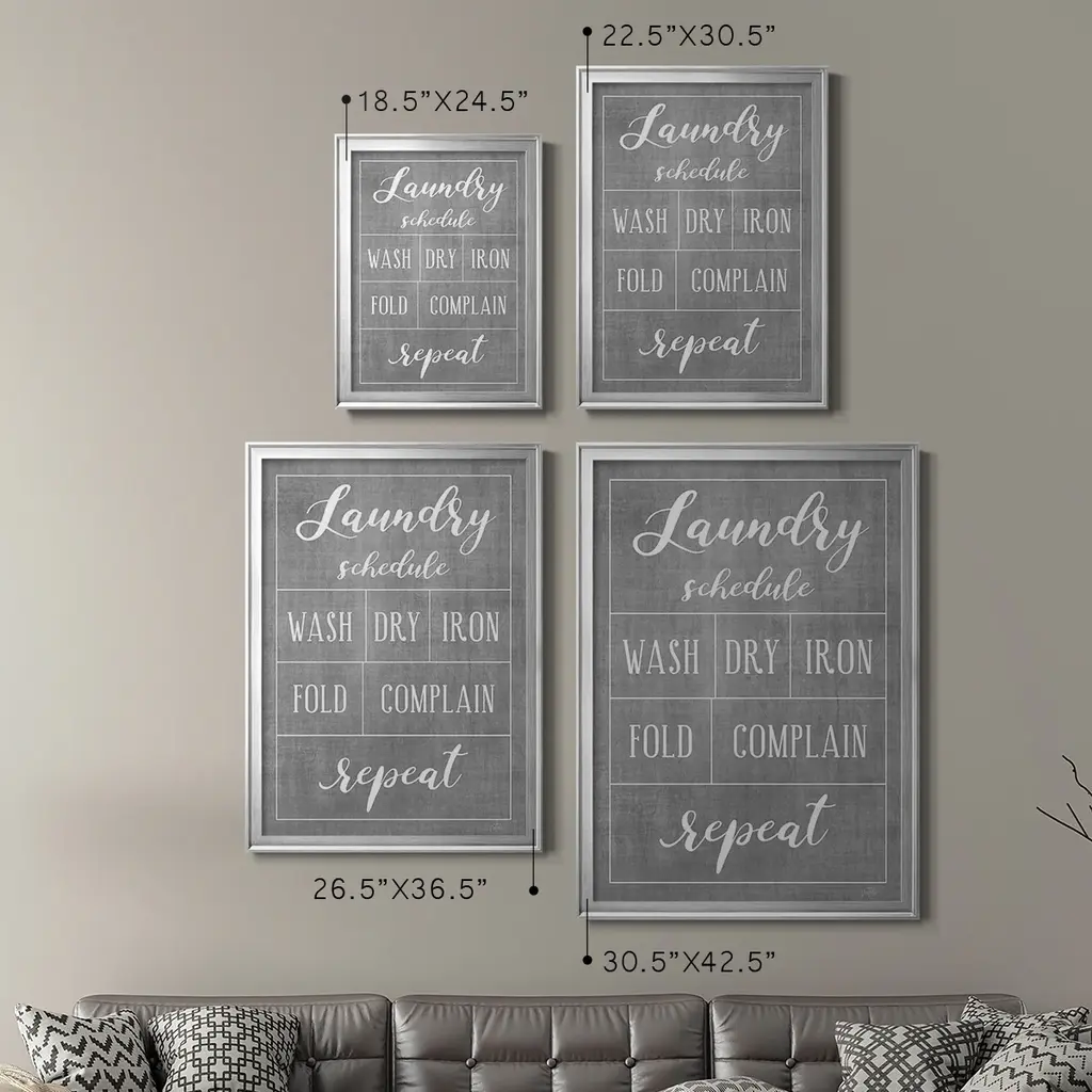Laundry Schedule Premium Framed Print - Ready to Hang A Premium Framed Print created to last. Framed in distressed wood and available in an array of sizes and colors Featuring a beveled a solid wood stretcher bar, each piece comes ready to hand 4 SIZES AVAILABLE 30.5''X42.5'' - Overall Size 26.5'X36.5'' - Overall Size 22.5''x30.5'' - Overall Size 18.5''x24.5'' - Overall Size Each piece is made to order. Each piece comes with hanging hardware. Made in the USA Ready to Hang