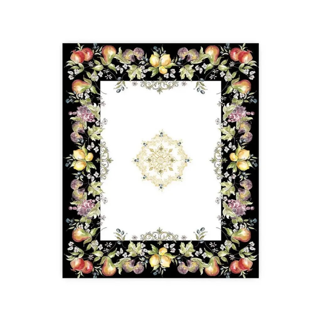 This food-inspired tablecloth "Tuscan Fruit Sketch" features watercolor fruit; pomegranates, lemons, figs, pears, grapes, and a contrasting black background. In addition, the clean white center dazzles with three golden medallions as the focal point. This tablecloth will add a special touch of elegance to your everyday table.