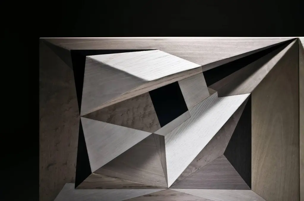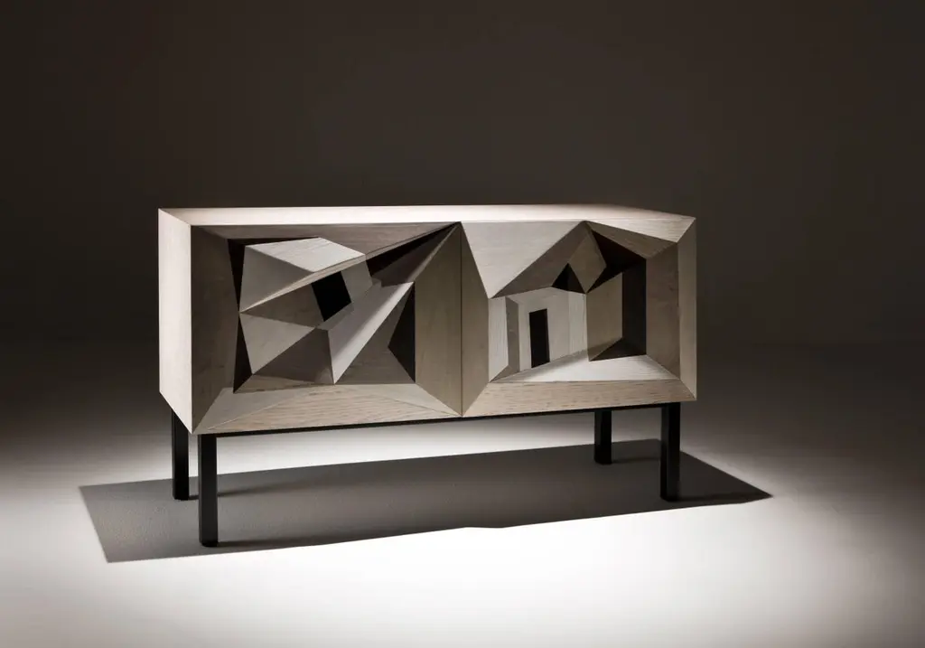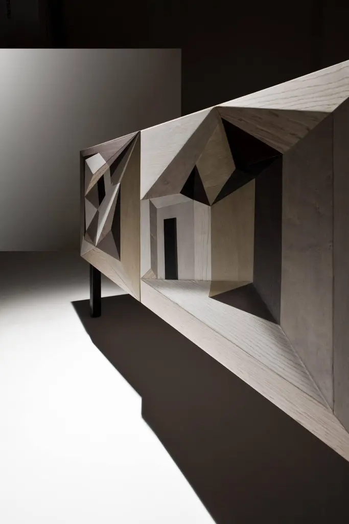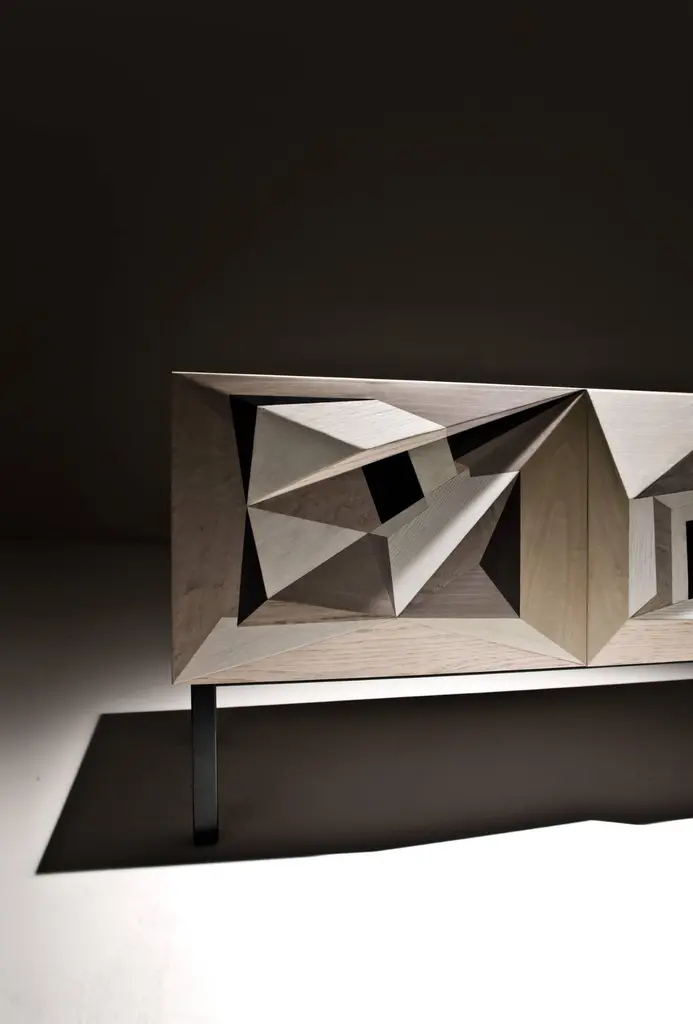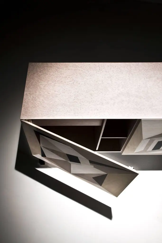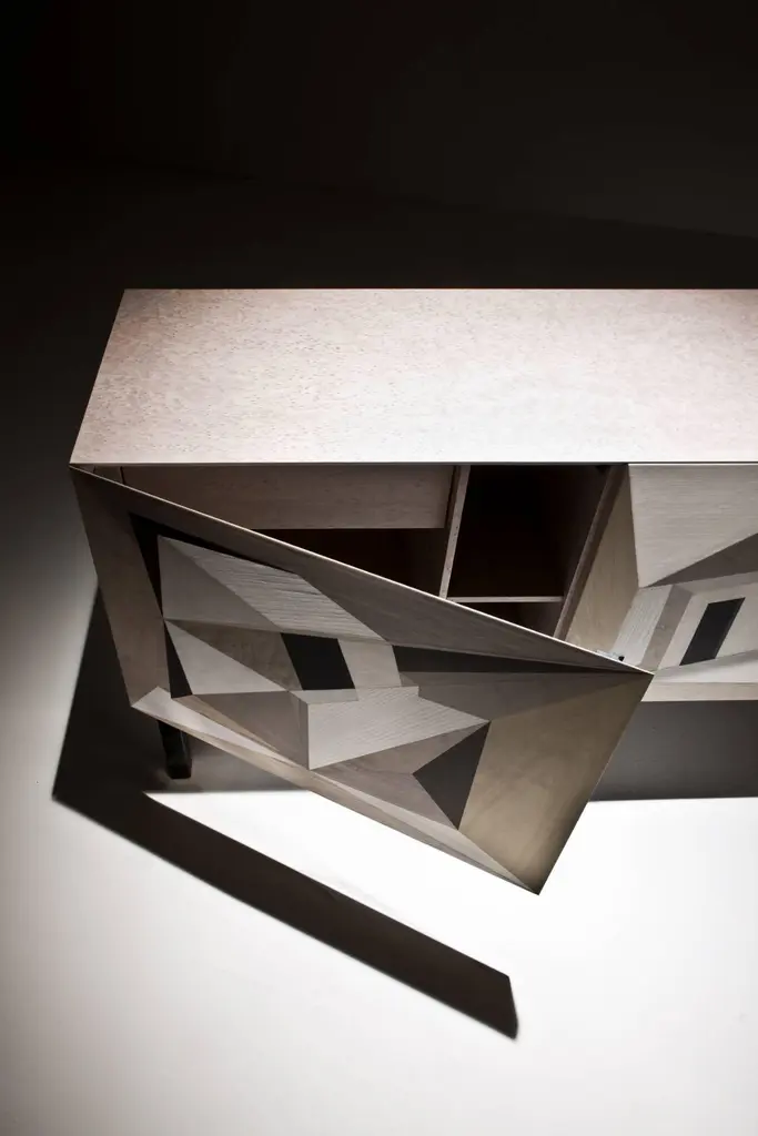 Sideboard with black iron legs, tridimensional inlaid doors and wood structure. Fitted with push-pull doors and two internal shelves and drawers. It is also available in the hanging version.FINISH:Limited Edition Art InlayThe first three-dimensional works by Marcello Jori date back to 1989. They are sculptures - wooden paintings, faceted like crystals, on which the artist, playing with lights and shadows, paints enchanted architectures that multiply and transform according to the light that illuminates them. "Dentro il Paesaggio" represents his first three-dimensional work made with the inlay technique.Dentro il Paesaggio sideboard is produced in a Limited Edition of 21 multiples only.