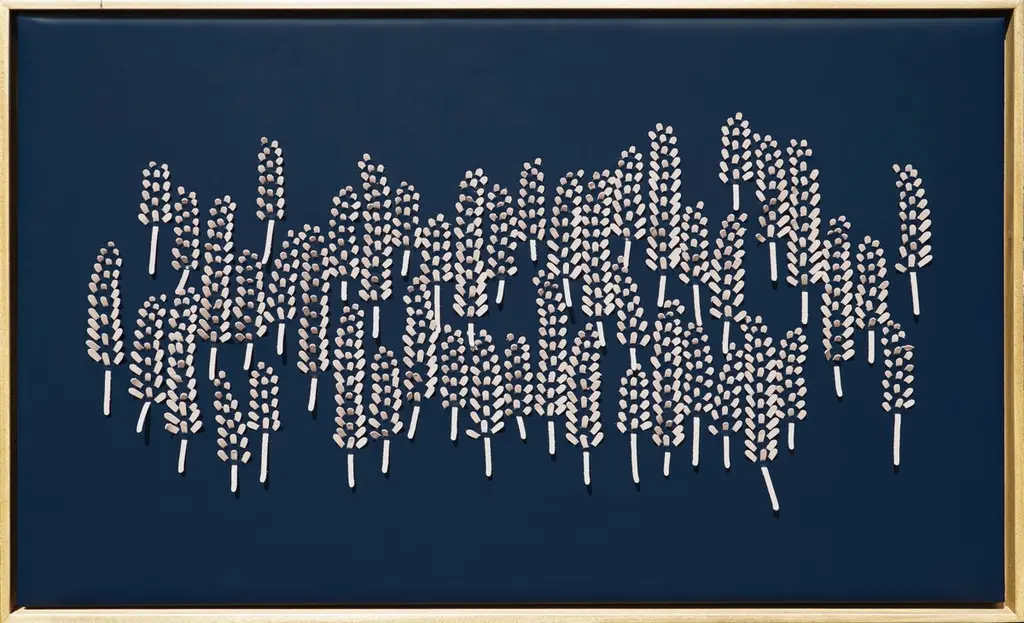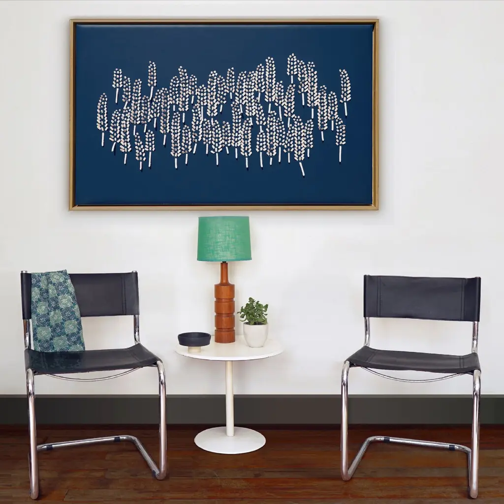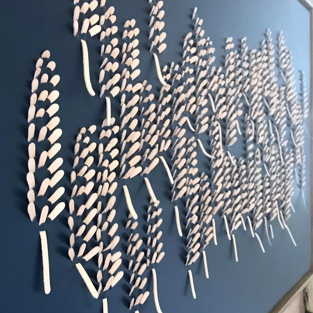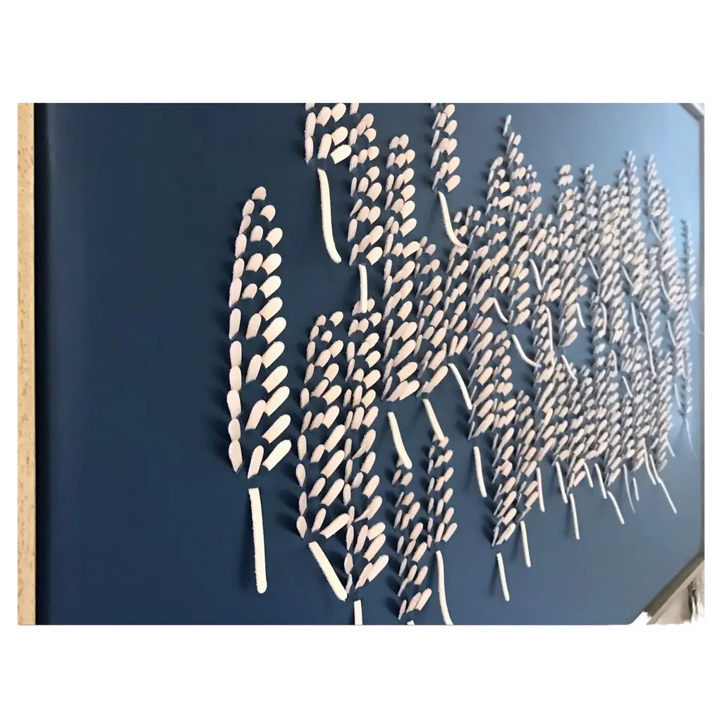 Lavender:A piece of 3D sculptural wall art designed and made from two layers of leather, one blue one pink, woven together by Louise Heighes.Measurements are 31 x 49 inches or 79 x 124 cmThis piece of wall art is inspired by the tiny abundant petals of the lavender and the tightly packed flowers that make this plant a mass of texture and colour. These artworks are crafted from two layers of sustainably sourced leather meticulously cut and intricately woven together, creating a rich sculptural surface. When installed the 3D nature of the work creates beautiful shadows that add an extra depth to the work.I have always been inspired by the flow and movement which I see in the natural world. Be it a field of wild flowers or the blossom on a tree, I have always loved the way the shape of a single petal or flower can be repeated over again, creating myriad of ever changing new patterns. The importance of simplicity, craftsmanship and creating something by hand is key to what I do.