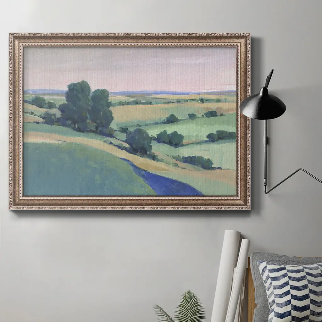 Give any wall a soothing new view with this lovely giclée reproduction, featuring a watercolor painting of a field of lavender. Finished with deckle edges and floated over an off-white mat, the piece is framed with distressed off-white molding with antique-gold trim.
