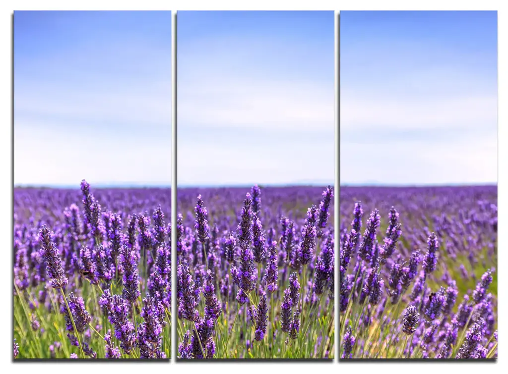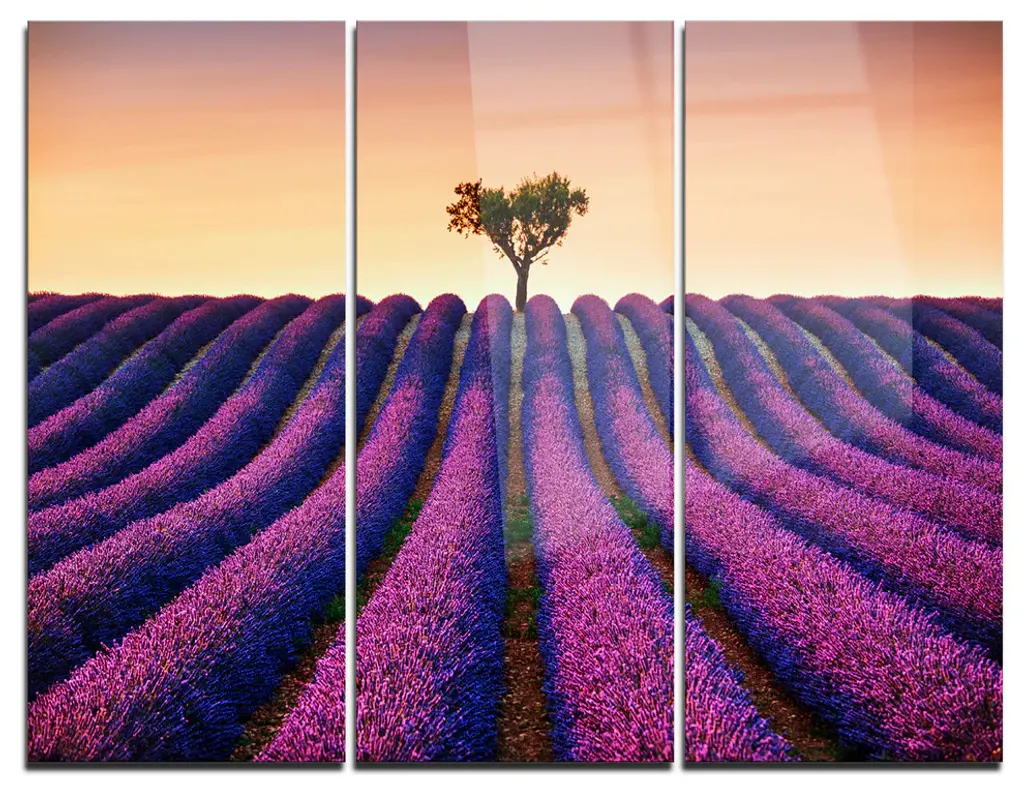 48"œ x 24"œ total size. Ready To Hang! (3 pieces - 16"œ x 24"œ each). 3 Panel Split (Triptych) Metal Print featuring a purple Lavender field during sunset. Modern metal wall art for home or office wall decor & interior design. Printed on Luxurious, HD aluminum glossy metal panels. Multi panel art.. HD aluminum panels. Metal print wall art. Includes Shadow Wall Mount on the back.• Aluminum Metal Wall Art• Made in USA• Ready to hang - No assembly required• Shadow mount hardware on the back• 0.045"œ thick HD Aluminum Panels• Scratch resistant, glossy finish• Superb color clarity, luxurious prints• Epson printing process• For indoor or moisture rich environment use• Easy to clean. Gently wipe with microfiber cloth.