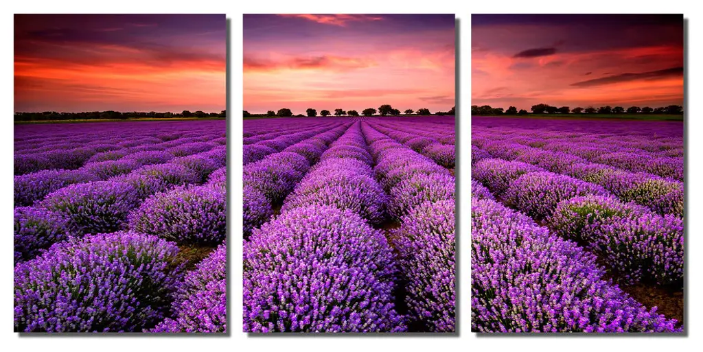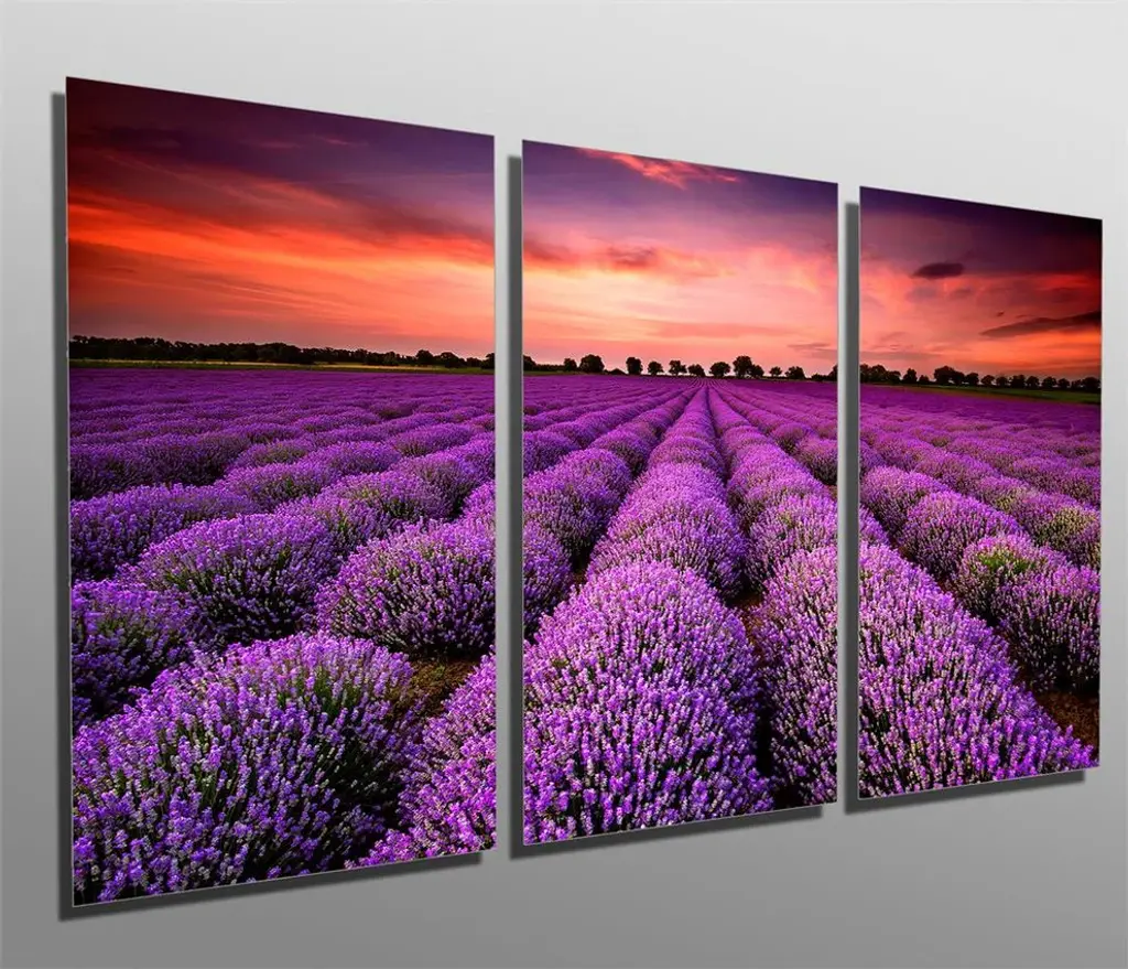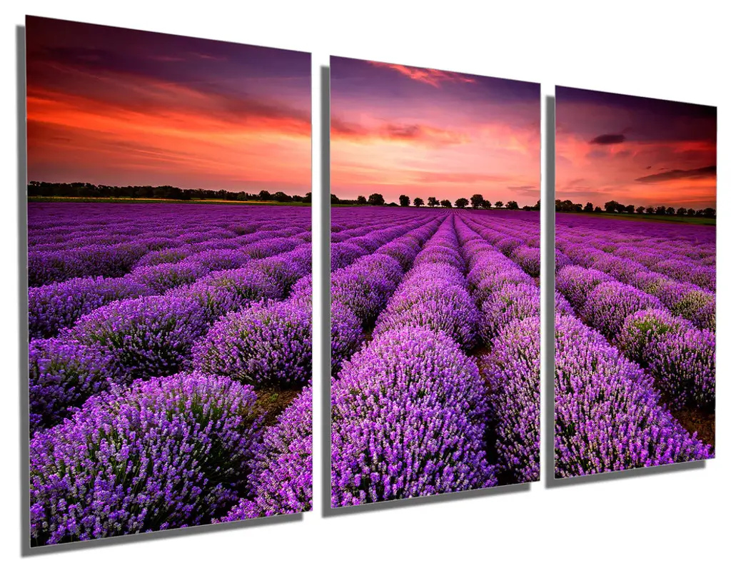 60"œ x 30"œ total size. Ready To Hang! (3 pieces - 20"œ x 30"œ each). 3 Panel Split (Triptych) Metal Print featuring a purple Lavender field during sunset. Modern metal wall art for home or office wall decor & interior design. Printed on Luxurious, HD aluminum glossy metal panels. Multi panel art.. HD aluminum panels. Metal print wall art. Includes Shadow Wall Mount on the back.• Aluminum Metal Wall Art• Made in USA• Ready to hang - No assembly required• Shadow mount hardware on the back• 0.045"œ thick HD Aluminum Panels• Scratch resistant, glossy finish• Superb color clarity, luxurious prints• Epson printing process• For indoor or moisture rich environment use• Easy to clean. Gently wipe with microfiber cloth.