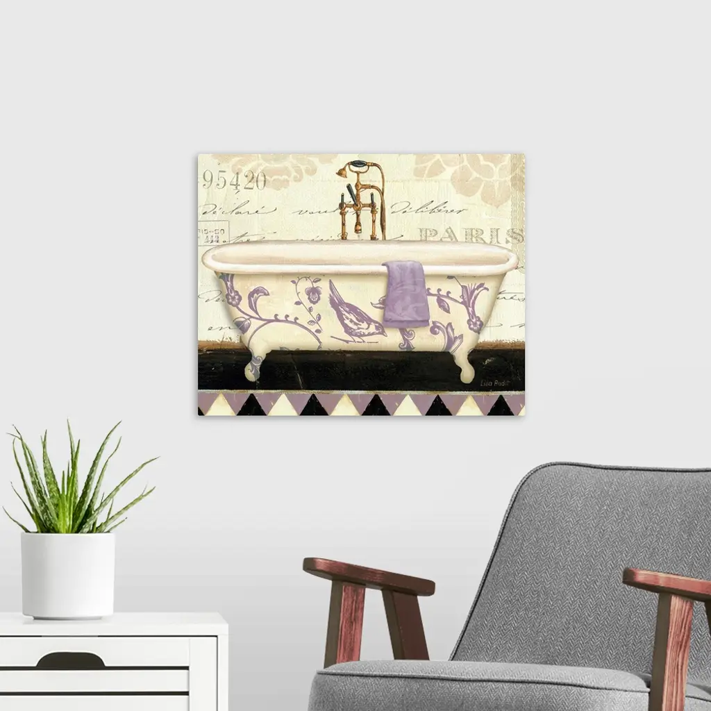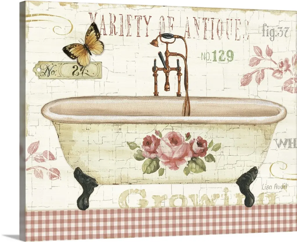 Contemporary artwork of a floral decorated bathtub, against a floral and text background.