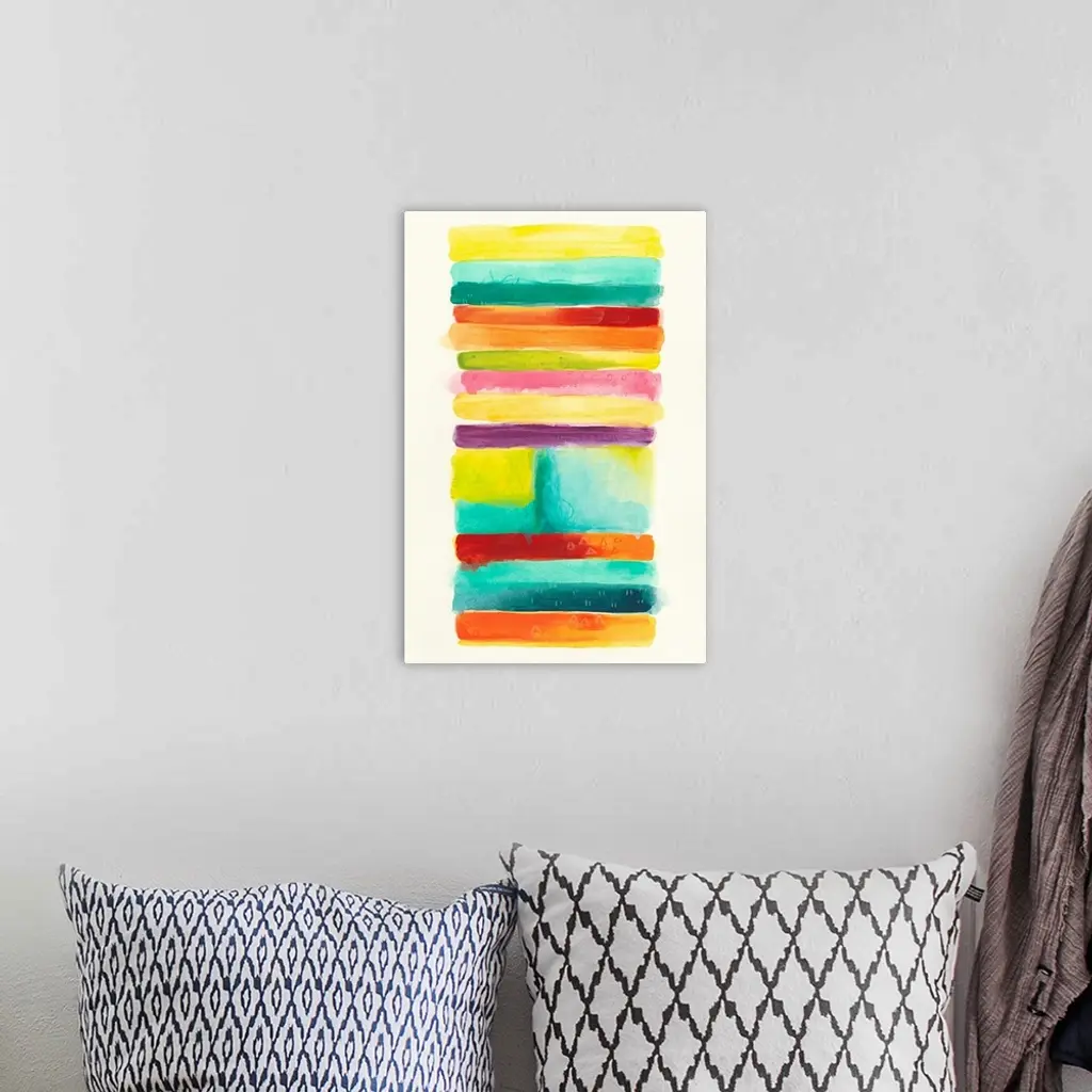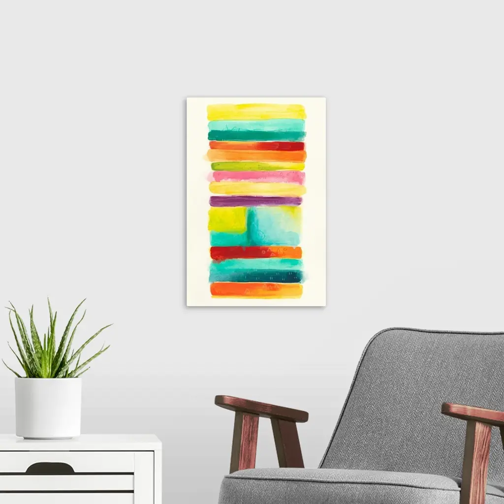 An abstract painting of rectangular shapes in vibrant colors stacked to create one big rectangle.