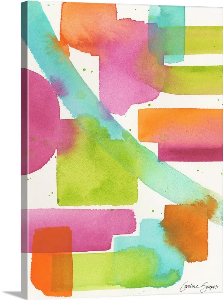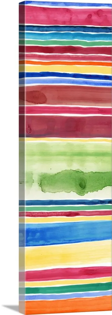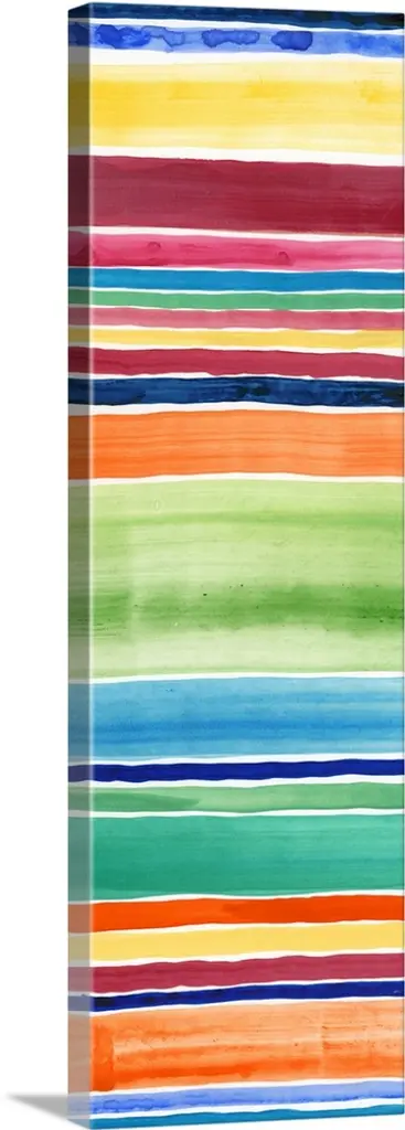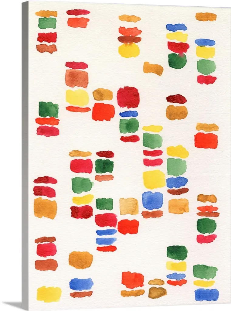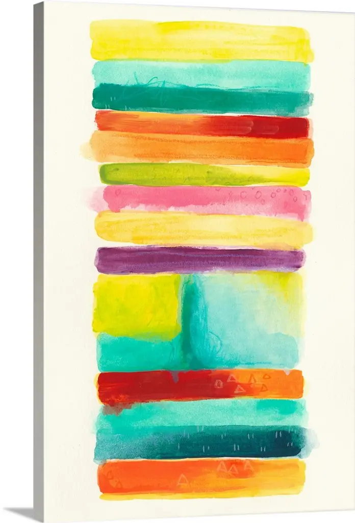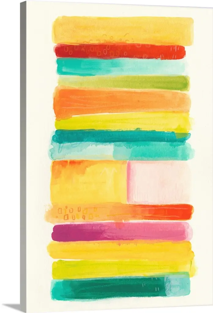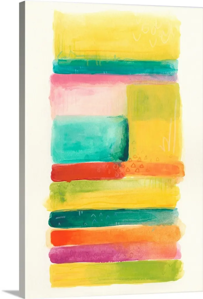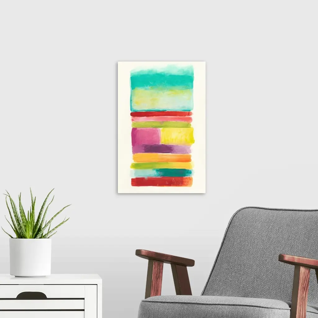 An abstract painting of rectangular shapes in vibrant colors stacked to create one big rectangle.