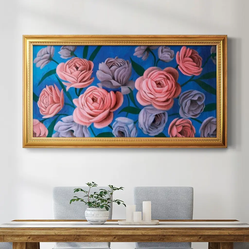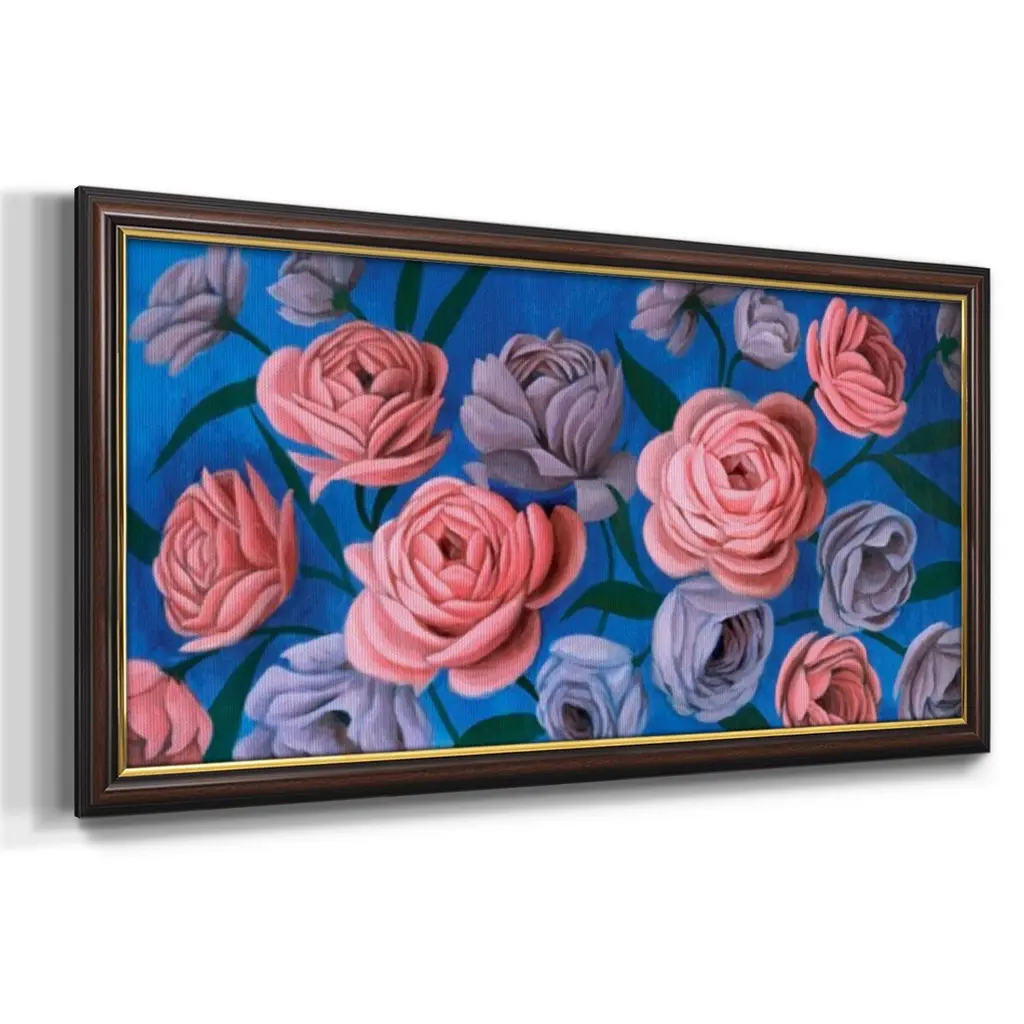 Layered Petals III Premium Framed Canvas- Ready to Hang A Premium Framed Canvas created to last. Framed in distressed wood and available in an array of sizes and colors Featuring a beveled a solid wood stretcher bar, each piece comes ready to hand 3 SIZES AVAILABLE 21''X37'' - Overall Size 25''X45'' - Overall Size 29''x53'' - Overall Size Each piece is made to order. Each piece comes with hanging hardware. Made in the USA Ready to Hang Giclee Paper Print Acrylic Glass Beveled Matt Board