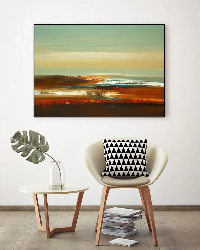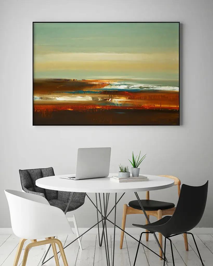 Your ready to hang artwork is printed on canvas then stretched and mounted to a 2-inch thick - hand stained black wood frame. Arrives at your door complete with an easy to use self-leveling hangking kit.