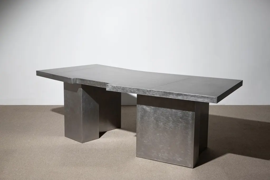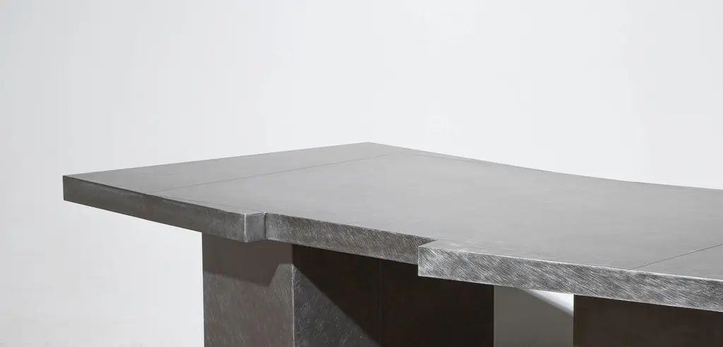 Layered steel desk by Hyungshin HwangDimensions: D 230 x W 110 x H 75 cmMaterials: stainless steelLayered Series is the main theme and concept of work of Hwang, who continues his experiment which is based on architectural composition of layering materials we can easily find around us. This series starts from his childhood memory of an incessantly transforming city with full of geometric architecture. Ever since the beginning of his career when he piled up discarded bricks or concrete pieces to make simple pieces of artwork, he has always experimented with layering.Born in Seoul, 1981, Hyungshin Hwang is a Korean designer based in Seoul. He graduated B.F.A and M.F.A from Hongik University. Currently working in Seoul he has produced a variety of objects and is participating in various projects. He has been articulating ordinary experiences and past memories through creating objects and recently continues his work with his idea of ‘layered series’. These objects premiered at KIAF in 2007, and have since been presented in various shows including DMY Berlin Design Festival.