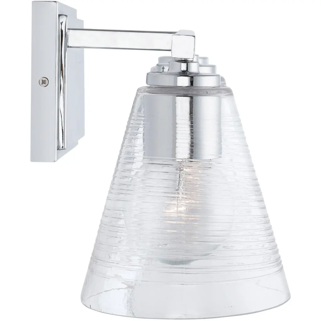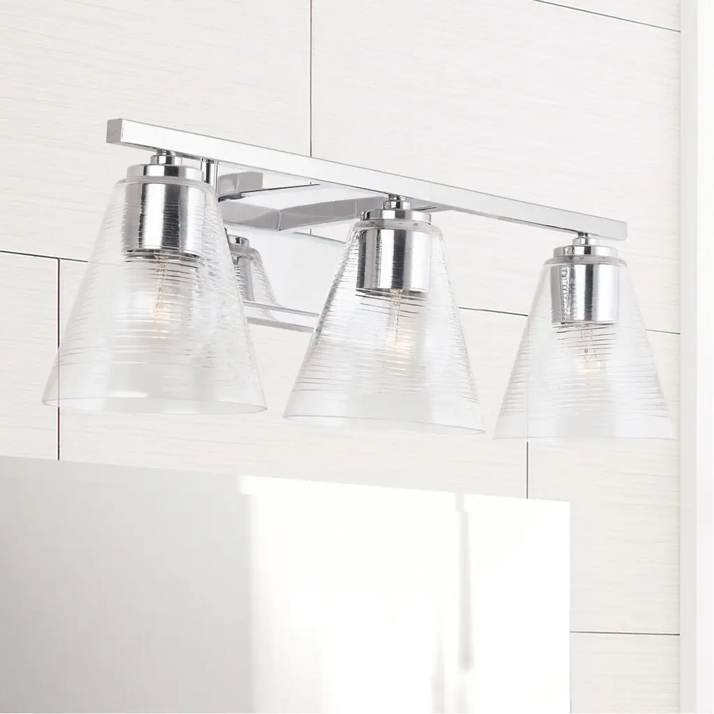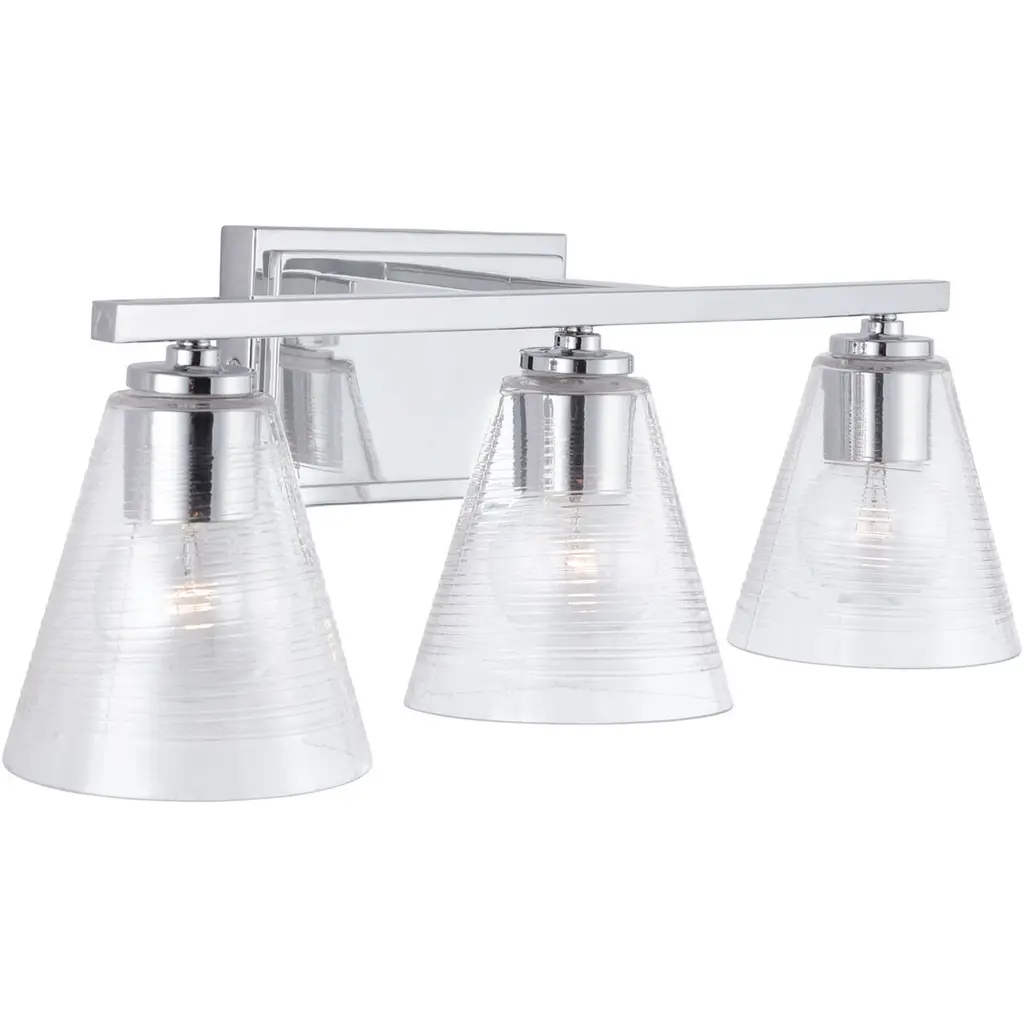 The cone-shaped glass on this 3-Light Vanity has a raised glass spiral texture on the exterior of the material, creating a unique texture and sparkle that is further emphasized by the Chrome finish.