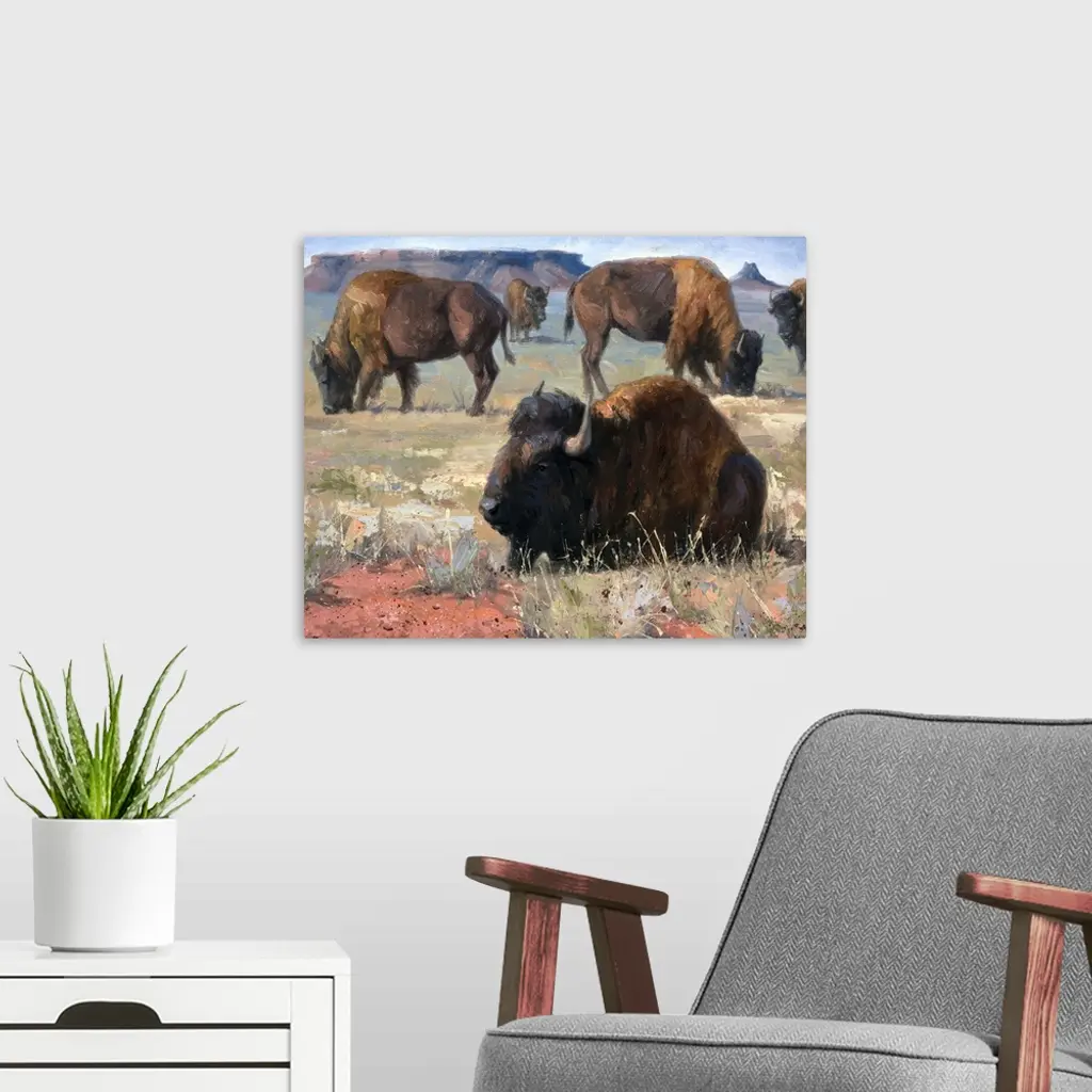Contemporary painting of a bison in a herd resting in the prairie.
