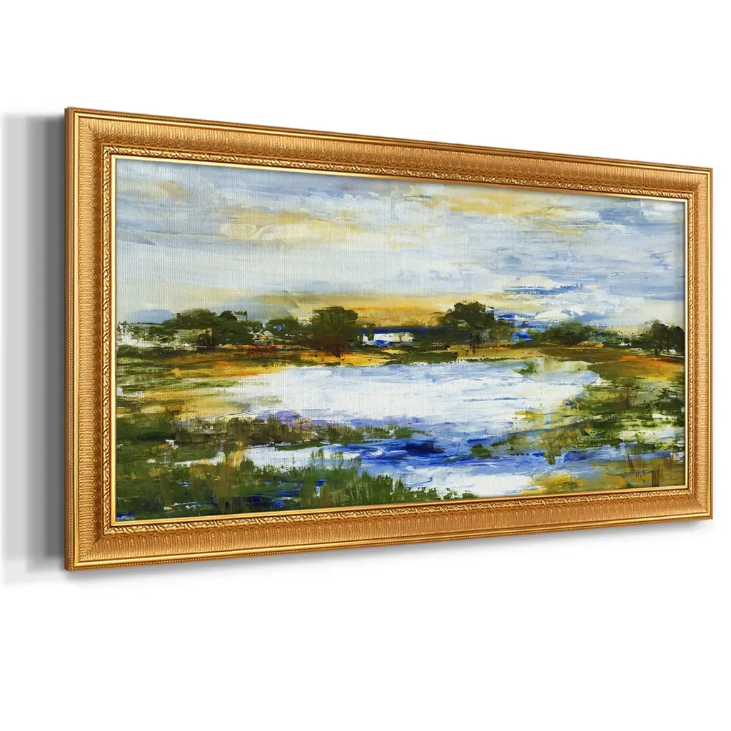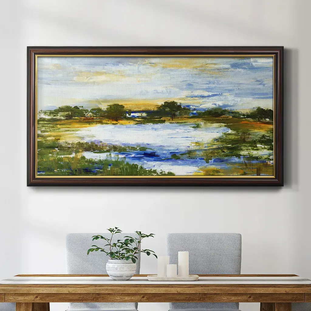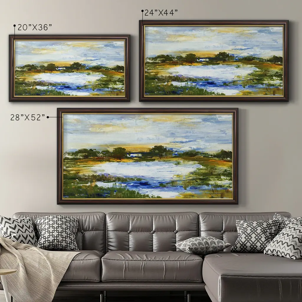 Lazy River Premium Framed Canvas- Ready to Hang A Premium Framed Canvas created to last. Framed in distressed wood and available in an array of sizes and colors Featuring a beveled a solid wood stretcher bar, each piece comes ready to hand 3 SIZES AVAILABLE 21''X37'' - Overall Size 25''X45'' - Overall Size 29''x53'' - Overall Size Each piece is made to order. Each piece comes with hanging hardware. Made in the USA Ready to Hang Giclee Paper Print Acrylic Glass Beveled Matt Board