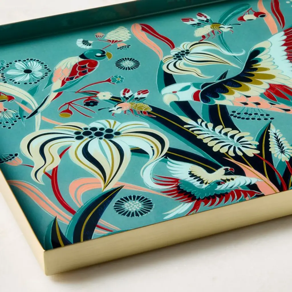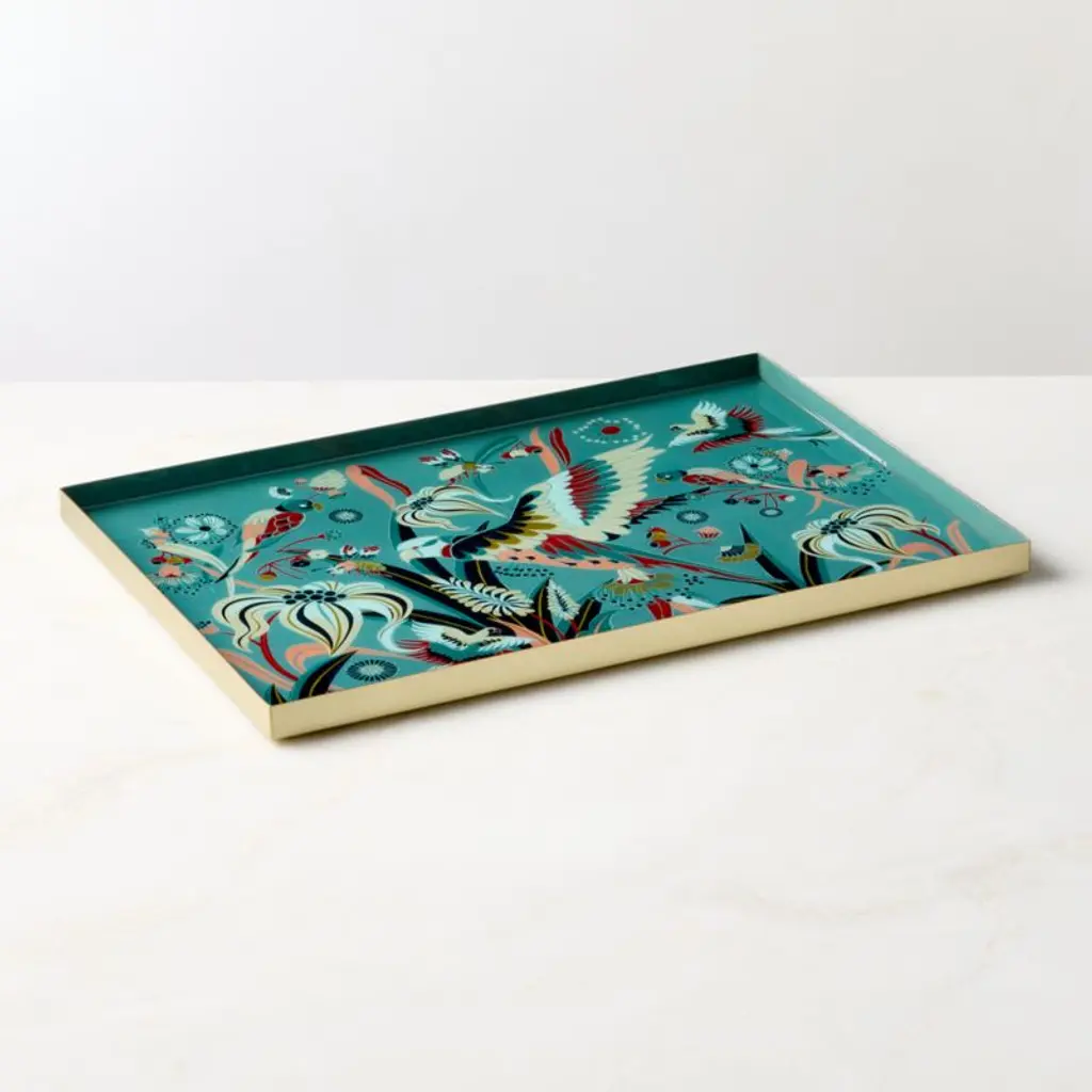 Stainless steel serving tray is updated for the modern table with vibrant tropical artwork by award-winning designer Silvana Azzi Heras of House of Heras. "The collection is inspired by Australian flora and fauna and my love of rainbow lorikeets, flowering gum trees and eucalyptus leaves," explains the Australian-based designer. The color-blocked design is finished with a brass-plated edge for an heirloom feel. To complete the look, pair with the other pieces in the Le Paradis dinnerware collection. CB2 exclusive.
