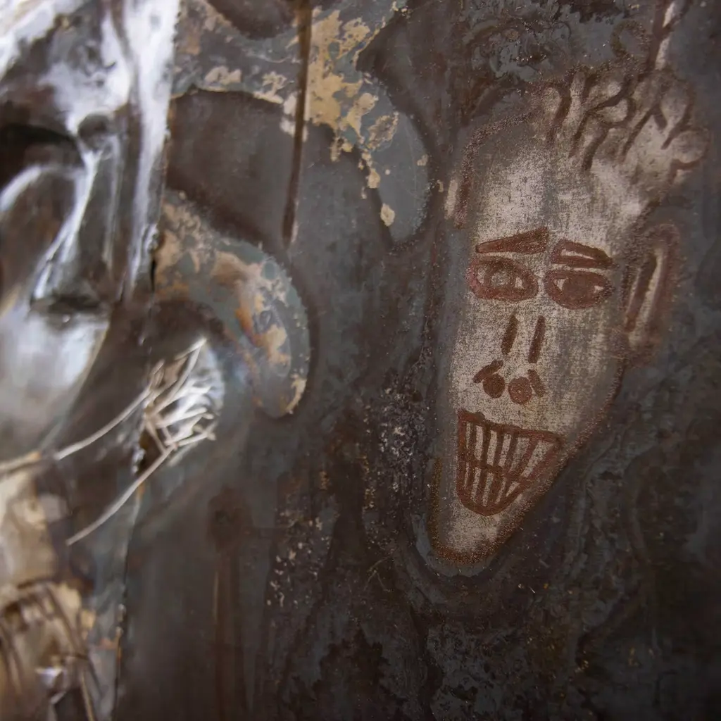 Visionary, provocative, and mysterious, this one-of-a-kind iron artwork stands on between painting and sculpture. Its defying-labels nature is reflected in its subject, where a naked woman's backside protrudes from the panel, paired to a funny facial expression and a stately male figure - deliberately unproportioned - that picks a flower from the ground.
