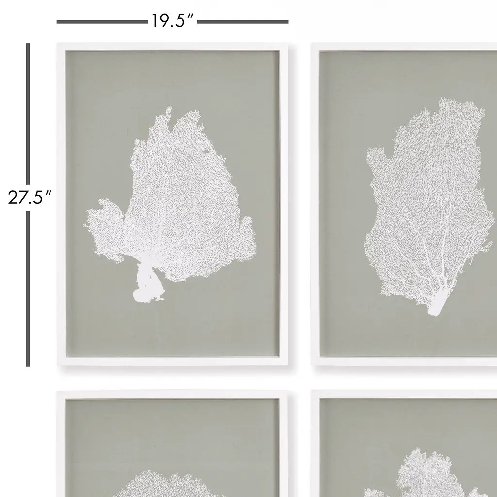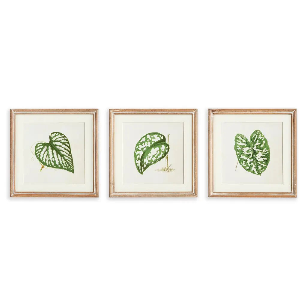 This set of petite prints is a traditional subject with an unexpected perspective. All the character and natural beauty in these variegated leaves is front & center in these fresh compositions. Finished with a crisp white mat and whitewashed wood frame, a handsome set for study, bookshelves or powder room.