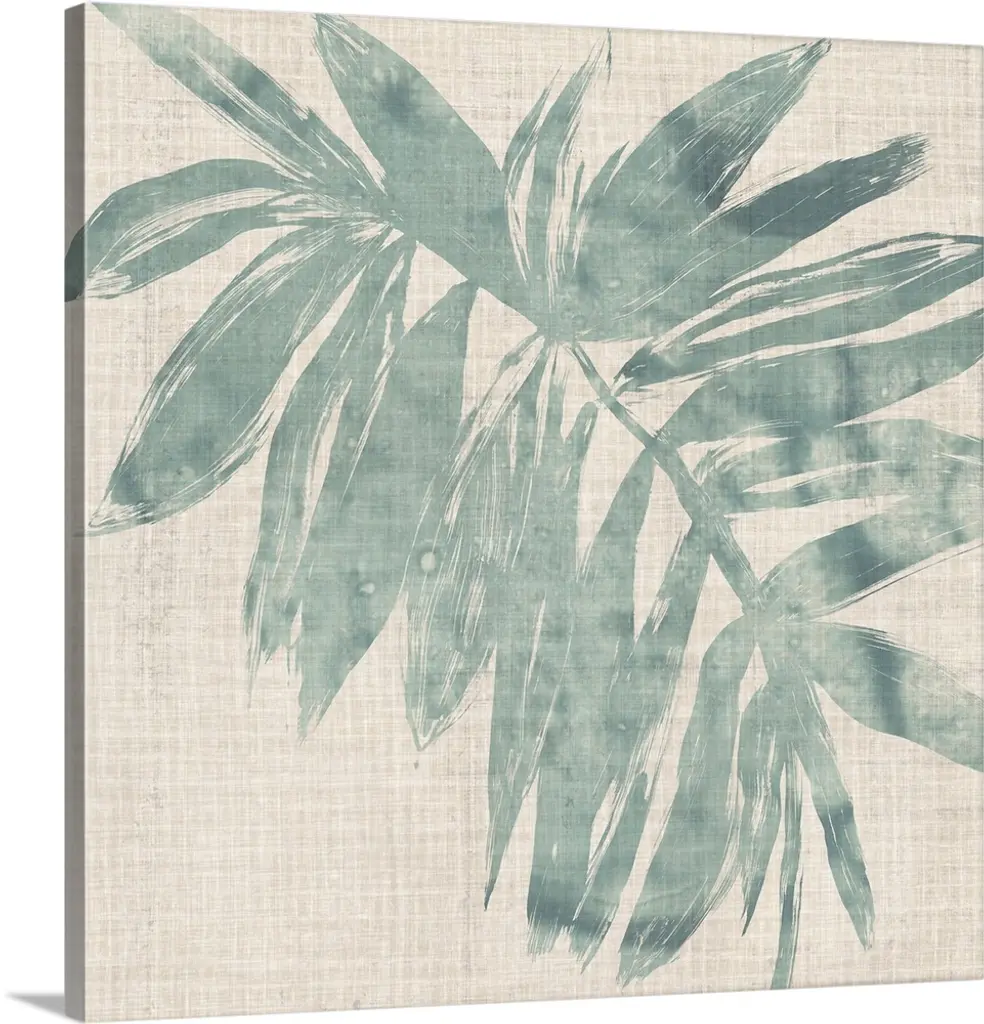 Square watercolor painting of a green palm leaf on a light blue burlap background.