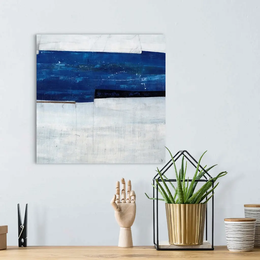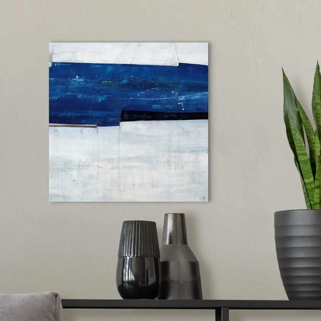 Abstract painting of a navy blue strip over a cool, gray-blue background.