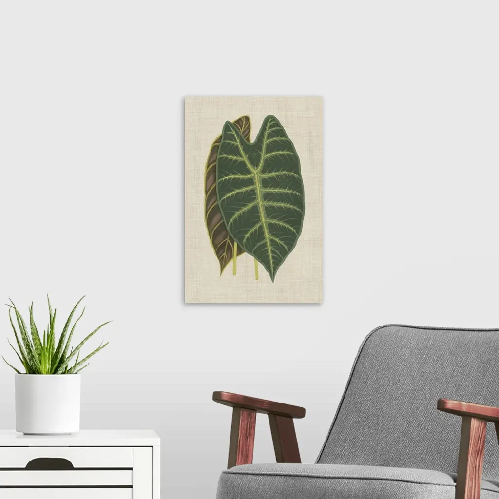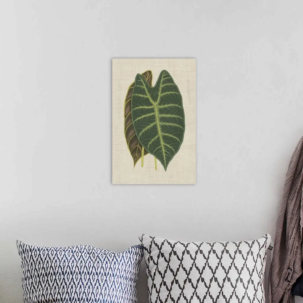 This decorative artwork features an illustrated front and back view of a leaf with light green veins over a neutral linen background.