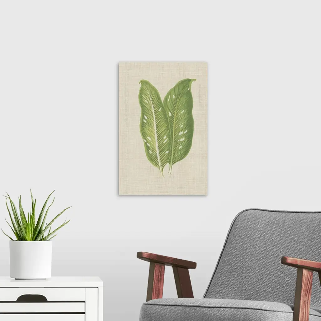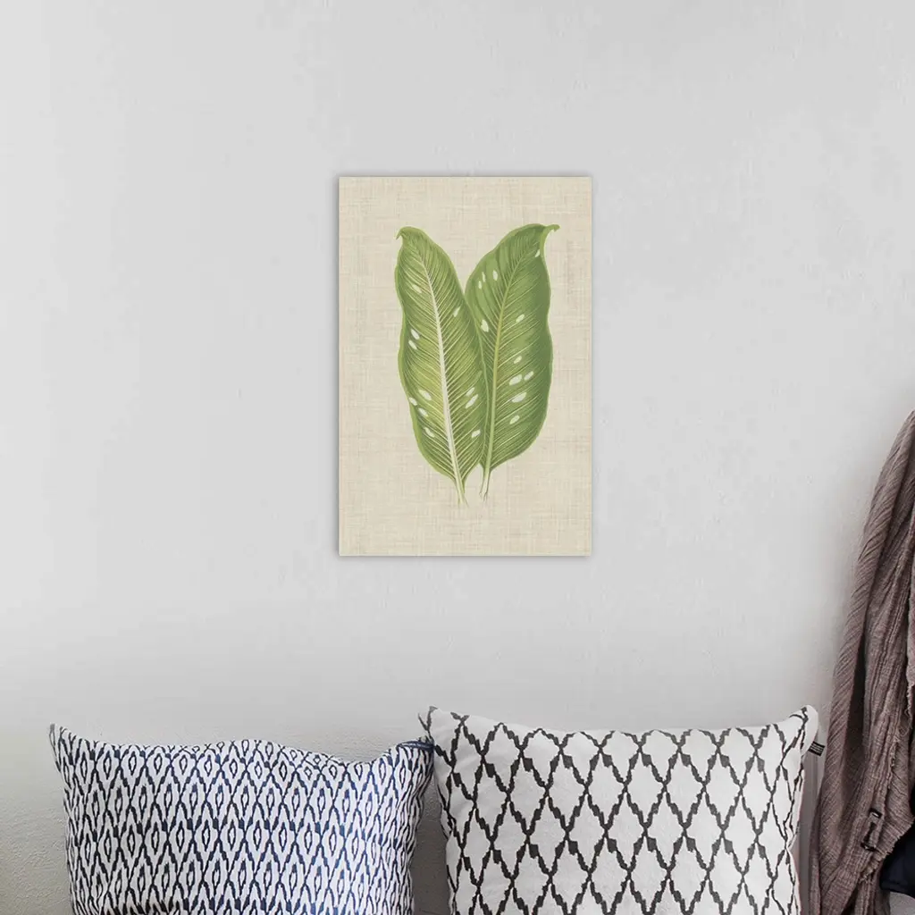 This decorative artwork features an illustrated front and back view of a leaf with light green veins over a neutral linen background.