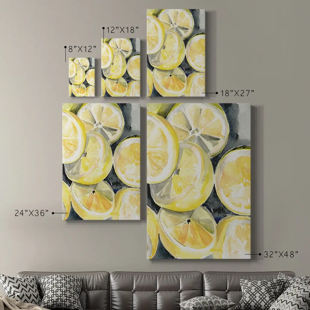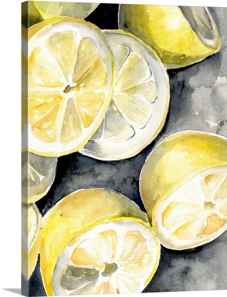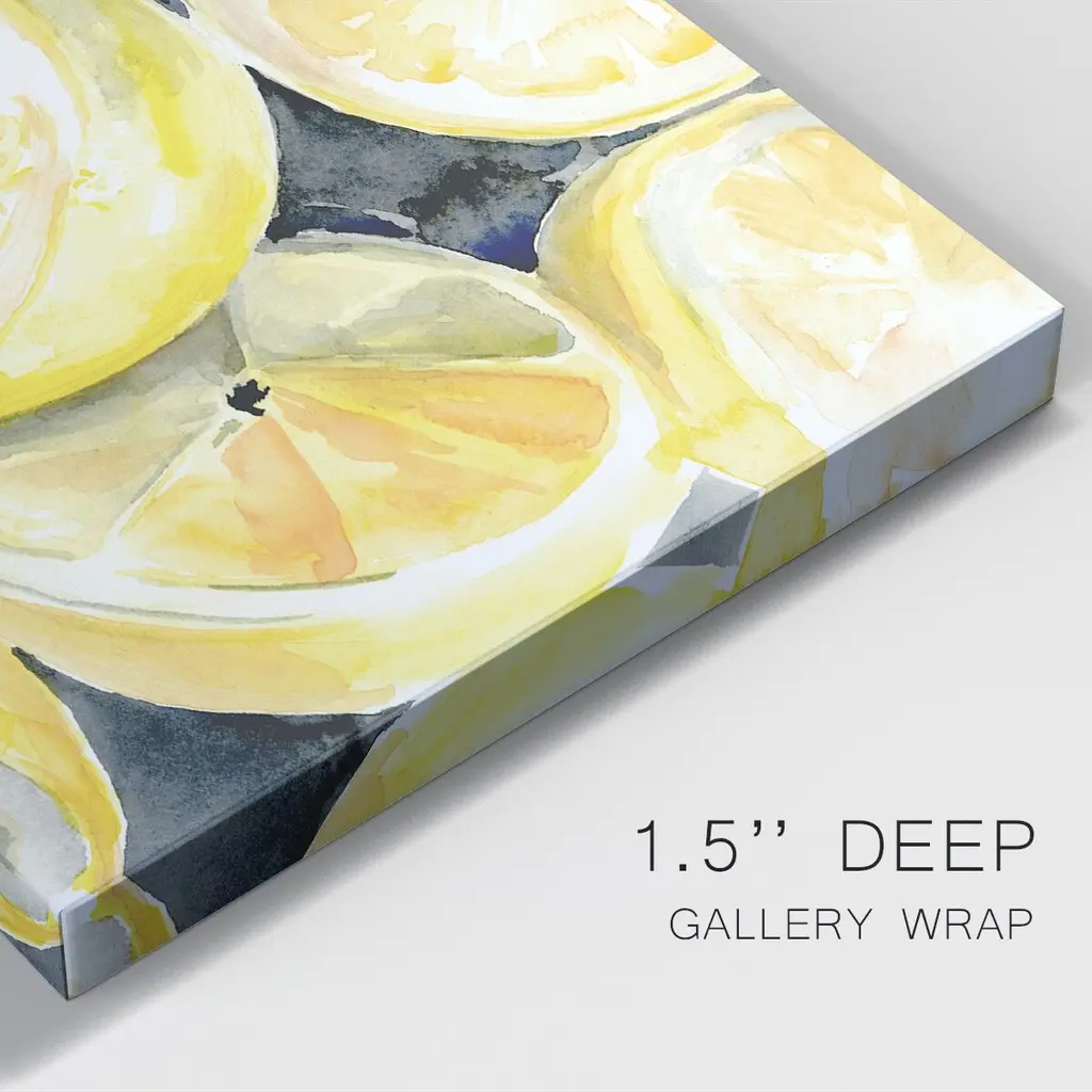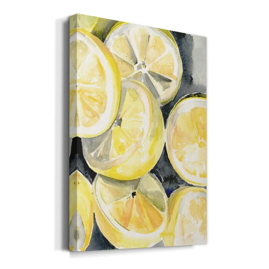 Lemon Slices I Premium Gallery Wrapped Canvas - Ready to Hang A premium hand stretched gallery wrapped canvas print created to last. Featuring a beveled a solid wood stretcher bar, each piece comes ready to hand 6 SIZES AVAILABLE 8''X12'' - Overall Size 12''X18'' - Overall Size 18''X27'' - Overall Size 24''x36'' - Overall Size 32''x48'' - Overall Size 40''x60'' - Overall Size Each piece is made to order. Built to Last Each piece comes ready to hang Solid wood stretcher Fade and Water resistant Made domestically