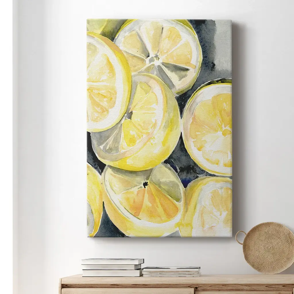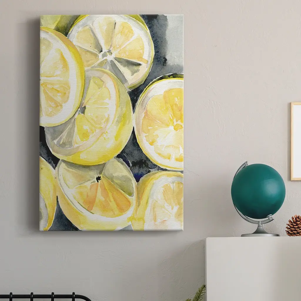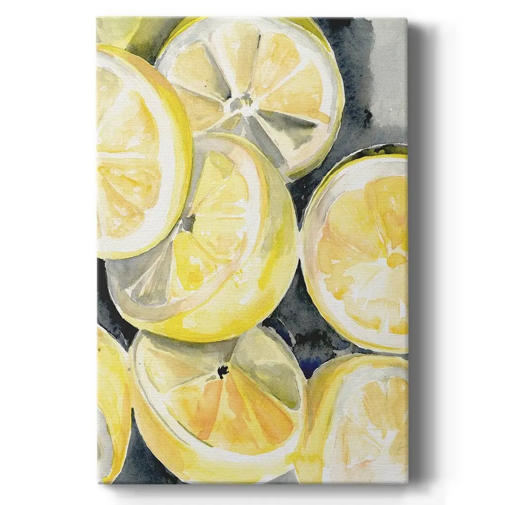 Lemon Slices I Premium Gallery Wrapped Canvas - Ready to Hang A premium hand stretched gallery wrapped canvas print created to last. Featuring a beveled a solid wood stretcher bar, each piece comes ready to hand 6 SIZES AVAILABLE 8''X12'' - Overall Size 12''X18'' - Overall Size 18''X27'' - Overall Size 24''x36'' - Overall Size 32''x48'' - Overall Size 40''x60'' - Overall Size Each piece is made to order. Built to Last Each piece comes ready to hang Solid wood stretcher Fade and Water resistant Made domestically