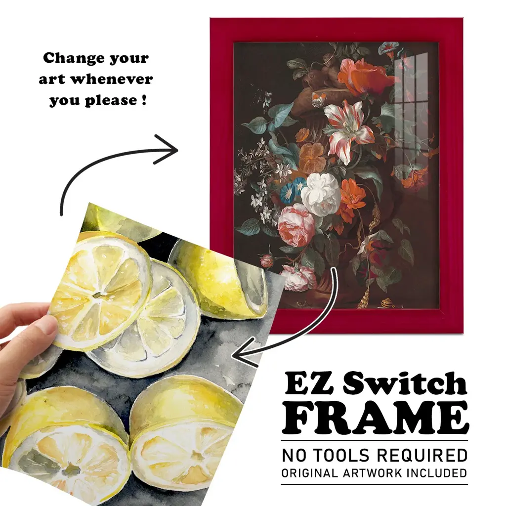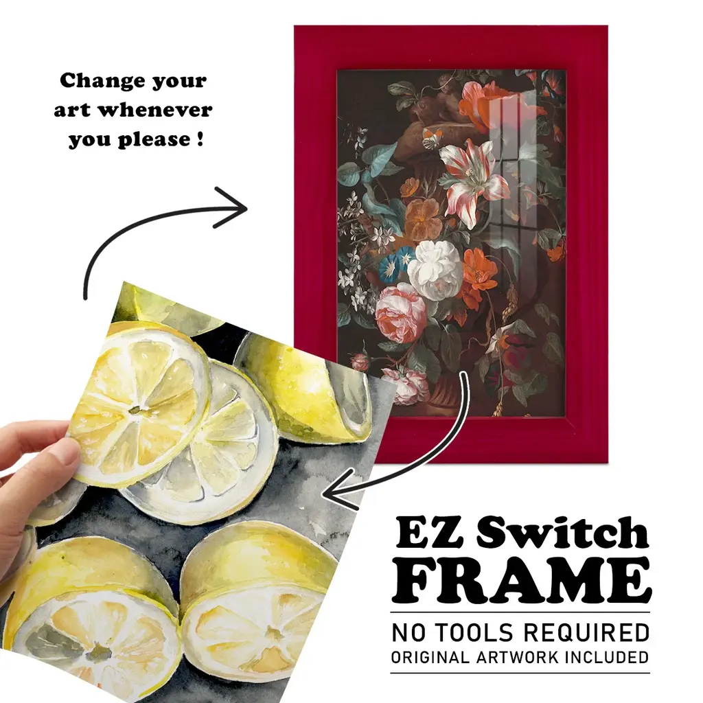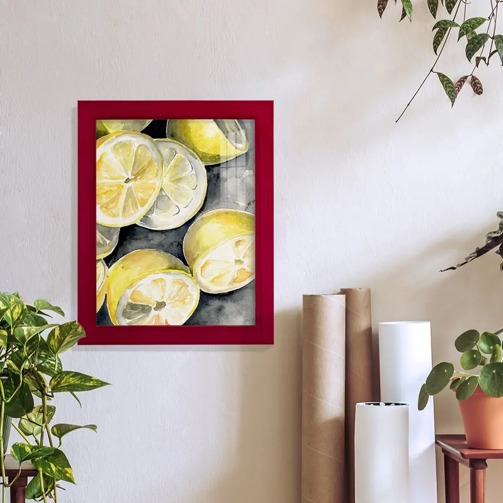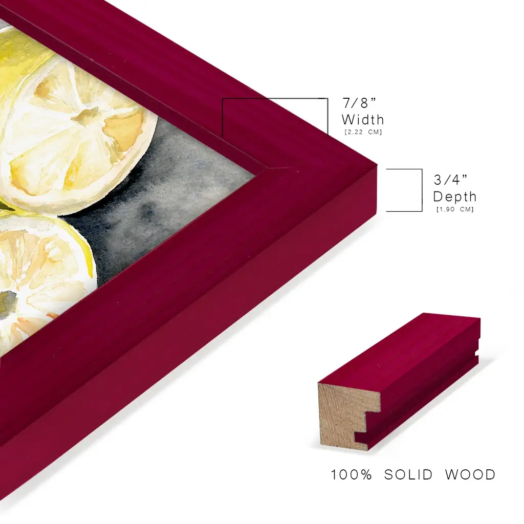 Lemon Slices II -EZ SWITCH Framed Print w/glass-Cherry Red A delightful, framed print. Featuring a solid wood frame with real wood glass. This premium print is giclee quality. In addition, every frame features a removable back and table top stand. This allows you to change your art in the future or to just stand the art on a table for a new look. We are sure you'll enjoy our new series of EZ SWITCH Framed Art. Solid Wood Frame Real Glass Removable / Replaceable Art Built in Tabletop Stand Sizes range from 4x6 up to 12x15 - buy just one or pair them up as sets as you see fit.