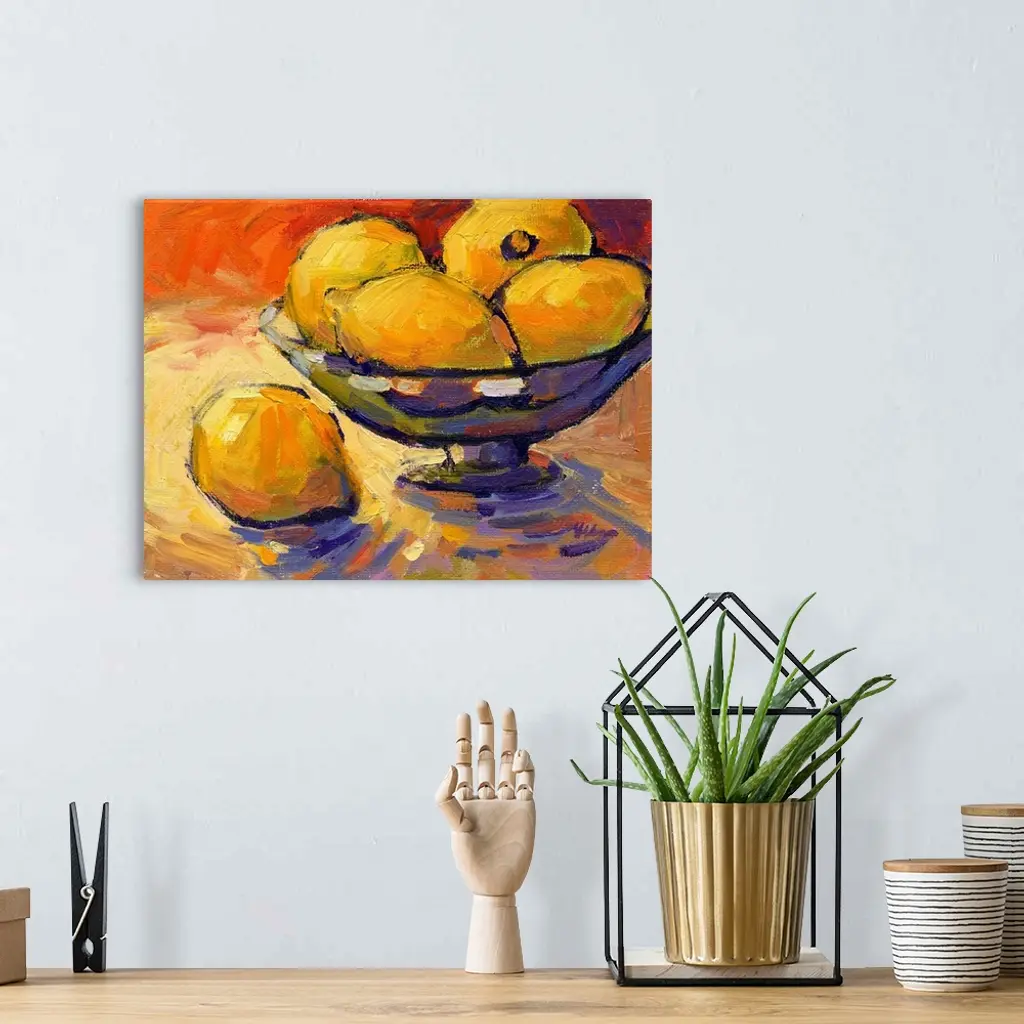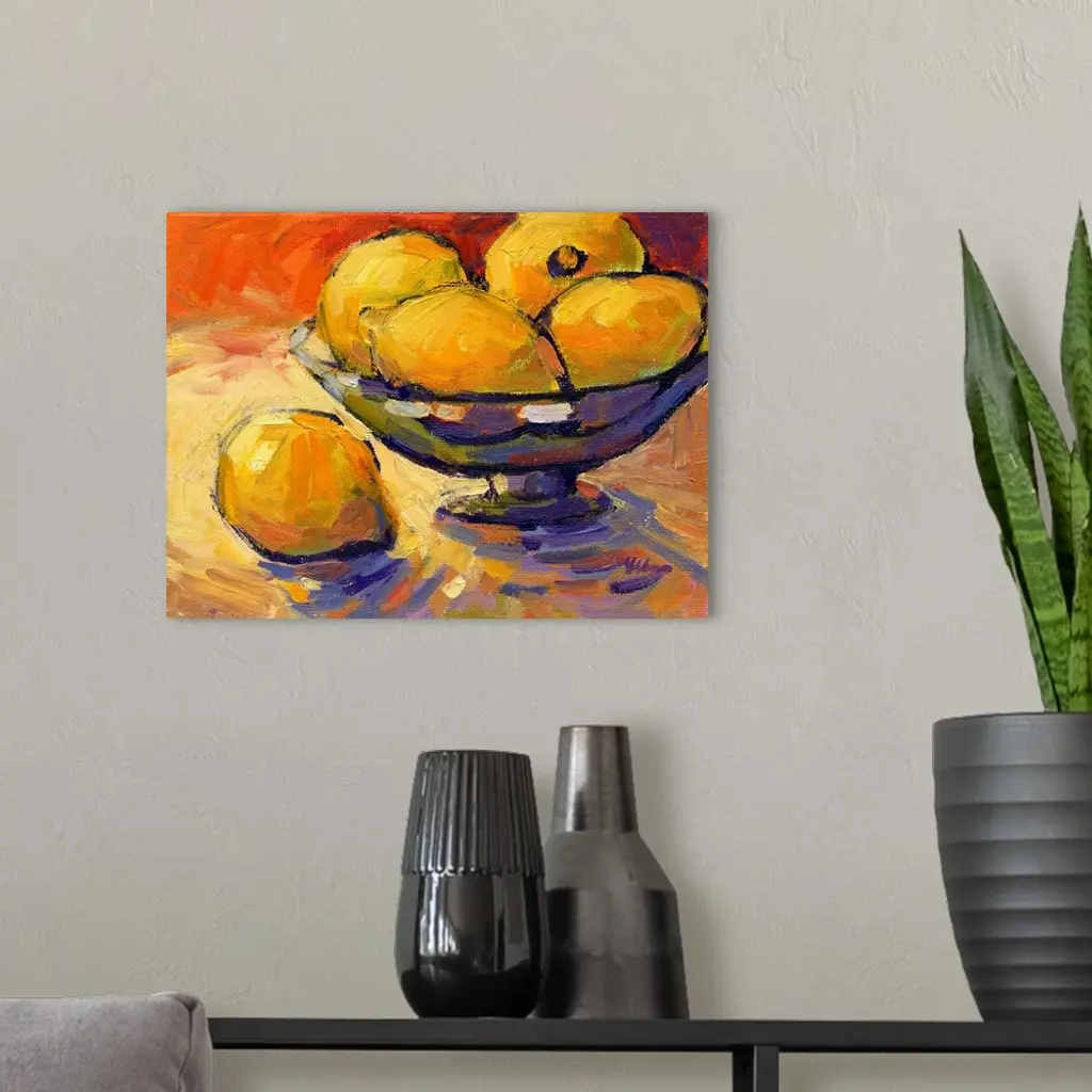 A contemporary abstract painting of a bowl of lemons against a red background.