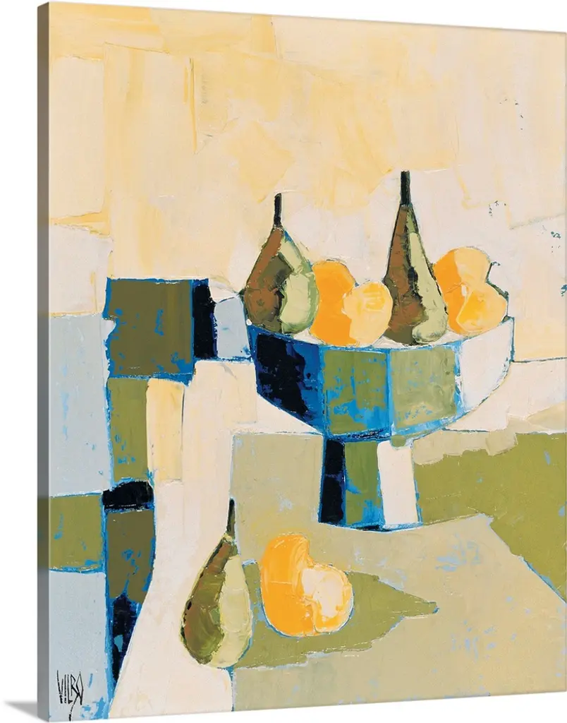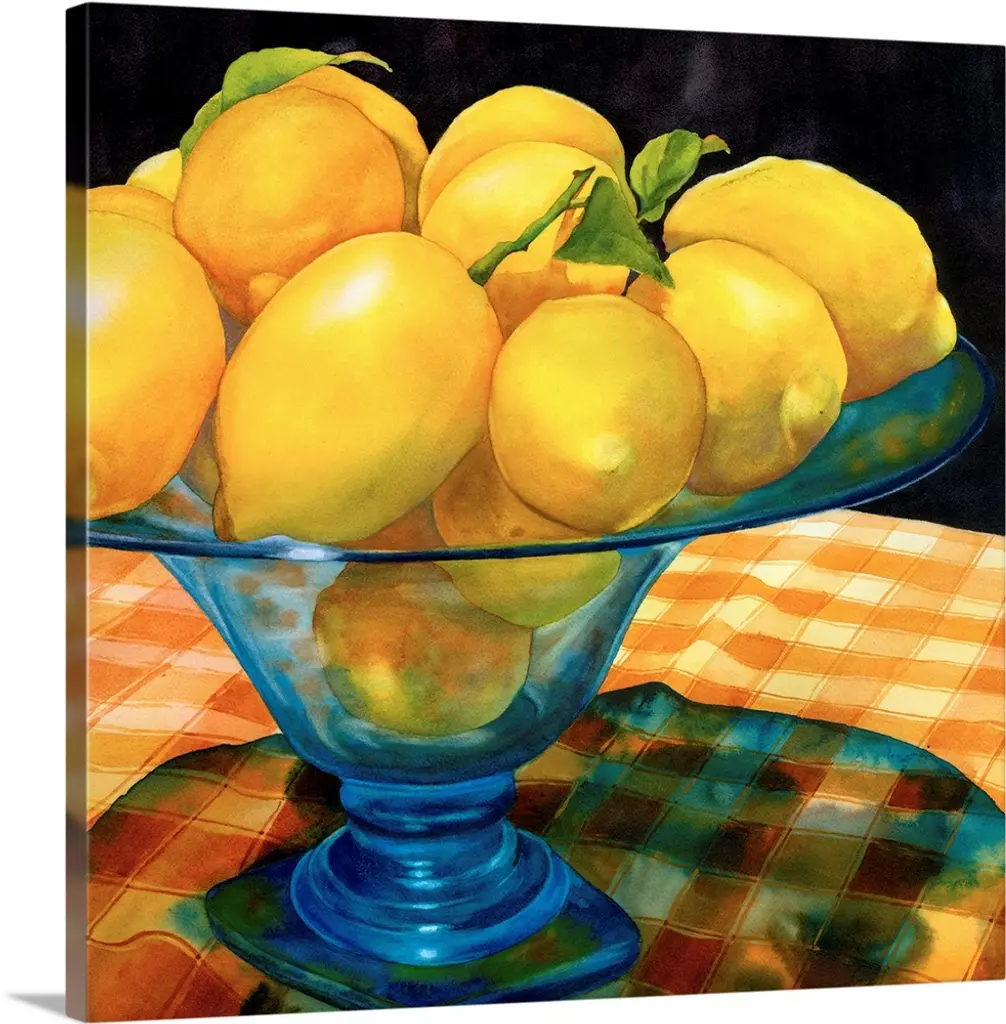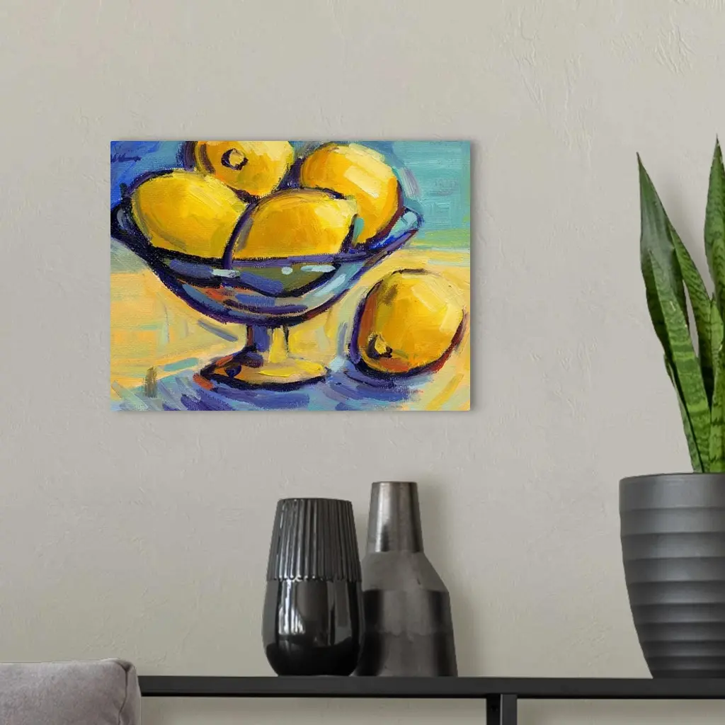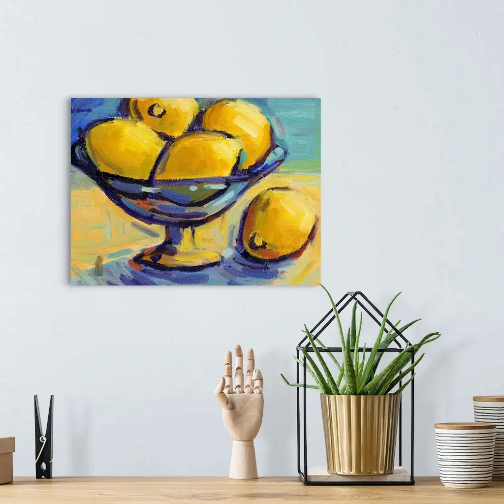 A contemporary abstract painting of a bowl of lemons against a blue background.