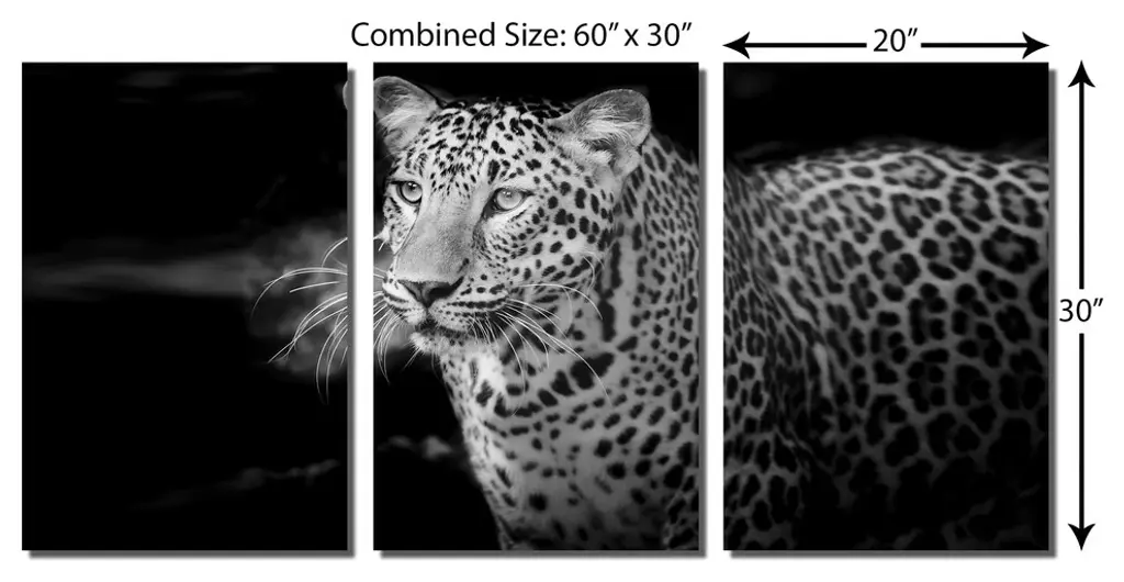 60"œ x 30"œ total size. Ready To Hang! (3 pieces - 20"œ x 30"œ each). 3 Panel Split (Triptych) Leopard B&W Portrait Metal Print. Modern metal wall art for home or office wall decor & interior design. Printed on Luxurious, HD aluminum glossy metal panels. Multi panel art.. HD aluminum panels. Metal print wall art. Includes Shadow Wall Mount on the back.• Aluminum Metal Wall Art• Made in USA• Ready to hang - No assembly required• Shadow mount hardware on the back• 0.045"œ thick HD Aluminum Panels• Scratch resistant, glossy finish• Superb color clarity, luxurious prints• Epson printing process• For indoor or moisture rich environment use• Easy to clean. Gently wipe with microfiber cloth.