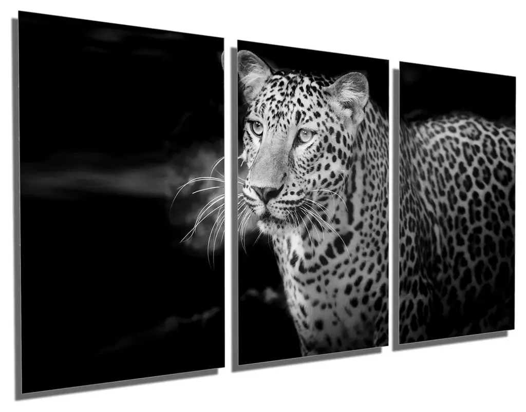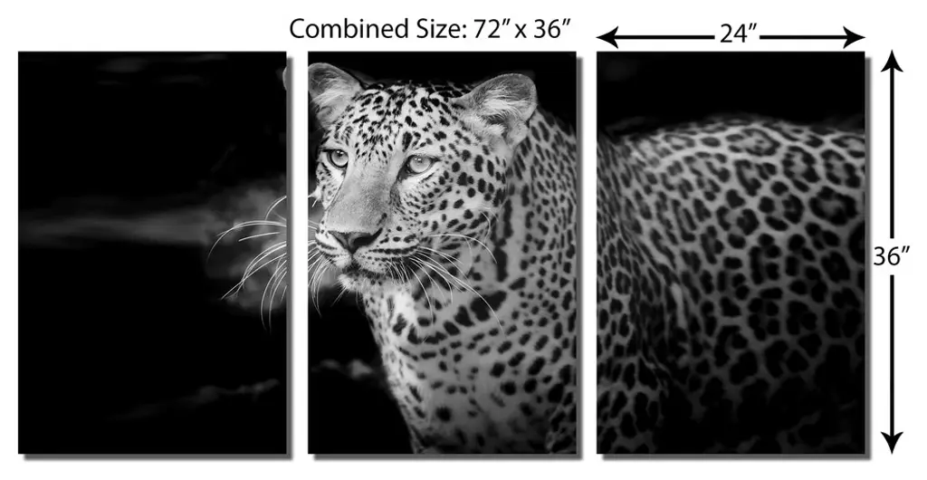 72"œ x 36"œ total size. Ready To Hang! (3 pieces - 24"œ x 36"œ each). 3 Panel Split (Triptych) Leopard B&W Portrait Metal Print. Modern metal wall art for home or office wall decor & interior design. Printed on Luxurious, HD aluminum glossy metal panels. Multi panel art.. HD aluminum panels. Metal print wall art. Includes Shadow Wall Mount on the back.• Aluminum Metal Wall Art• Made in USA• Ready to hang - No assembly required• Shadow mount hardware on the back• 0.045"œ thick HD Aluminum Panels• Scratch resistant, glossy finish• Superb color clarity, luxurious prints• Epson printing process• For indoor or moisture rich environment use• Easy to clean. Gently wipe with microfiber cloth.