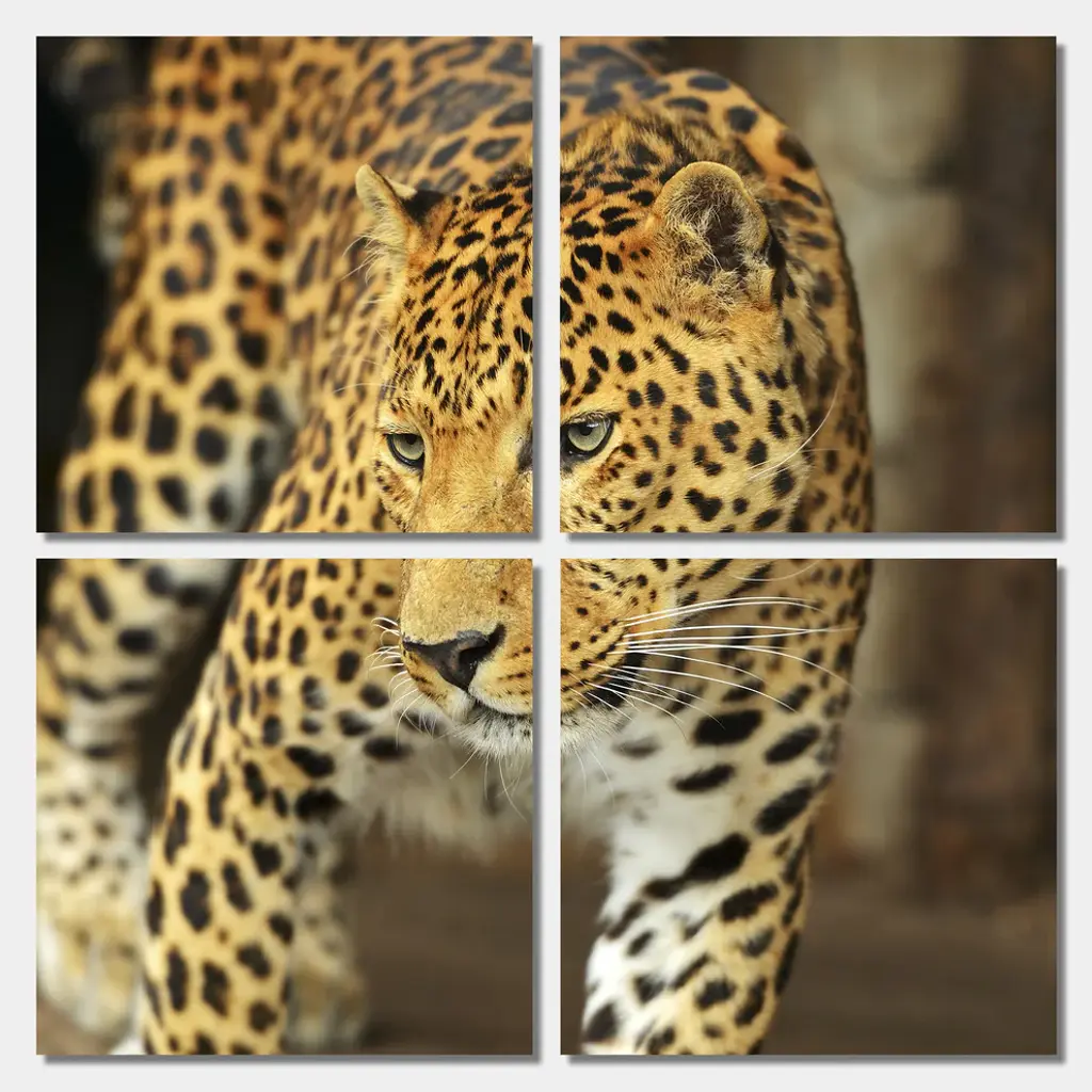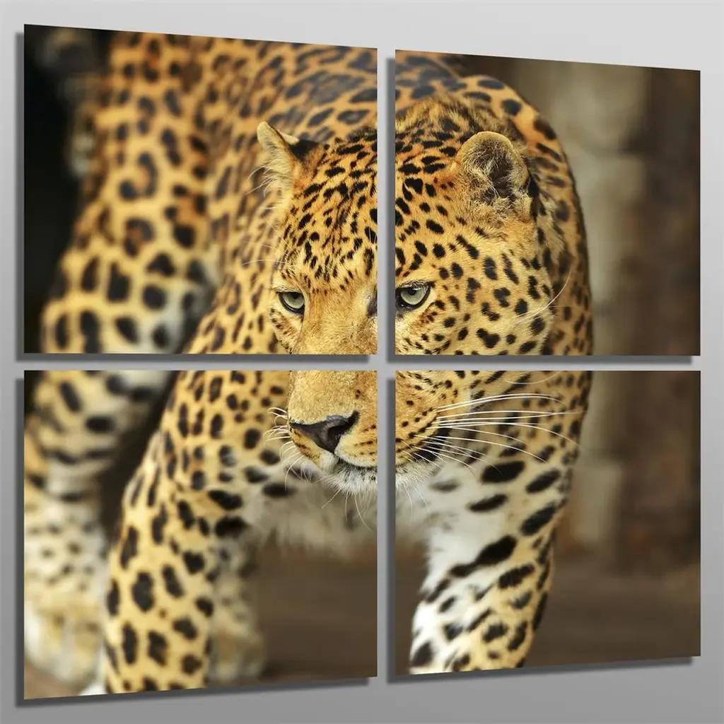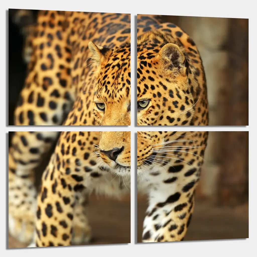 40"œ x 40"œ total size. Ready To Hang! (4 pieces - 20"œ x 20"œ each). 4 Panel Split (Quad) Metal Print of Leopard, Wildlife close-up photography. Modern metal wall art for home or office wall decor & interior design. Printed on Luxurious, HD aluminum glossy metal panels. Multi panel art.. HD aluminum panels. Metal print wall art. Includes Shadow Wall Mount on the back.• Aluminum Metal Wall Art• Made in USA• Ready to hang - No assembly required• Shadow mount hardware on the back• 0.045"œ thick HD Aluminum Panels• Scratch resistant, glossy finish• Superb color clarity, luxurious prints• Epson printing process• For indoor or moisture rich environment use• Easy to clean. Gently wipe with microfiber cloth.