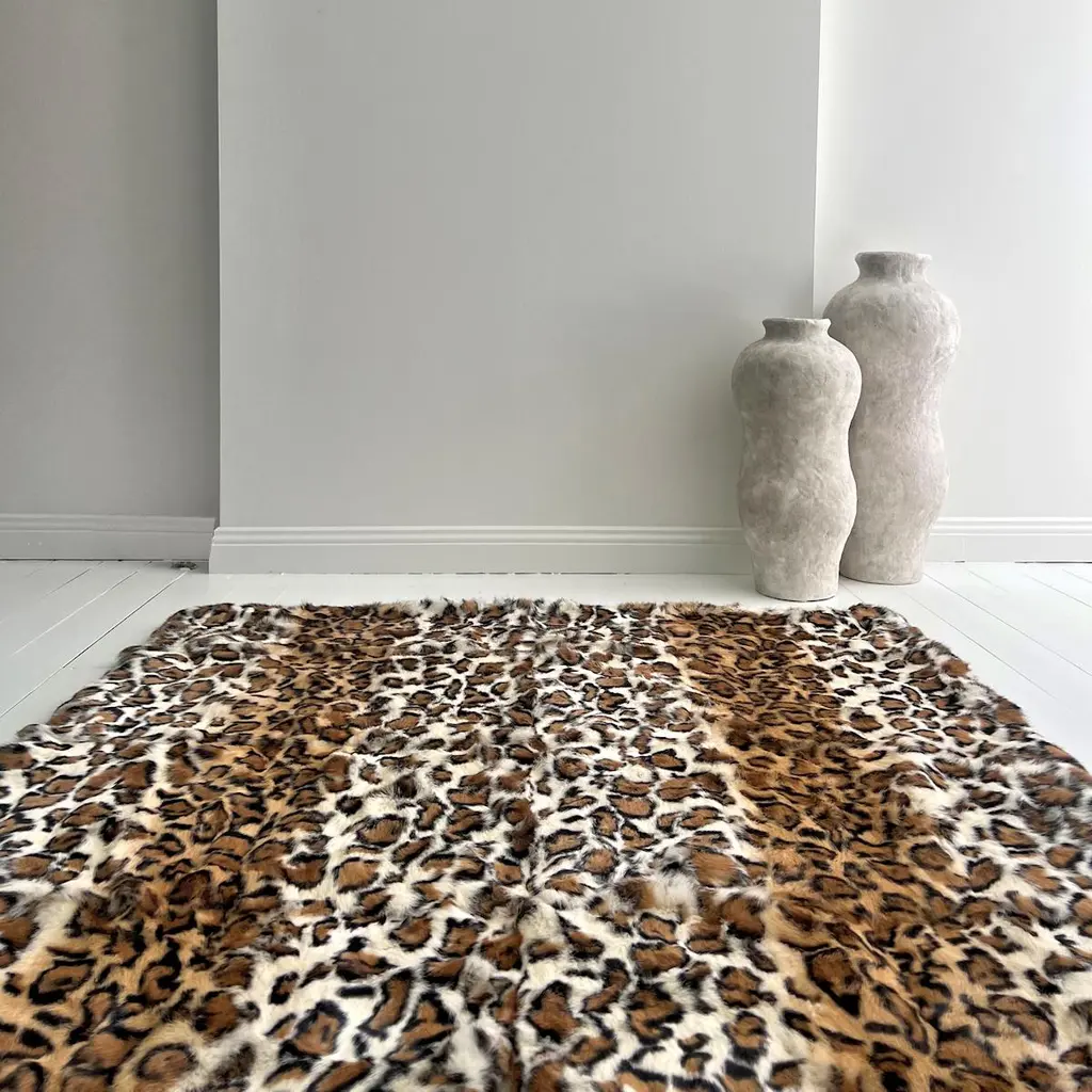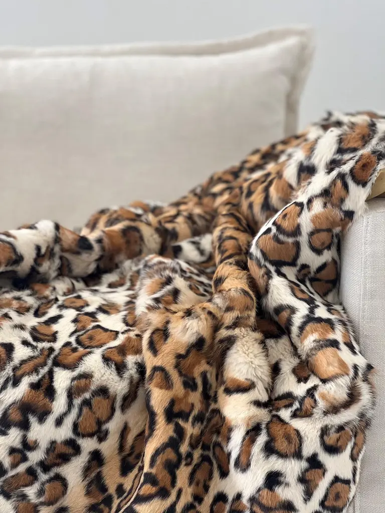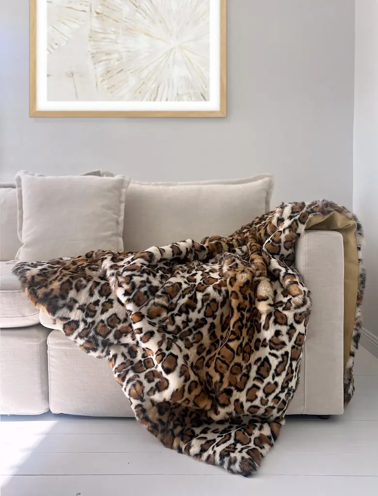Indulge in the ultimate expression of warmth, style, and opulence with the Leopard Tiger Print Blanket — a statement piece that transforms any space into a haven of sophisticated and timeless elegance.Crafted from high-grade rabbit fur, this blanket offers an irresistible buttery softness that feels like a gentle embrace. The natural fur is ethically sourced and carefully selected for its plush density and elegant texture, ensuring that every touch delivers an experience of pure indulgence.What sets this tiger blanket apart is its artfully stenciled leopard print overlay, meticulously designed in warm brown and golden hues. This pattern radiates a sense of refined wildness, effortlessly combining exotic charm with timeless elegance. Each leopard print blanket is uniquely patterned with a custom-made option for larger sizes to suit any bed blanket size, making yours a one-of-a-kind.The reverse side features a rich gold velvet backing, adding another layer of luxury. This lush velvet not only enhances warmth and comfort but also provides a regal contrast; whether draped over a sofa, folded at the end of your bed, or elegantly tossed across a lounge chair.In any room, the Leopard print blanket becomes an instant focal point. The golden tones and animal print motif add texture, warmth, and visual intrigue, making minimalist interiors feel layered and intentional, while complementing bold, maximalist spaces with an extra touch of glamour. Whether your home leans modern, classic, or eclectic, this piece elevates the ambiance with ease.This leopard print blanket is a timeless investment crafted for quality and style — a piece you'll cherish for years. A fur leopard blanket is not just a blanket, it is an experience of comfort, luxury, and inner wild style.Features:Designed by Emily Barbara for eluxury homeThrow Blanket Dimensions: 120x180cm 4x5ftHandcrafted from high-grade rabbit furLeopard print overlayCan be custom-made to any size.Designed by Emily BarbaraComes with its own care / storage bagUpper: Rabbit FurLining: Polyester/cotton/SpandexProduction Time:Each fur blanket is a custom made to order. Please allow 4 to 6 weeks for production.Caring for this productSpot clean only with lukewarm water and gentle detergent.Do not wash, Professional dry clean onlyKeep away from direct heatkeep away from direct sunlight to prevent color fadingshake outside and allow to air in shadeLoose fur fibers may be found caused by productionNatural product:This is a natural product. Variation in print, color tone, texture, pile, are all classified natural characteristics.