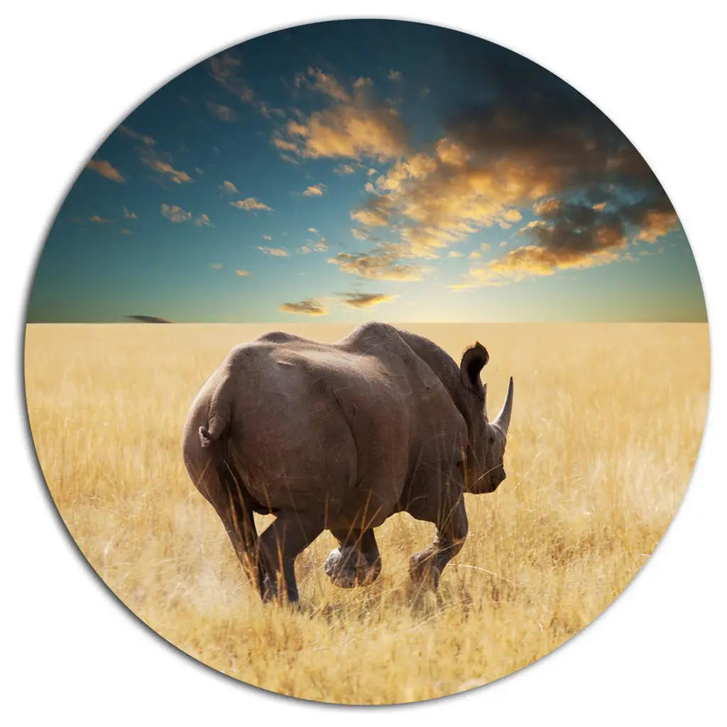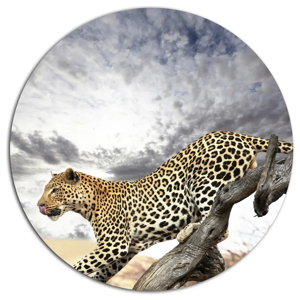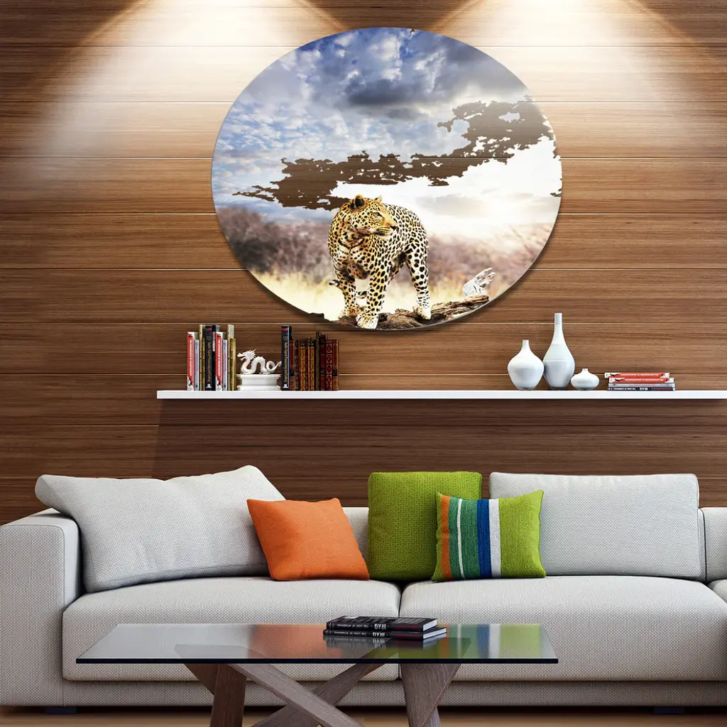 Bring Contemporary Abstraction to your home with this large Circle Metal wall art. This Leopard Walking under Cloudy Sky Metal Artwork makes it the focal point of any room or office. - White Gloss Coating ensures colors are extra vibrant with light reflection.- Aluminum grade Sheet Metal with 1 inch mounting frame on the back giving the illusion that the artwork is floating on the wall..- Mounting Brackets are included along with instructions.- High Quality Digital images are created directly into a glossy aluminum panel producing a stunning and captivating print into the glossy finish of the metal.- Water, Fire and Scratch resistant HD Aluminum panels.- Looks better than any photo paper and guaranteed to last at least 20 years- Easy to clean with a microfiber cloth. Colors are far superior to regular Canvas Art. - Easy to Hang