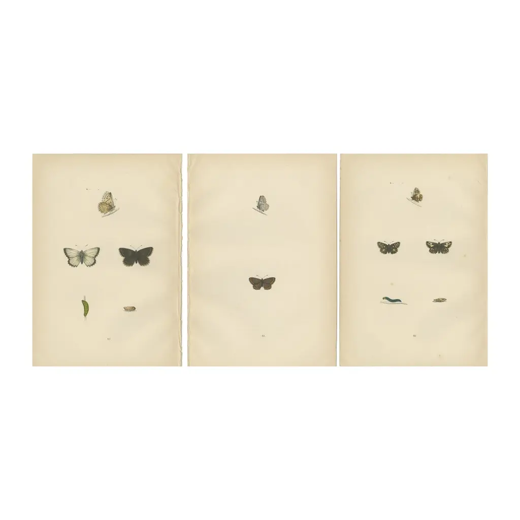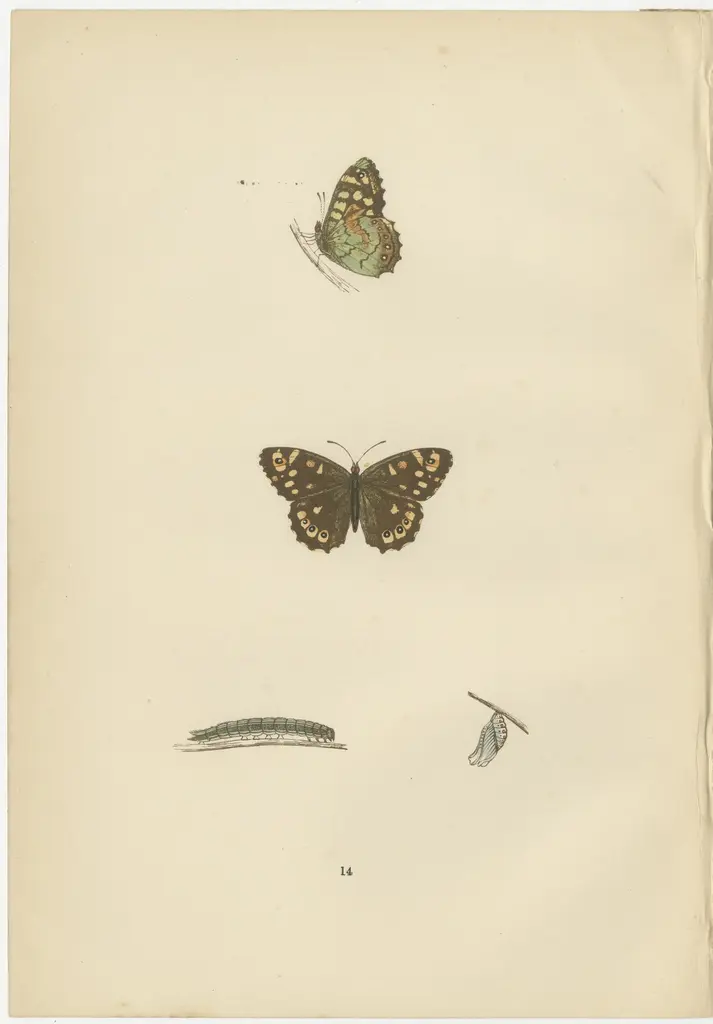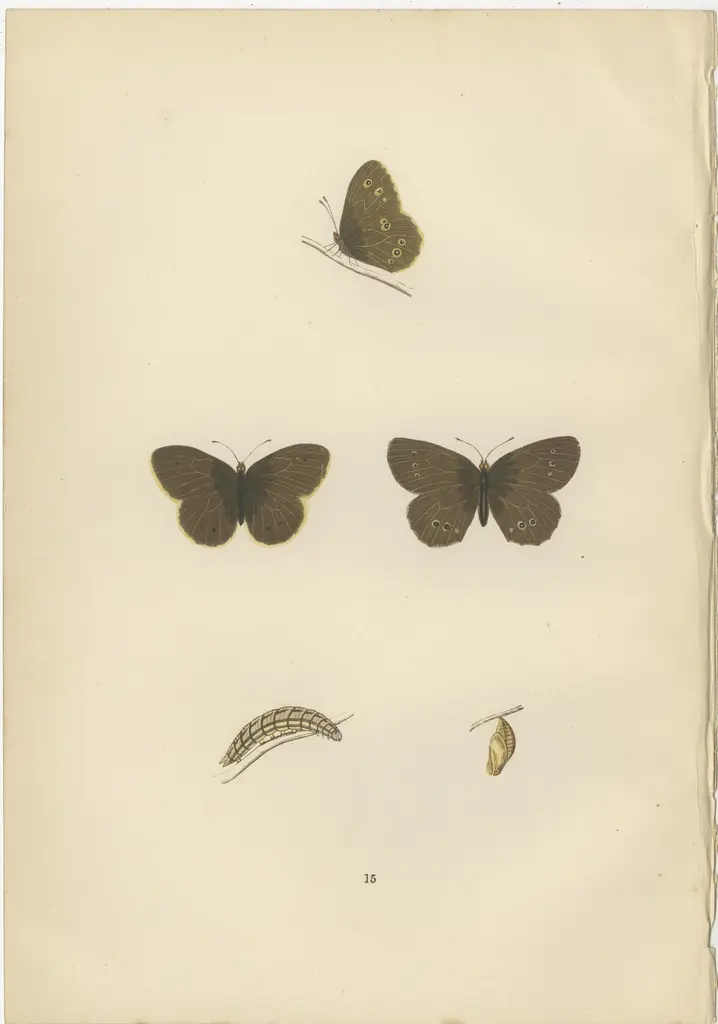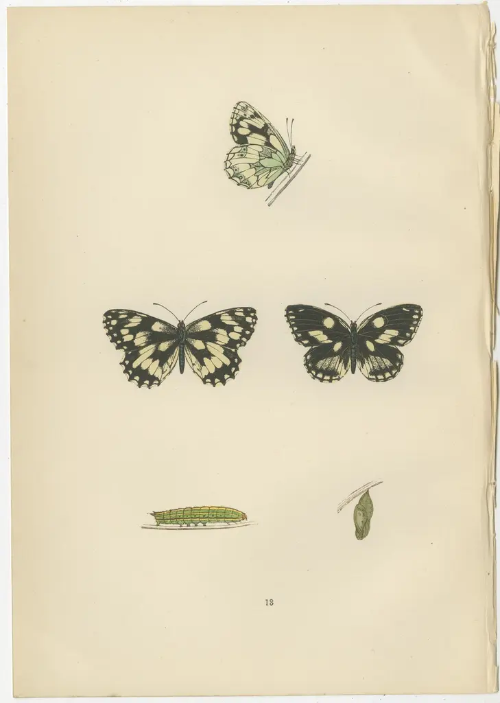 The images depict the life stages of three British butterfly species:1. Marbled White (Melanargia galathea): The Marbled White is known for its distinct checkerboard pattern on its wings, combining stark white with dark patches. It's particularly interesting because, despite its name, it's not a member of the white butterflies but rather a member of the browns, which is evident by the eyespots on the underside of its wings. The Marbled White is a grassland butterfly, and its presence is often a sign of a well-managed, unimproved grassland.2. Wood Argus (Lasiommata maera) or Large Wall Brown: Also known as the Large Wall, this butterfly is characterized by its brown wings with intricate eye-like spots. The eye spots serve as a defense mechanism to deter predators by mimicking the eyes of larger creatures. The Large Wall Brown is interesting because it’s adapted to various habitats, including woodland clearings, grassland, and even urban areas, but it has declined in recent years due to habitat loss.3. Wood Ringlet (Erebia medusa) or Small Mountain Ringlet: The Wood Ringlet is a species found in cooler climates and higher altitudes across Europe, including the British Isles. It has brown wings with small, eye-like ring markings, which can vary in number. It’s interesting because it tends to fly even in overcast and rainy weather, unlike many other butterflies, and has a very local and scattered distribution, making it a species of interest for conservation efforts due to its sensitivity to environmental changes.The sixth edition of 'A History of British Butterflies' by Morris is notable for its detailed, hand-colored plates which provide both an artistic and scientific record of these species at a time before color photography was widespread. This level of detail would have been invaluable for both amateur naturalists and professional entomologists of the era. These hand-colored plates are a beautiful example of the blend between art and science during the Victorian era, contributing to the documentation and appreciation of biodiversity.