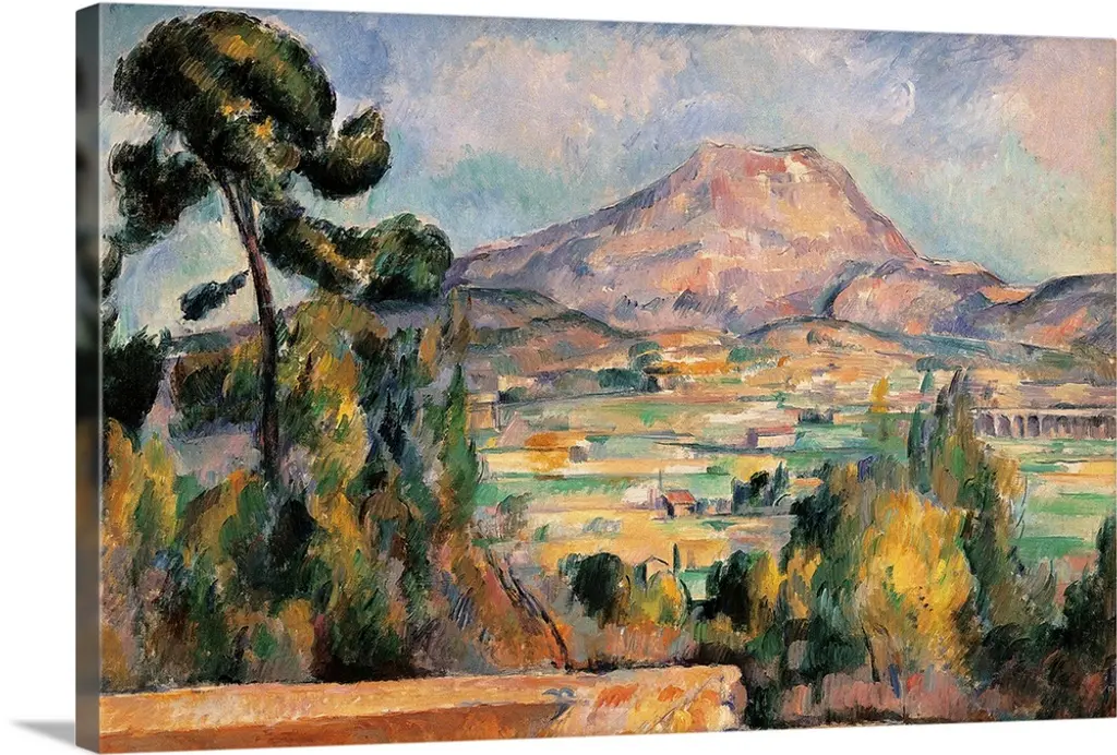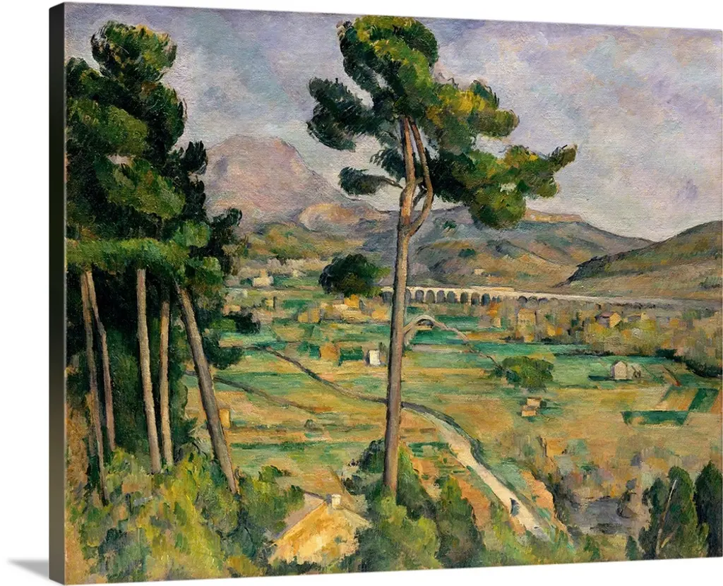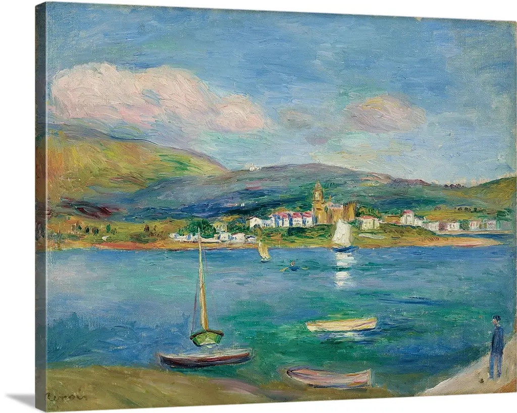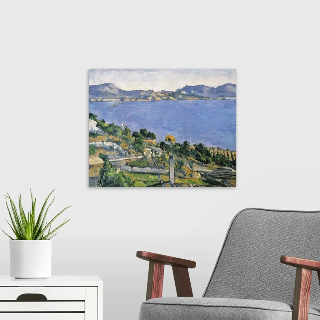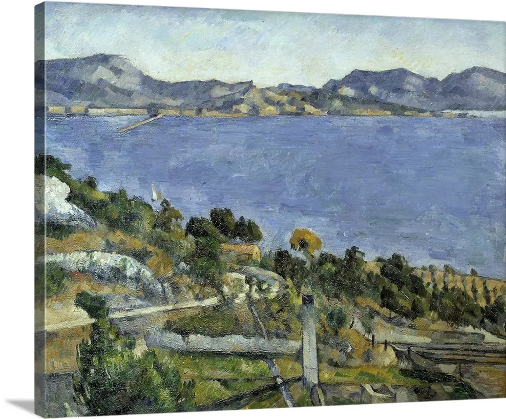 Landscape classic painting of the blue waters of the Bay of Marseilles. Trees and rocks cover the shore, and mountains can be seen on the horizon.