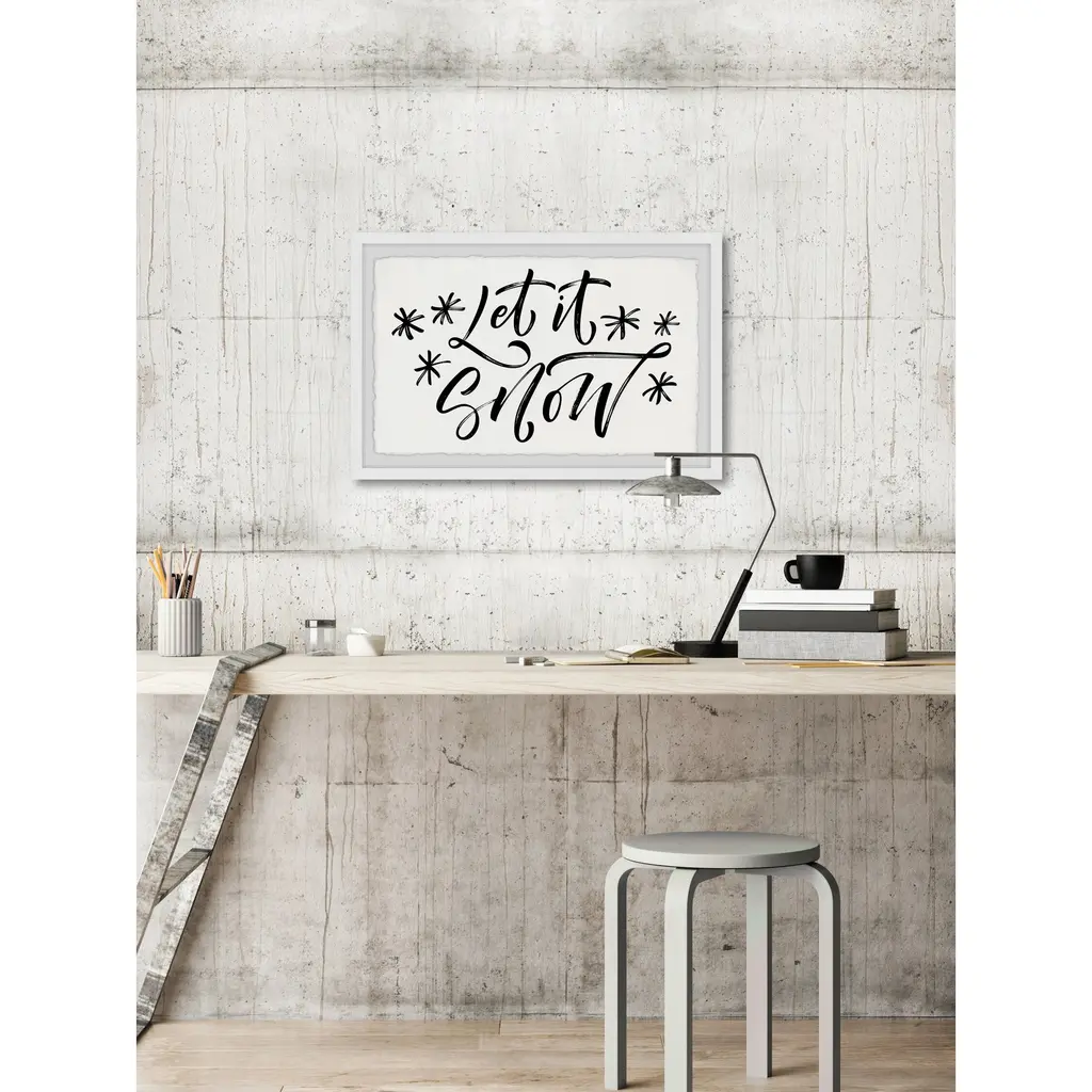 This textual art print features a white and black color scheme and cursive text that says, "Let it snow" with illustrated snowflakes all around. Proudly printed in the USA, this piece is printed on high quality archive paper and professionally hand-framed. With wall-mounting hooks included, this artful accent is ready to hang up as soon as it reaches your front door. • Top quality Giclee print on high resolution Archive Paper • Hand cut deckled edges • High quality durable non-warping frame • Finished under shatter resistant plexiglass • Arrives ready to hang • Includes a certificate of authenticity • Printed in the USA