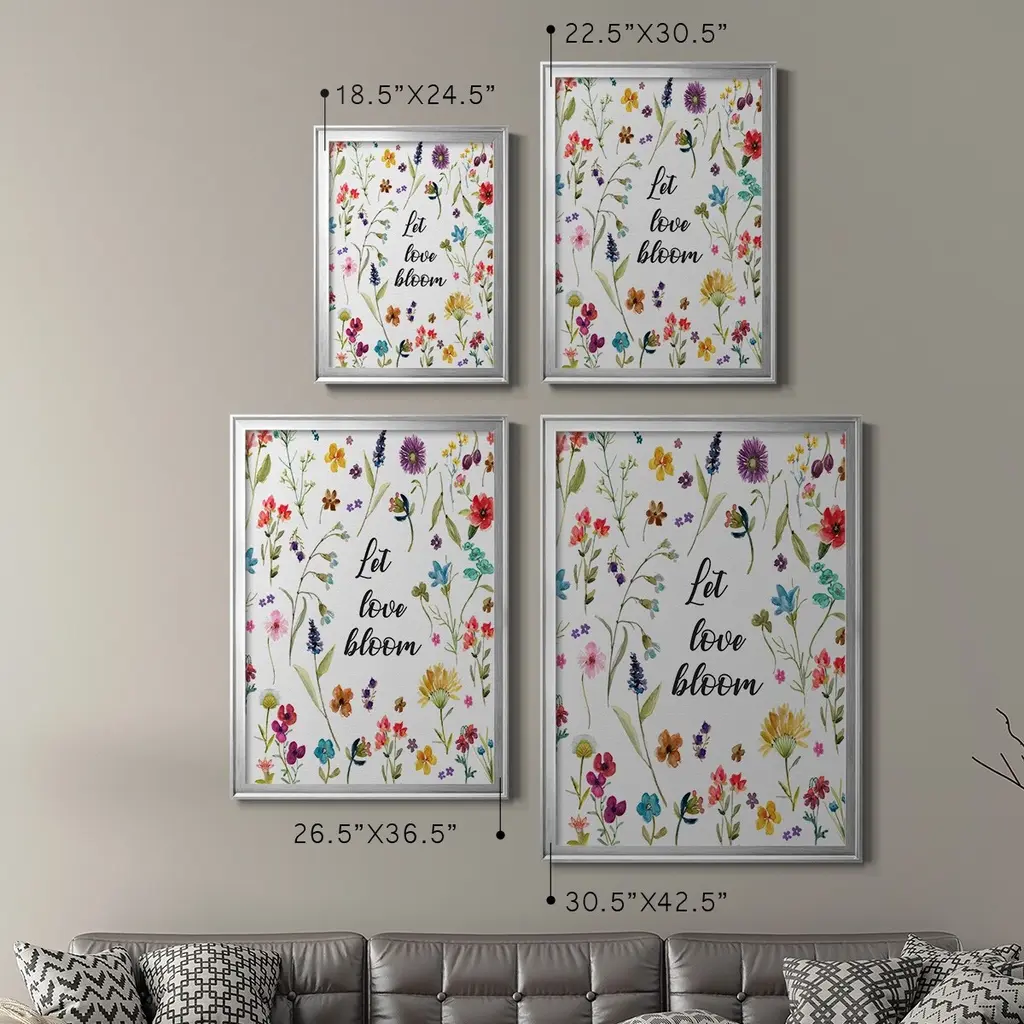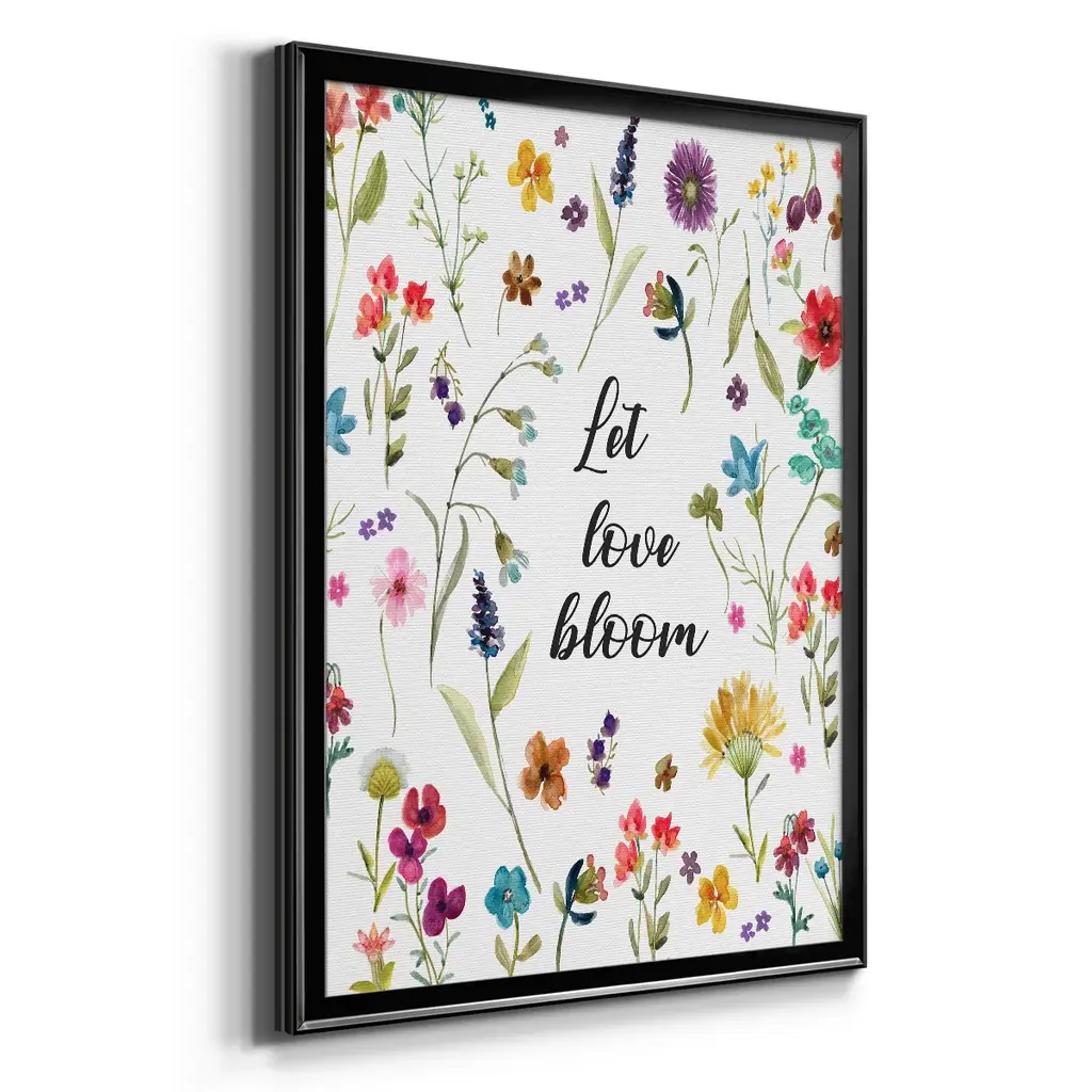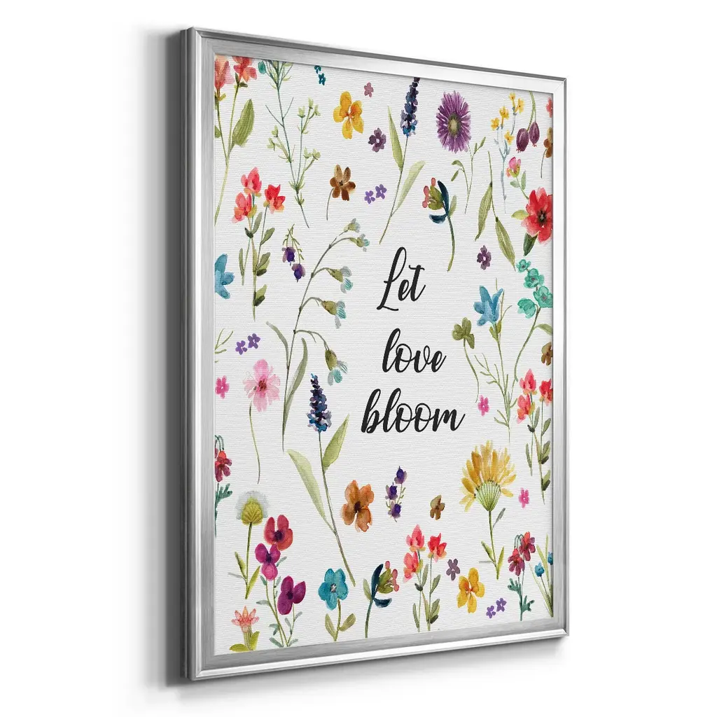 Let Love Bloom Premium Framed Print - Ready to Hang A Premium Framed Print created to last. Framed in distressed wood and available in an array of sizes and colors Featuring a beveled a solid wood stretcher bar, each piece comes ready to hand 4 SIZES AVAILABLE 30.5''X42.5'' - Overall Size 26.5'X36.5'' - Overall Size 22.5''x30.5'' - Overall Size 18.5''x24.5'' - Overall Size Each piece is made to order. Each piece comes with hanging hardware. Made in the USA Ready to Hang