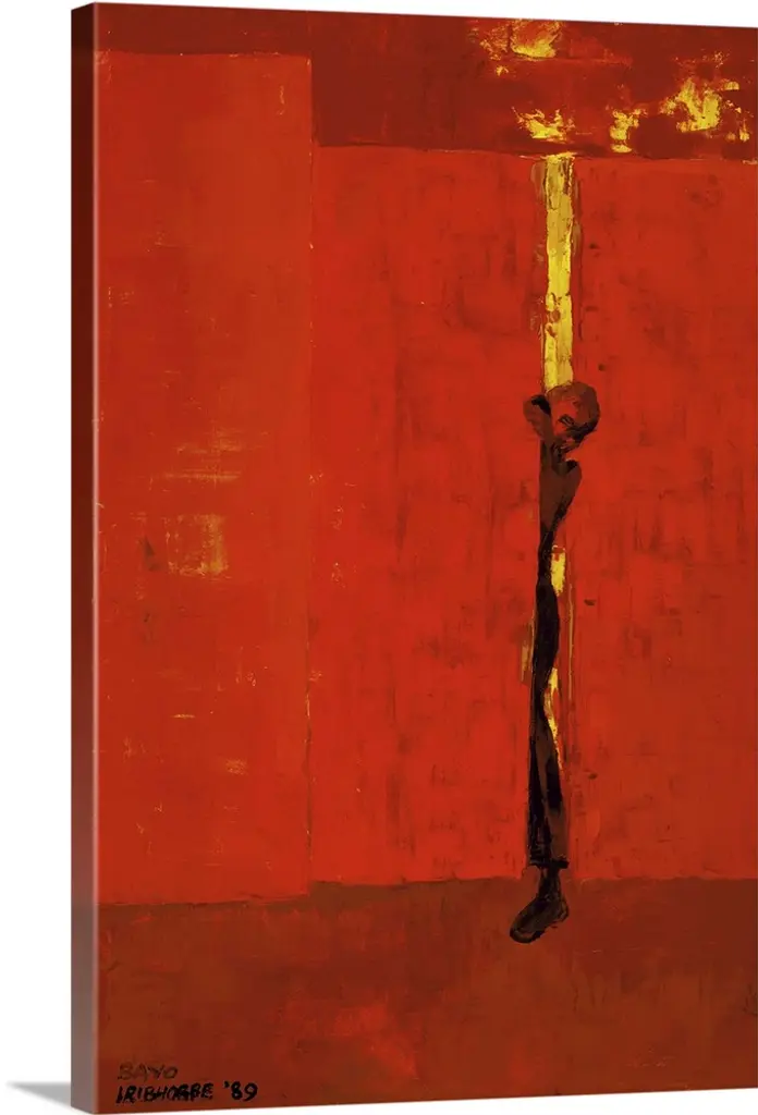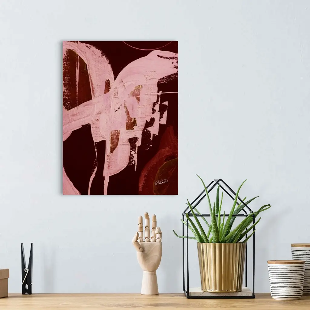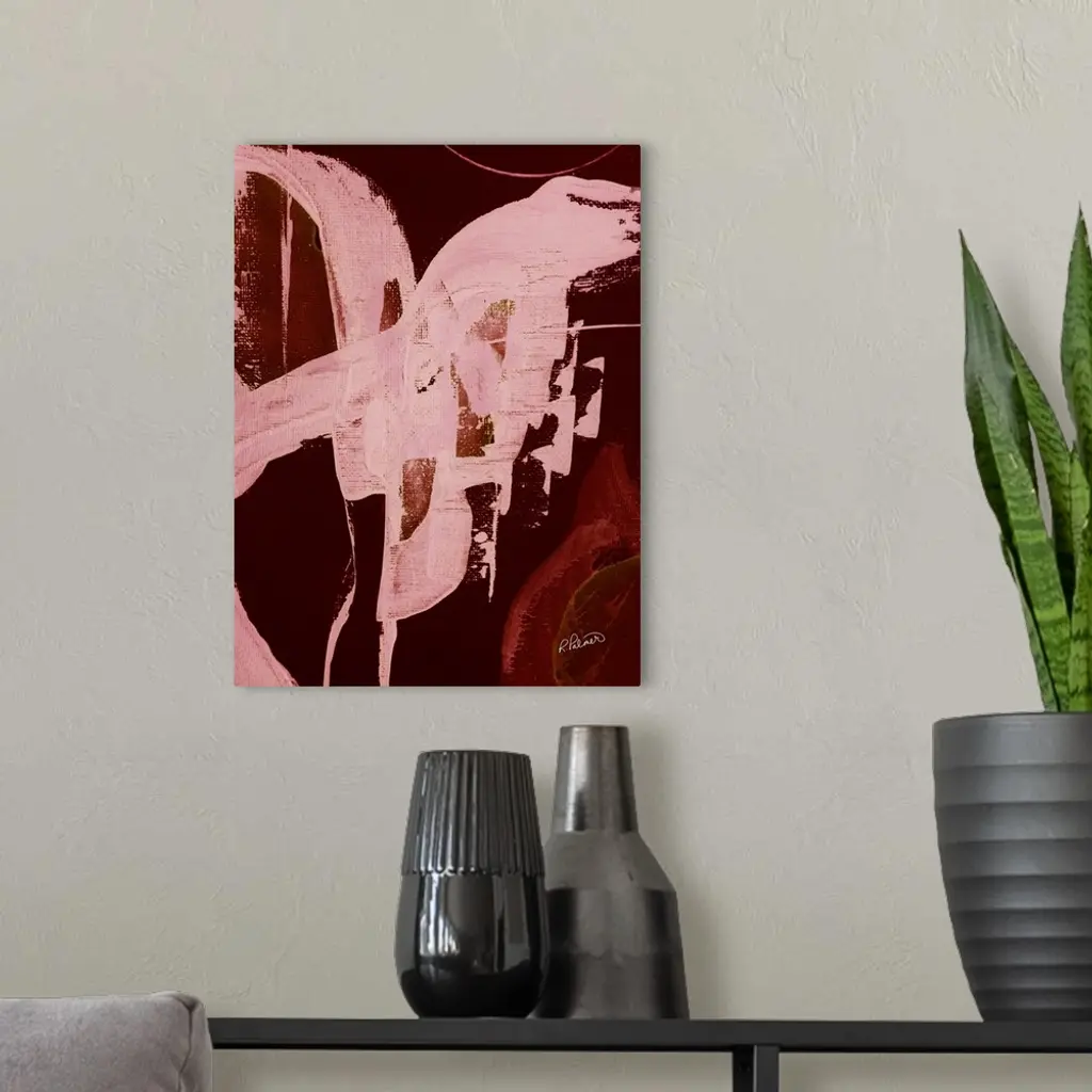 Abstract painting with a bold burnt red background and brighter pink brushstrokes on top.