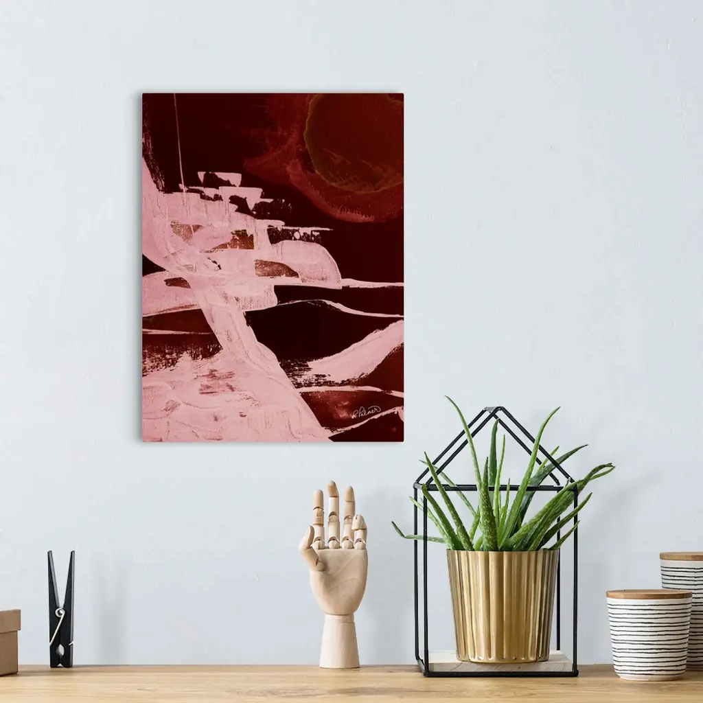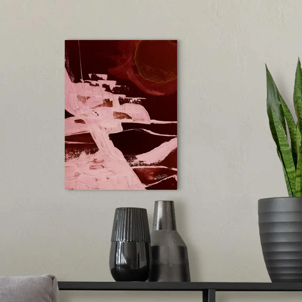Abstract painting with a bold burnt red background and brighter pink brushstrokes on top.