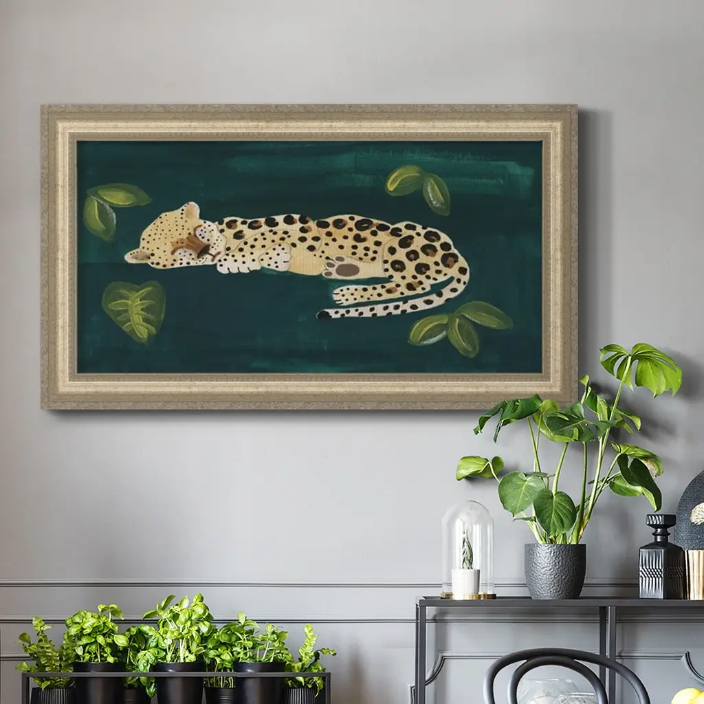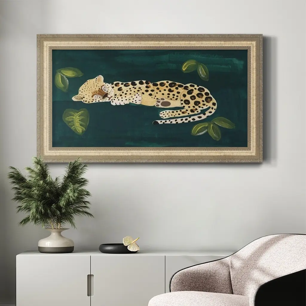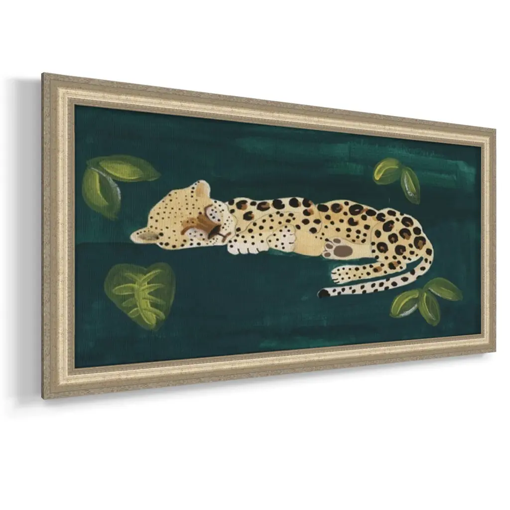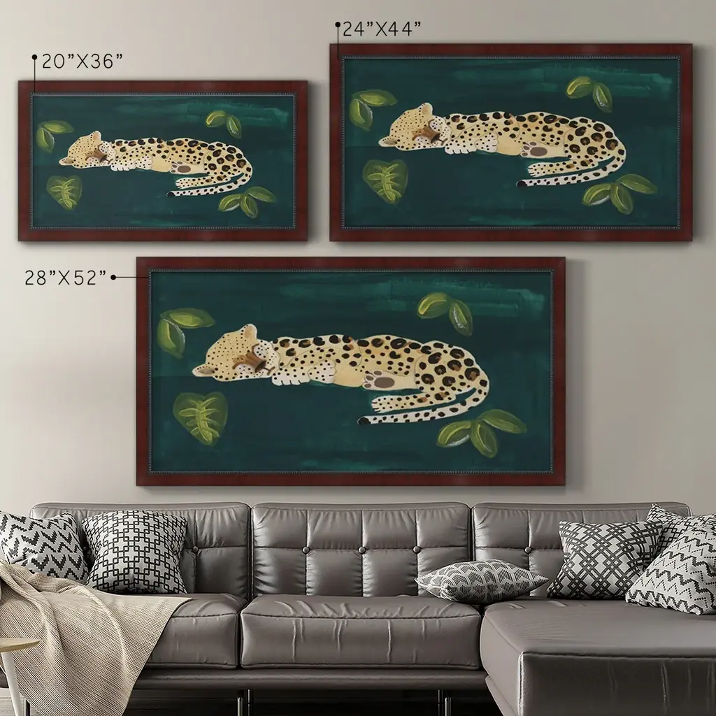 Lethargic Leopard II Premium Framed Canvas- Ready to Hang A Premium Framed Canvas created to last. Framed in distressed wood and available in an array of sizes and colors Featuring a beveled a solid wood stretcher bar, each piece comes ready to hand 3 SIZES AVAILABLE 21''X37'' - Overall Size 25''X45'' - Overall Size 29''x53'' - Overall Size Each piece is made to order. Each piece comes with hanging hardware. Made in the USA Ready to Hang Giclee Paper Print Acrylic Glass Beveled Matt Board