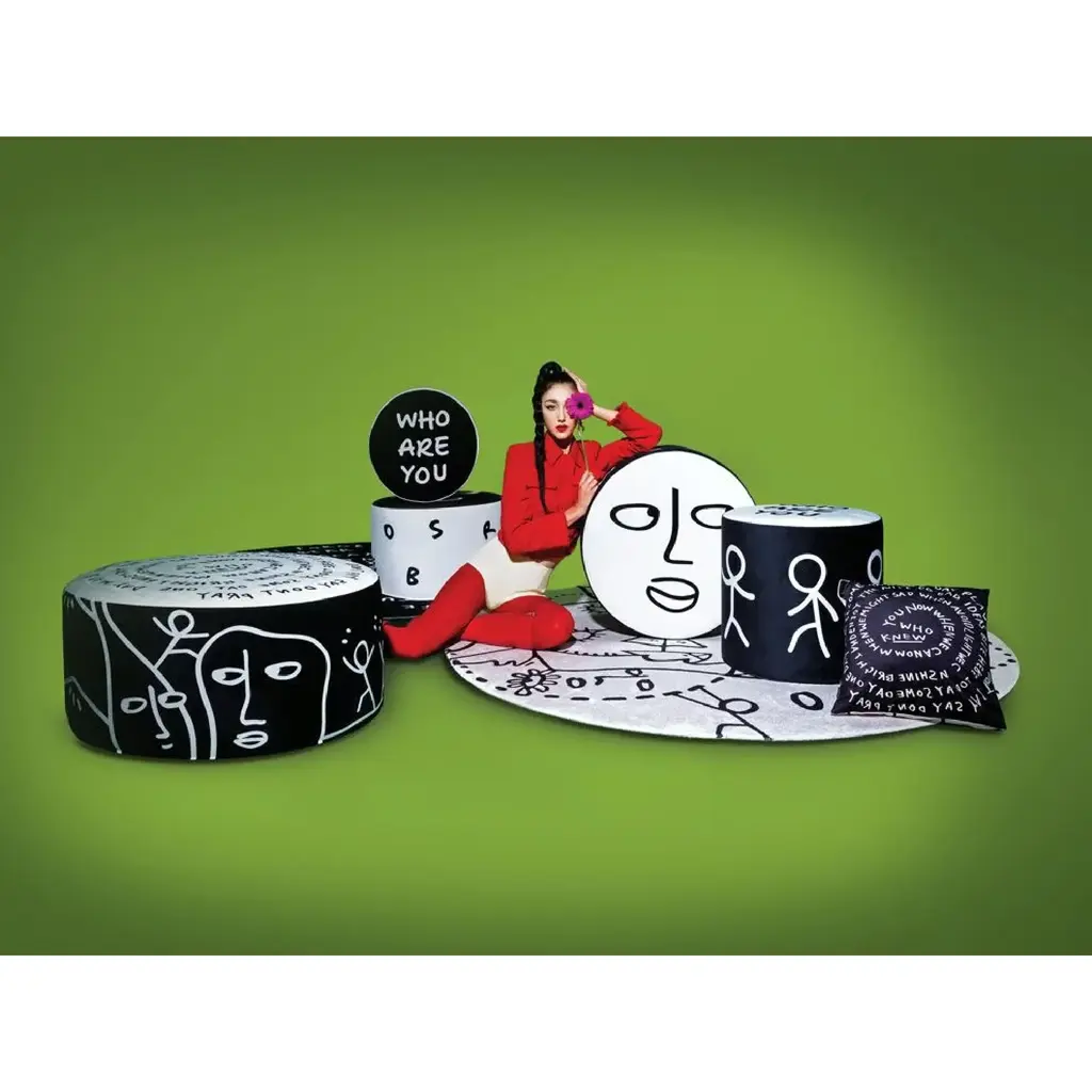 The Letter Print Round Pouf M from the Qeeboo Sunlit Linescapes collection adds a touch of elegance with its black and white lines, texts, and stylized drawings. Shantell's signature design language is beautifully displayed on this unique pouf. Sit and indulge in the aesthetic appeal of the Sunlit Story pouf.